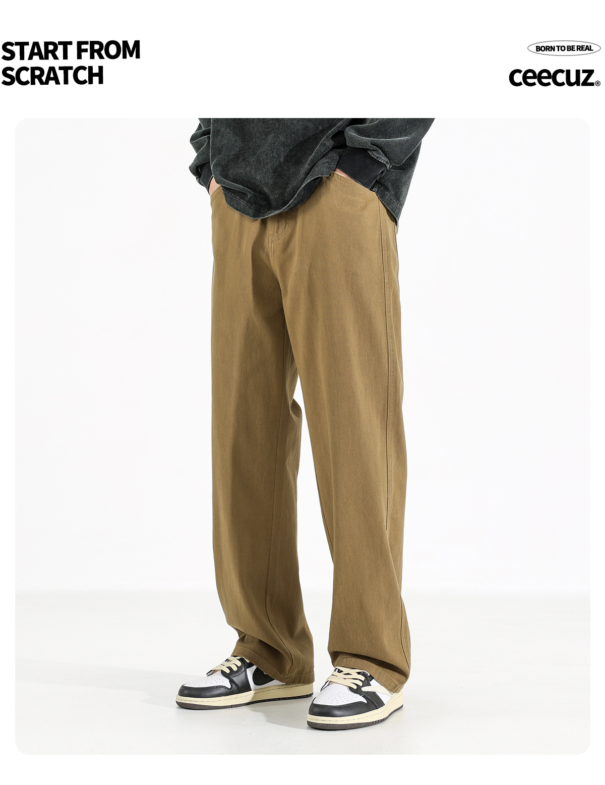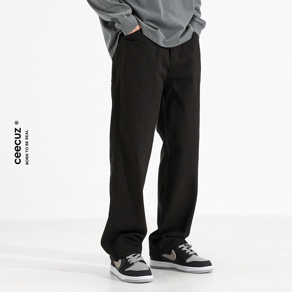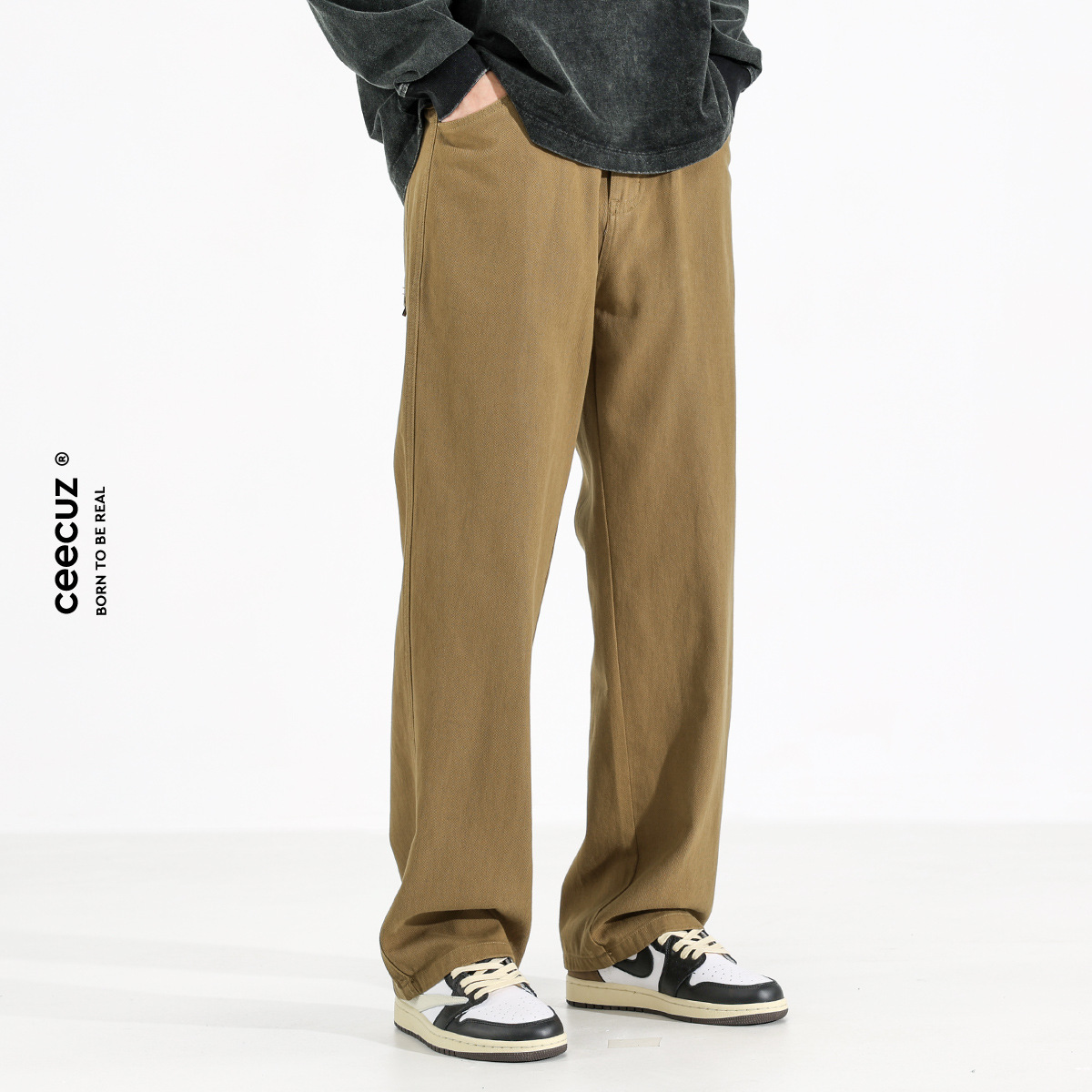 Ceecuz 무거운 무게 투약 느슨한 스트레이트 긴 바지 남성 봄과 가을 일본 스타일 빈티지 사용 작업복 캐주얼 바지
