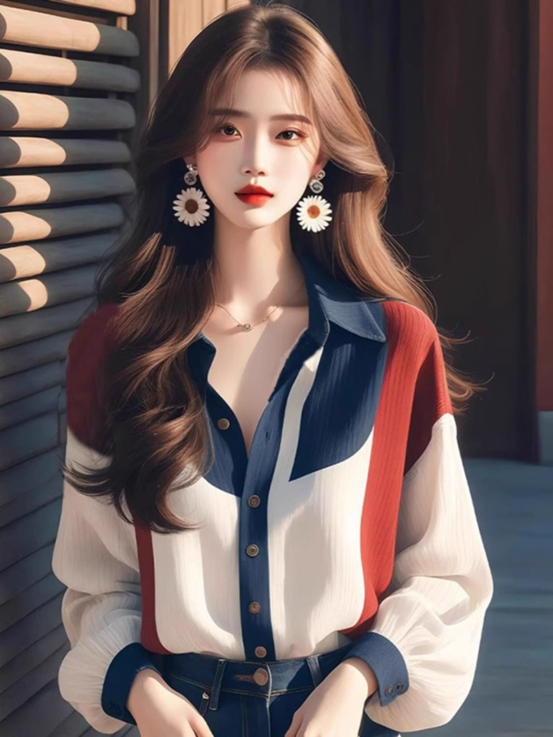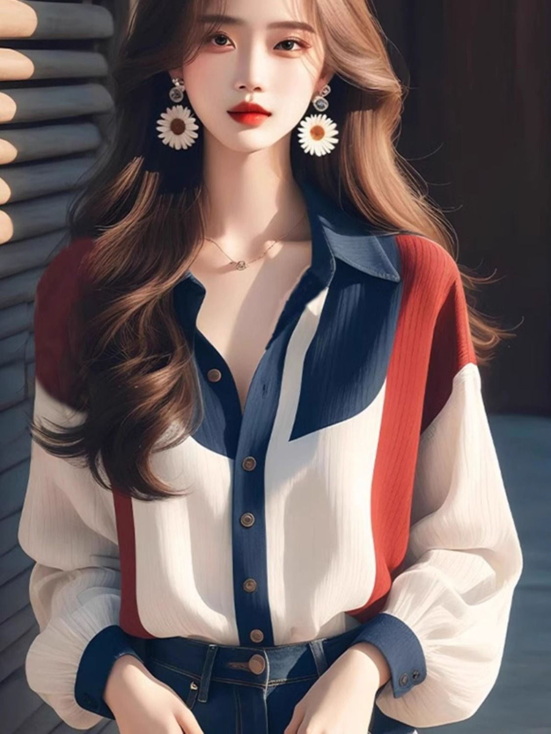 2024 년 초가을 새로운 여성 의류 차가운 스타일 하이 엔드 독특한 슈퍼 잘 보이는 느슨한 탑 컬러 대비 랜턴 소매 셔츠스토어 가기