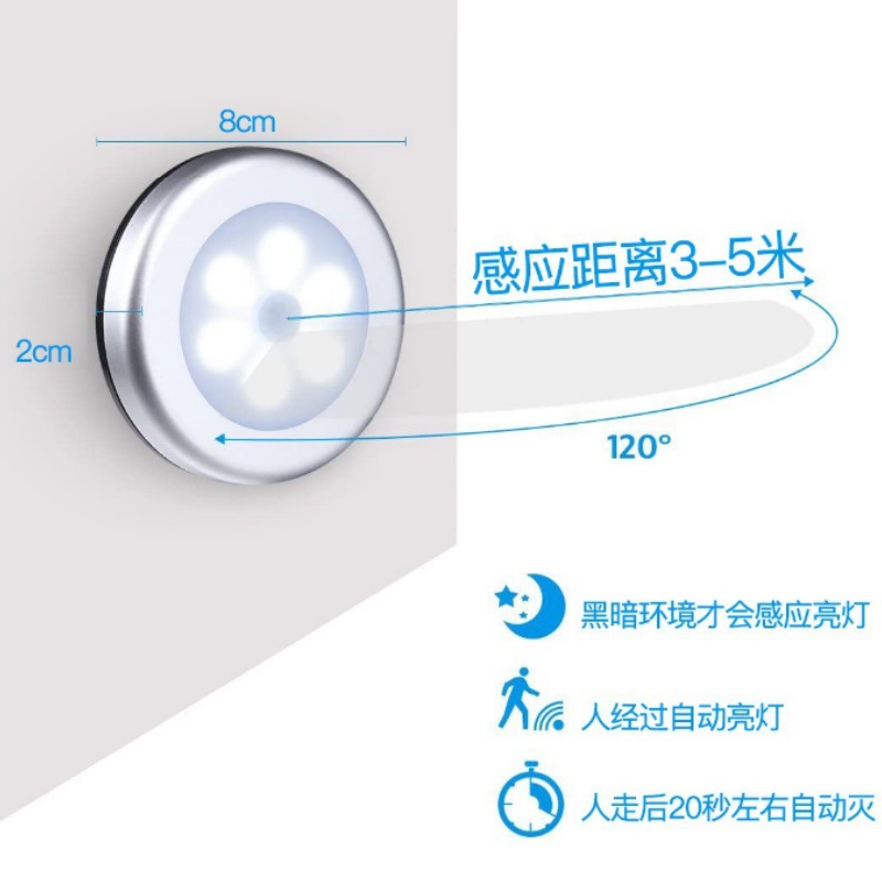 1.小圆感应灯内置PIR人体红外运动传感器及光感应器智能光感,光线足的时候,不管是否进入感应区,都不会点亮。