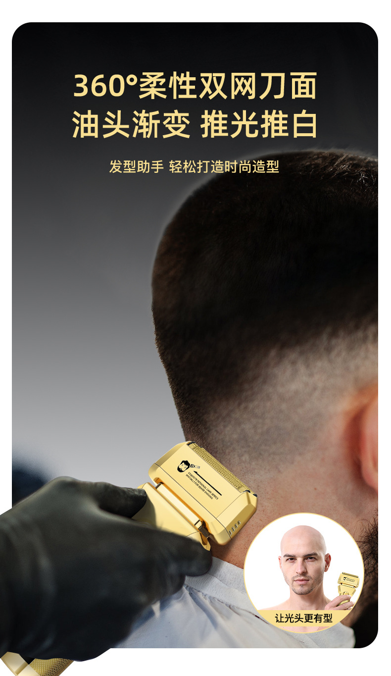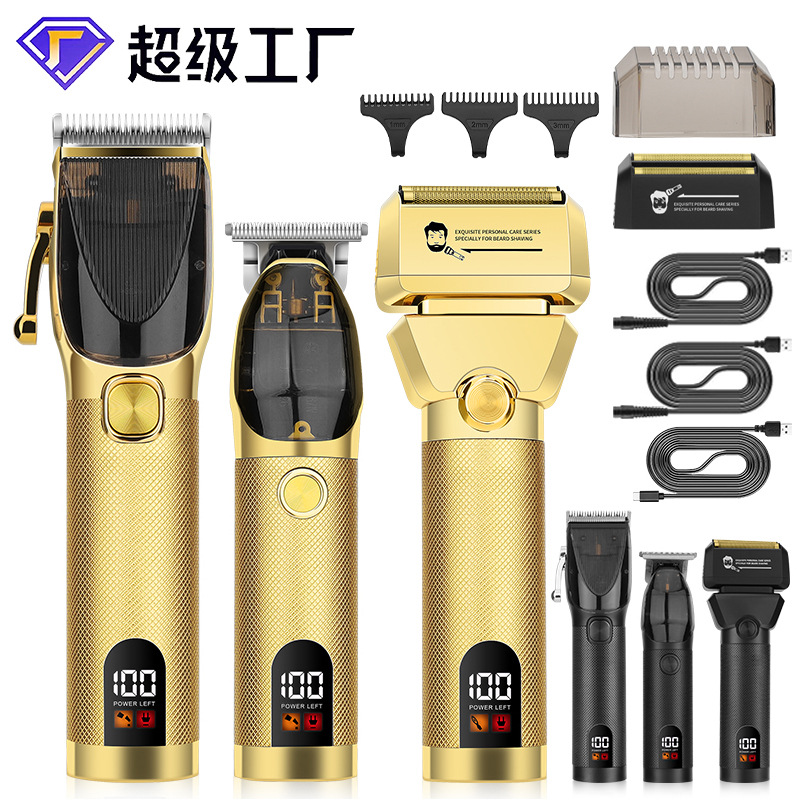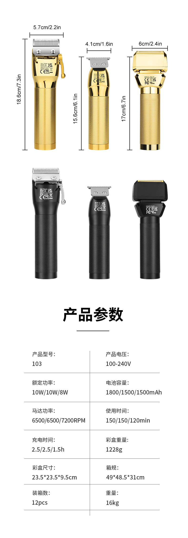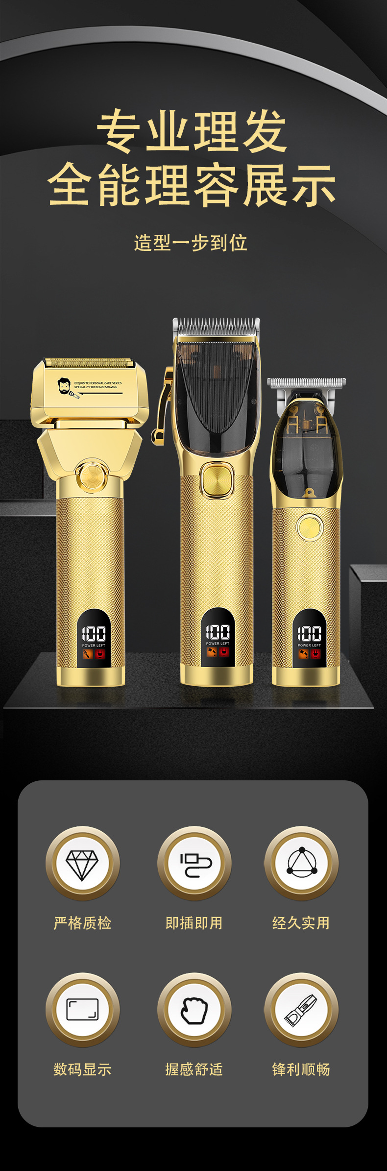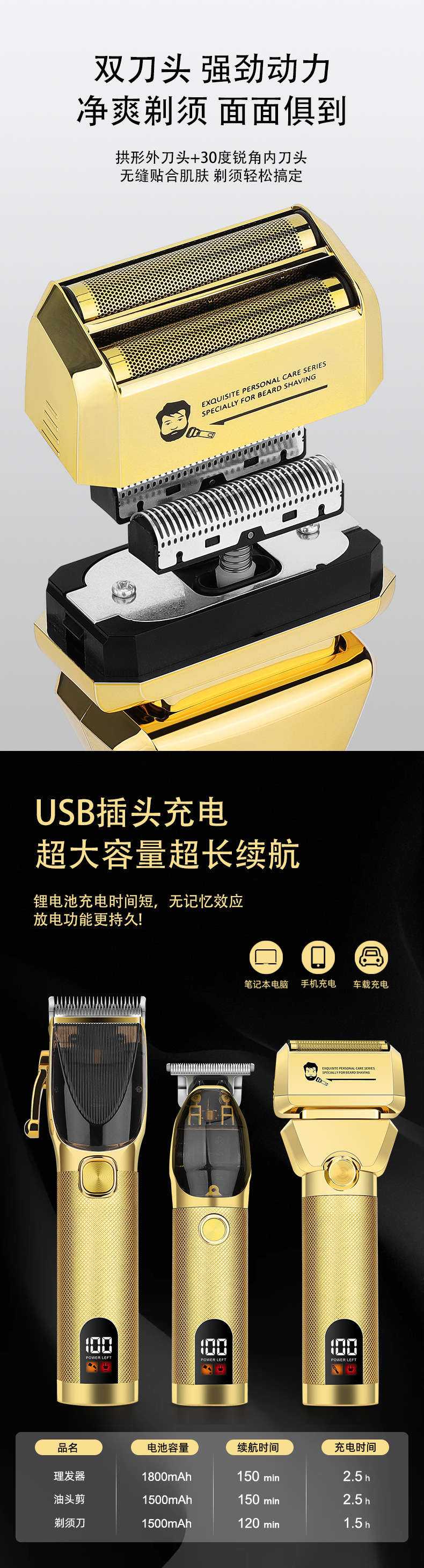 产品配件:专业理发器+雕刻理发器+往复式剃须刀+可更换剃须刀头+剃须刀刀头保护盖+大限位梳*4+雕刻限位梳*3+USB充电线*3+梳子+清洁刷+英文说明书.