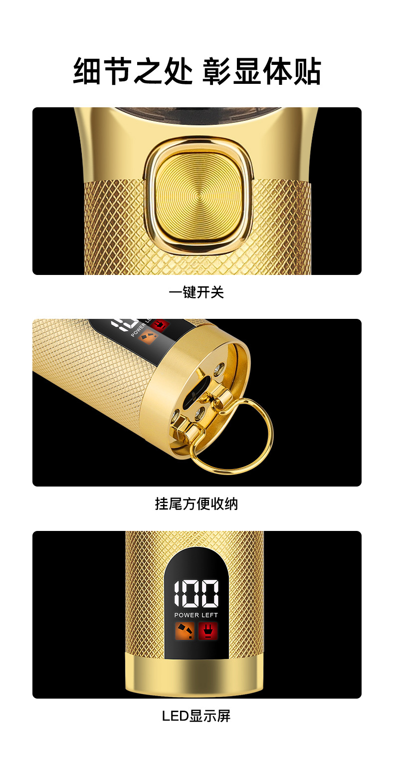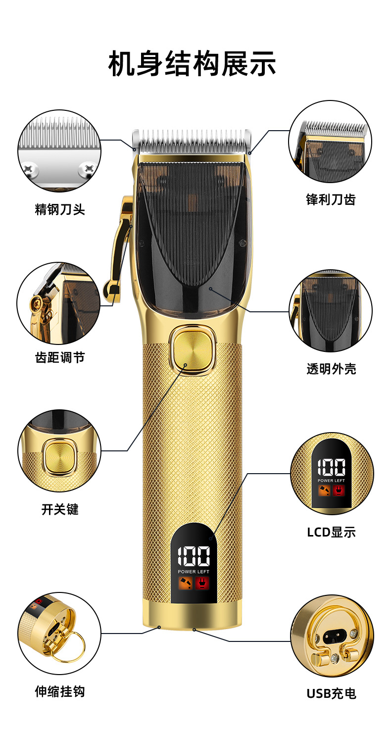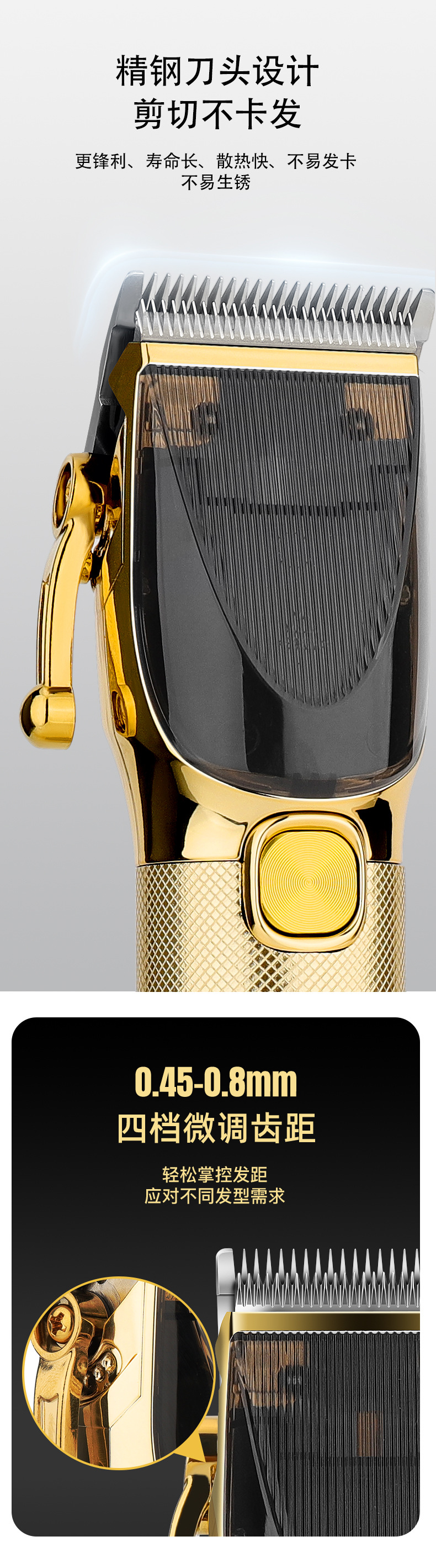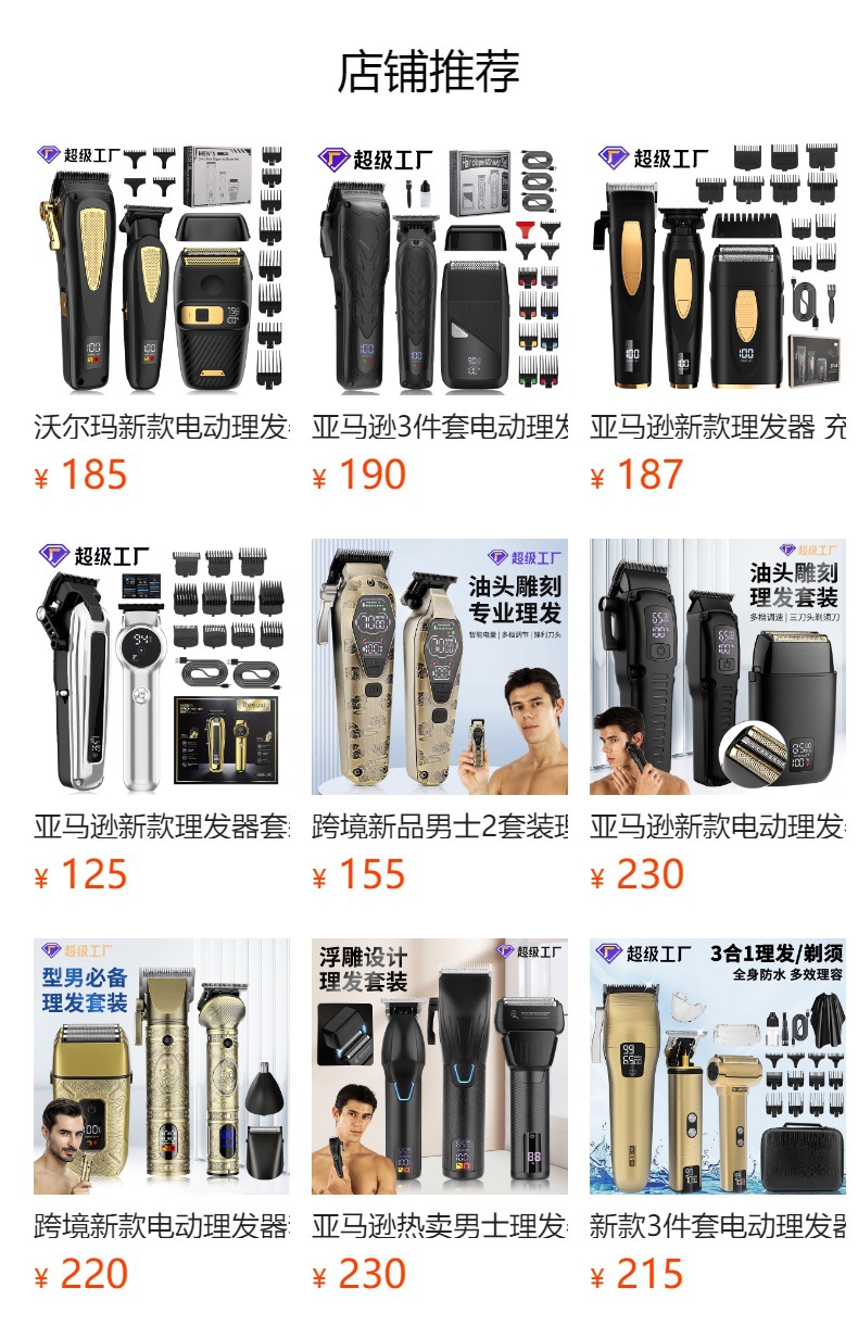产品配件:专业理发器+雕刻理发器+往复式剃须刀+可更换剃须刀头+剃须刀刀头保护盖+大限位梳*4+雕刻限位梳*3+USB充电线*3+梳子+清洁刷+英文说明书.