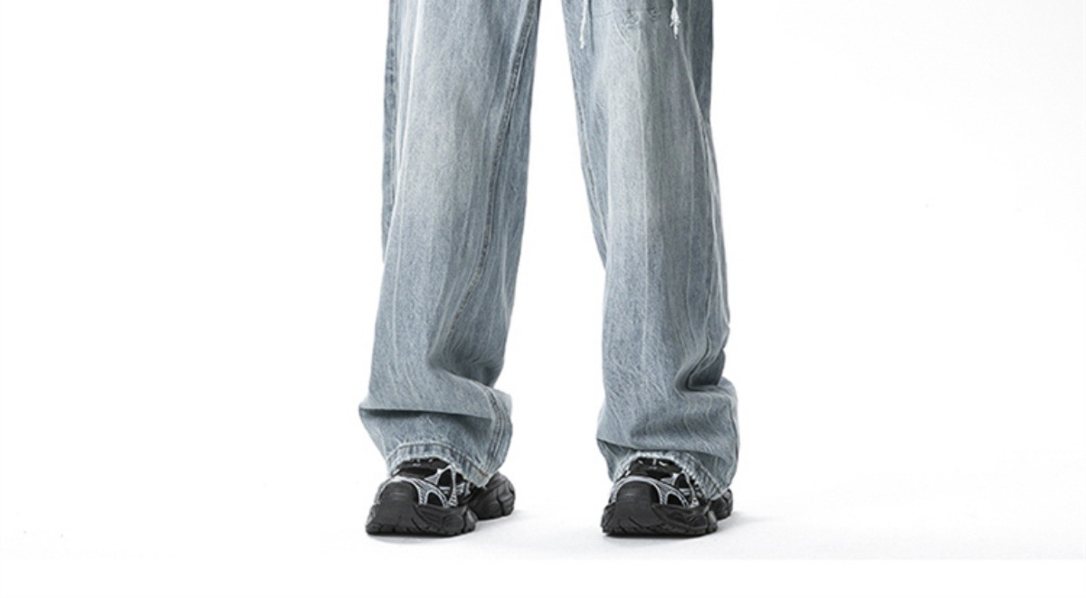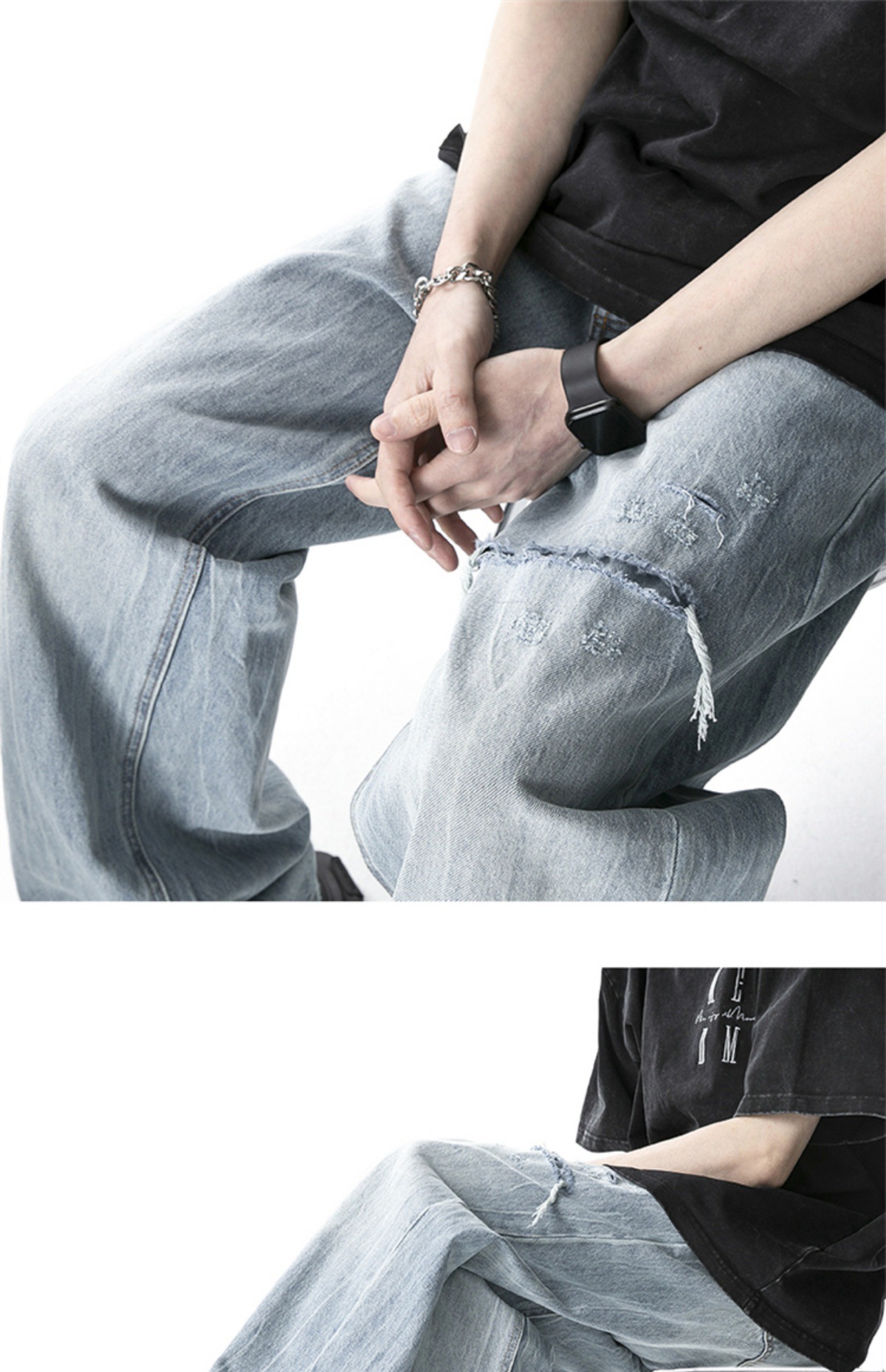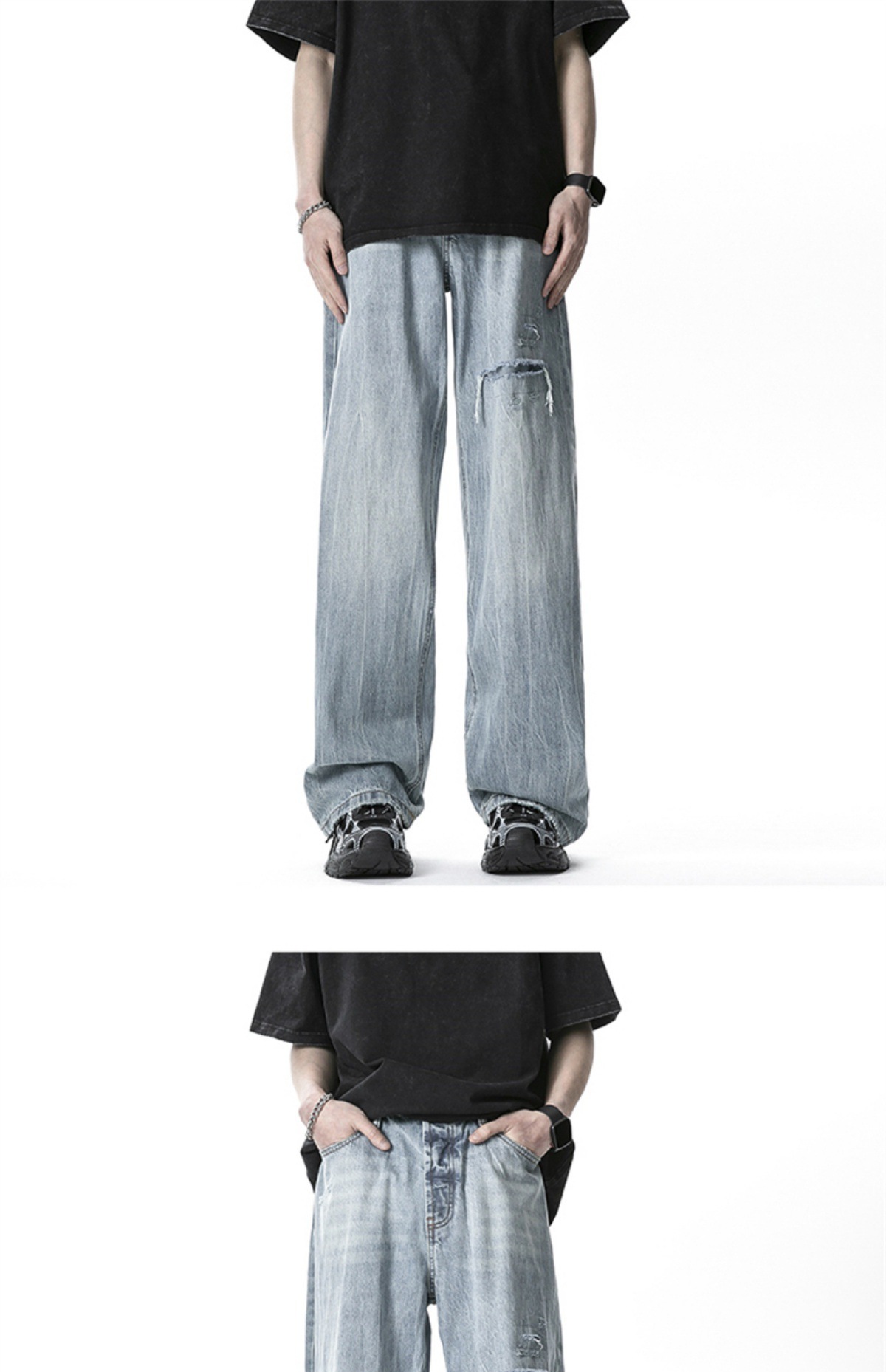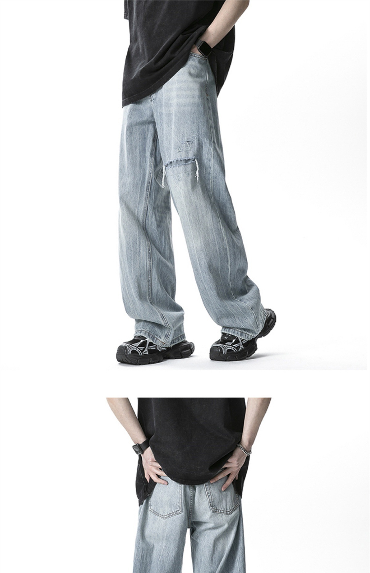 세척 된 찢어진 청바지 남성용 빈티지 아메리칸 스타일 하이 스트리트 느슨한 스트레이트 디자인 센스 올드 스타일 와이드 다리 캐주얼 바지