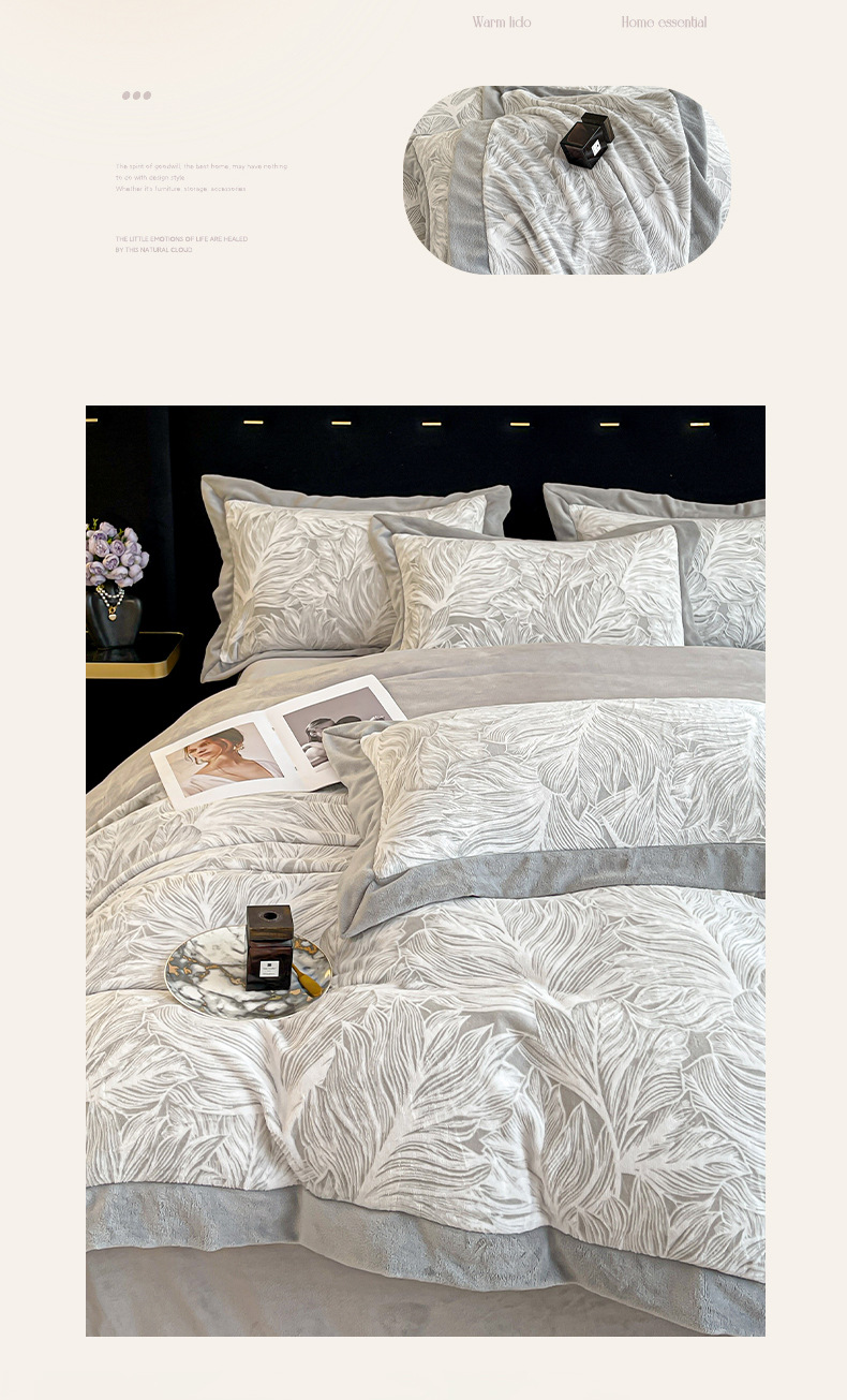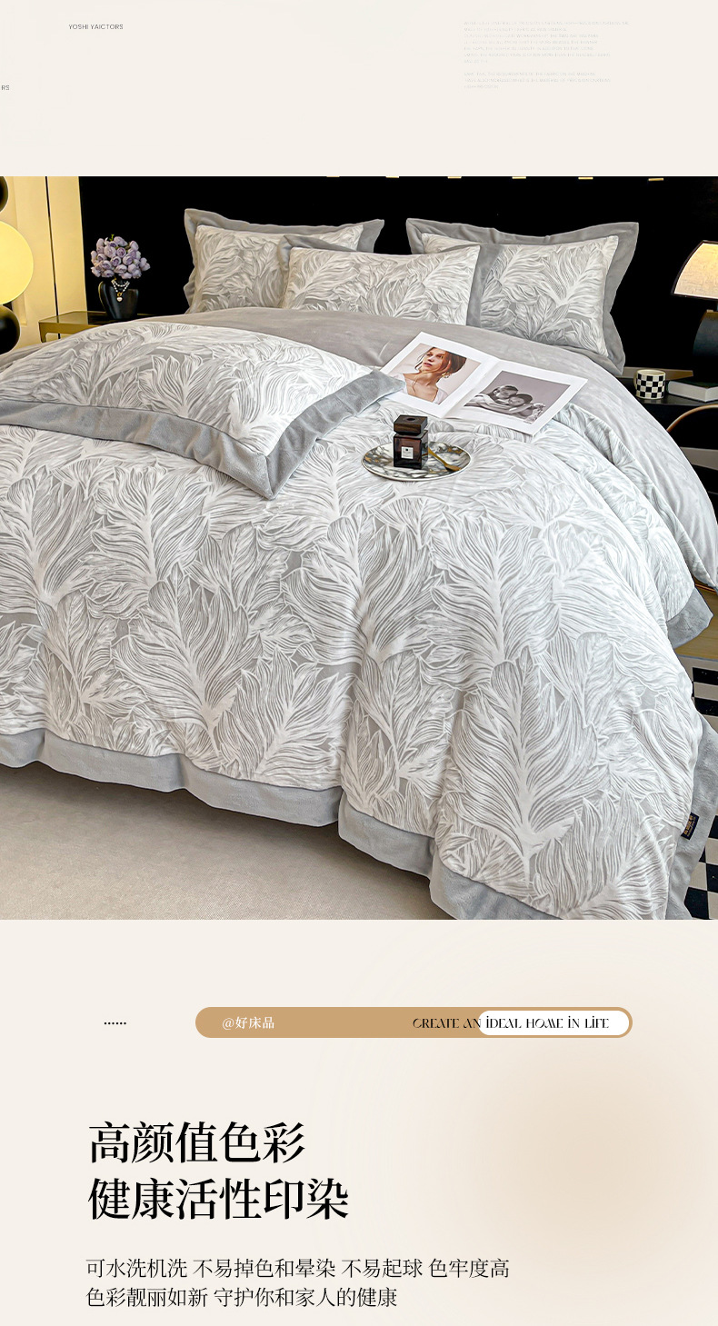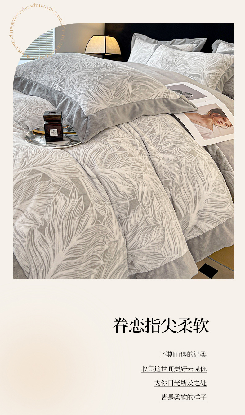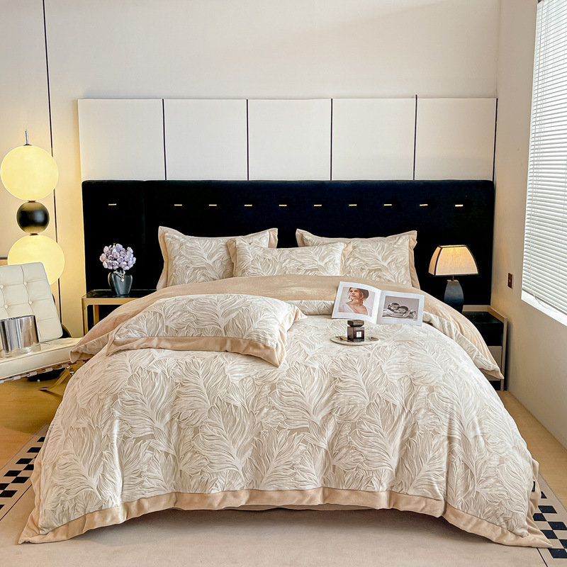 가벼운 럭셔리 클래스 밀크 벨벳 4 피스 세트 3 차원 조각 벨벳 플란넬 침대 시트 퀼트 커버 겨울 따뜻한 벨벳 퀼트 커버