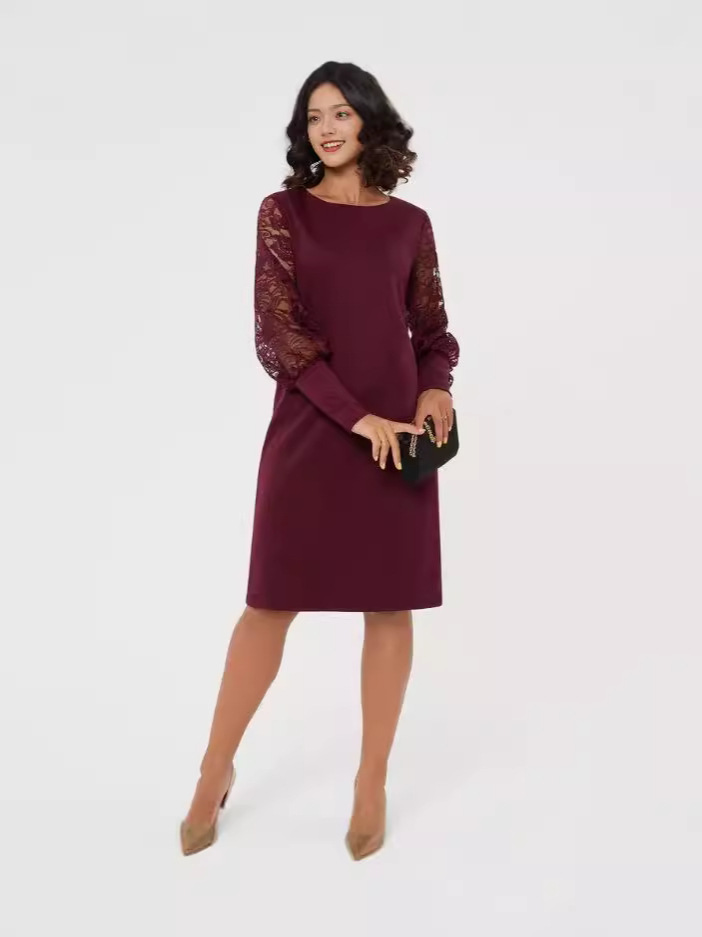 유럽과 미국 여성 국경 아마존 원피스 크루 넥 긴 소매 할로우 레이스 슬리브 스티칭 슬림 핏 원피스