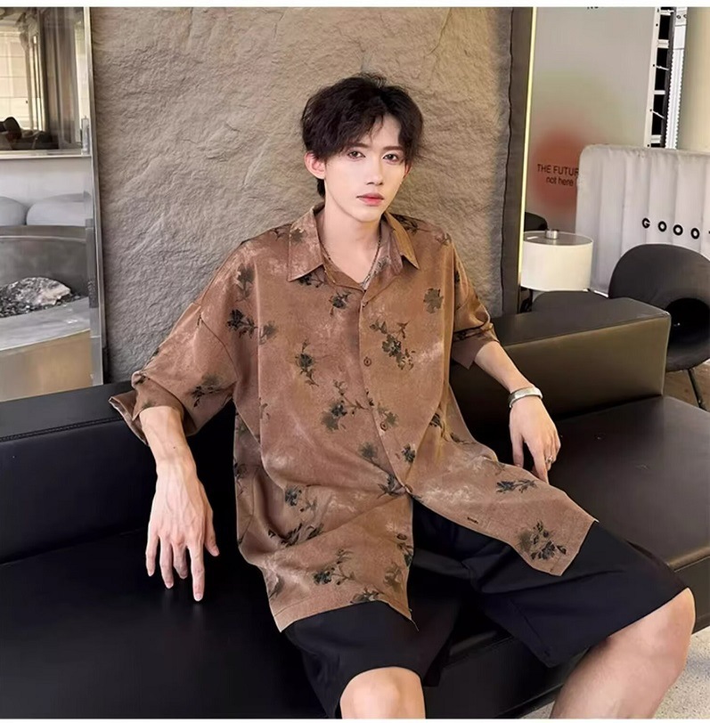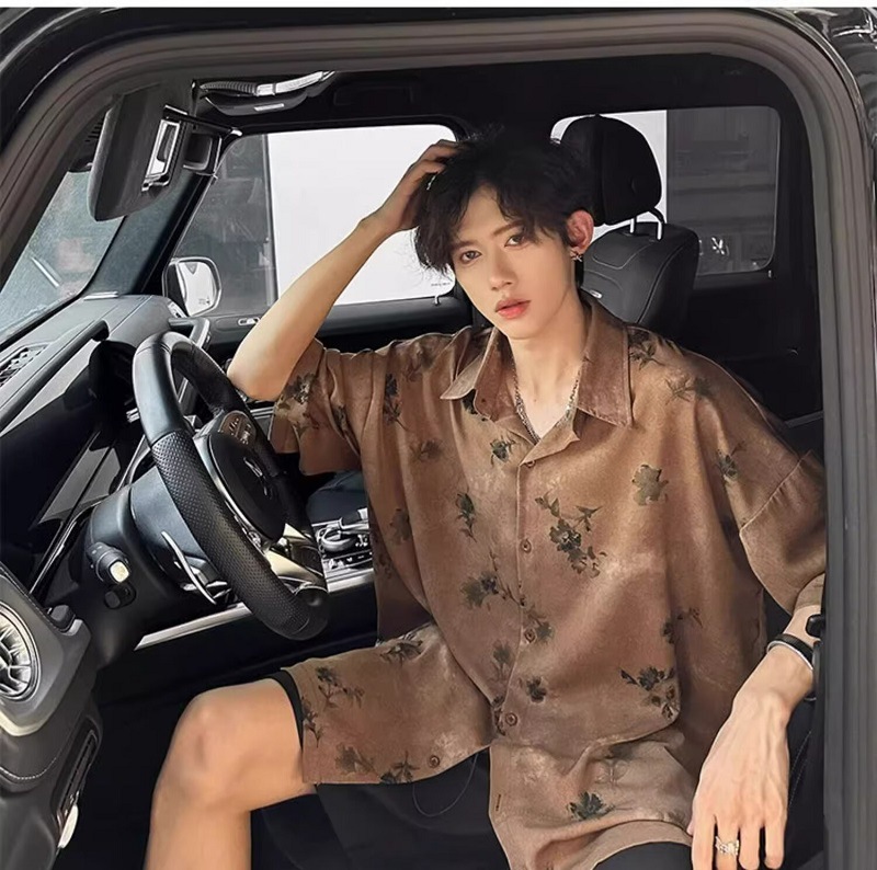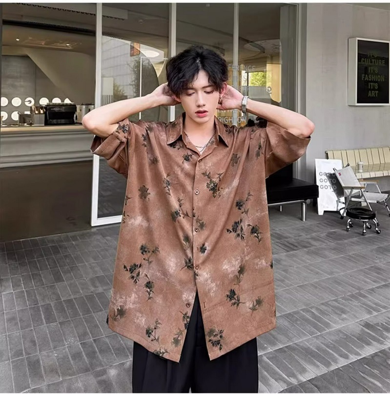 미국 복고풍 보라색 꽃 전체 인쇄 짧은 소매 셔츠 디자인 센스 높은 빈티지 하와이 스타일 셔츠스토어 가기