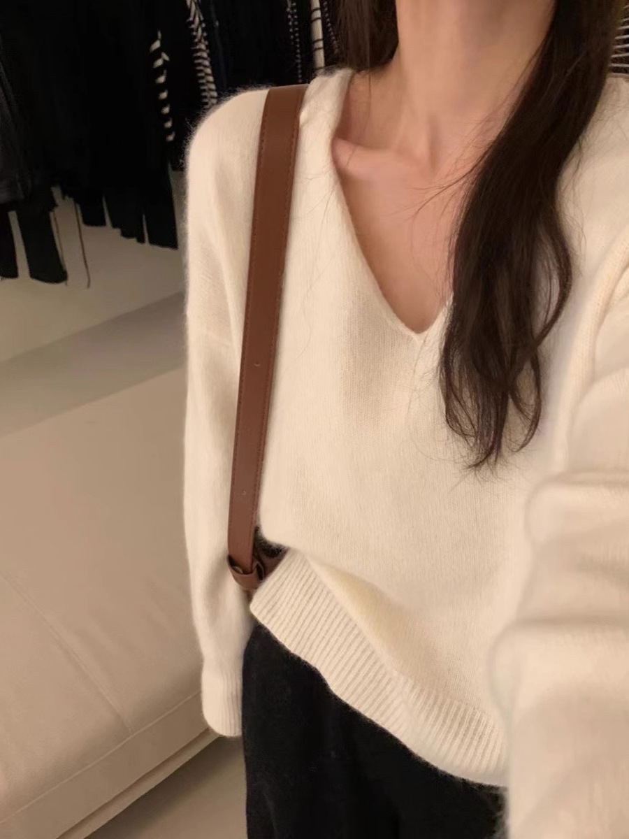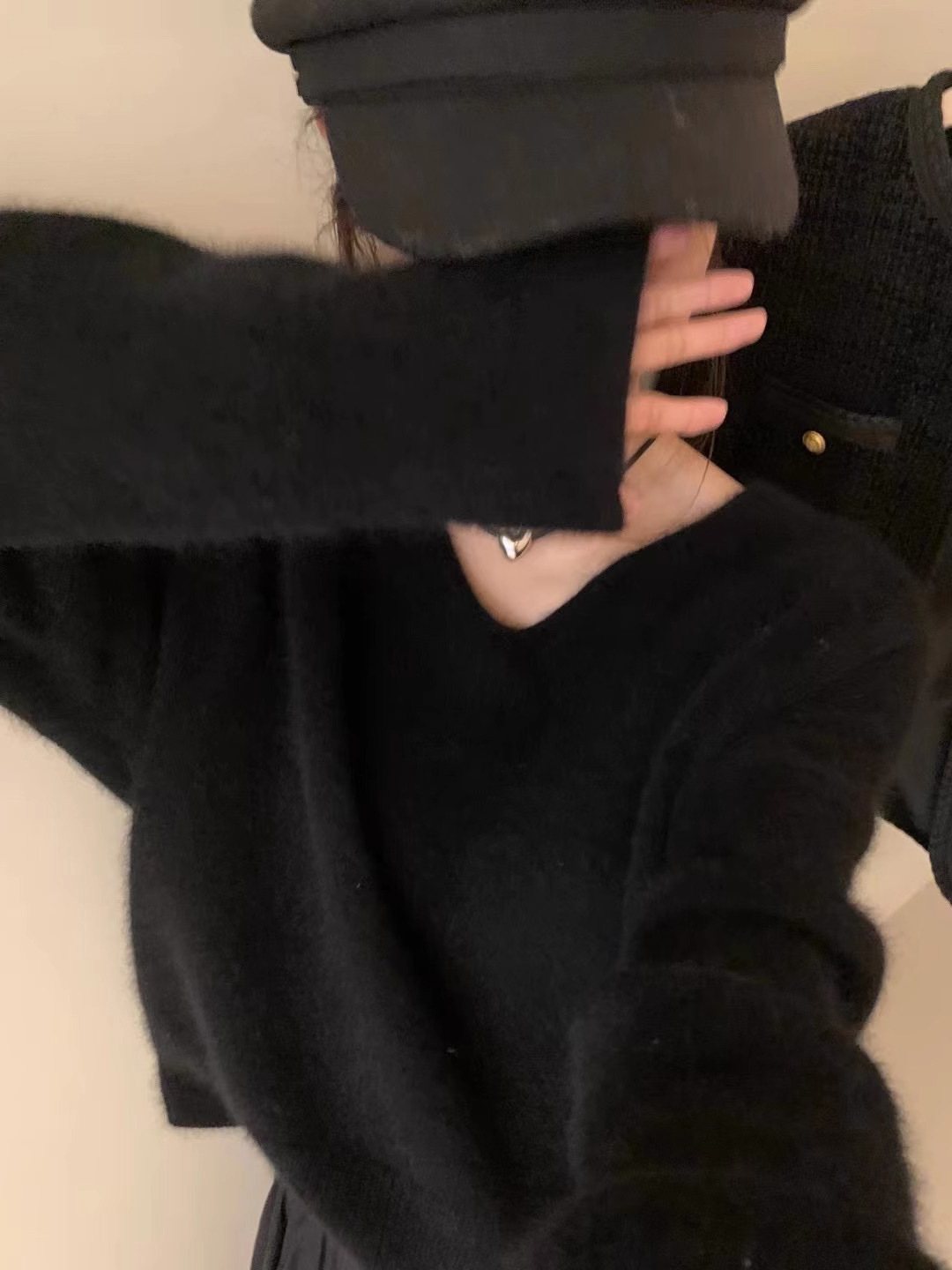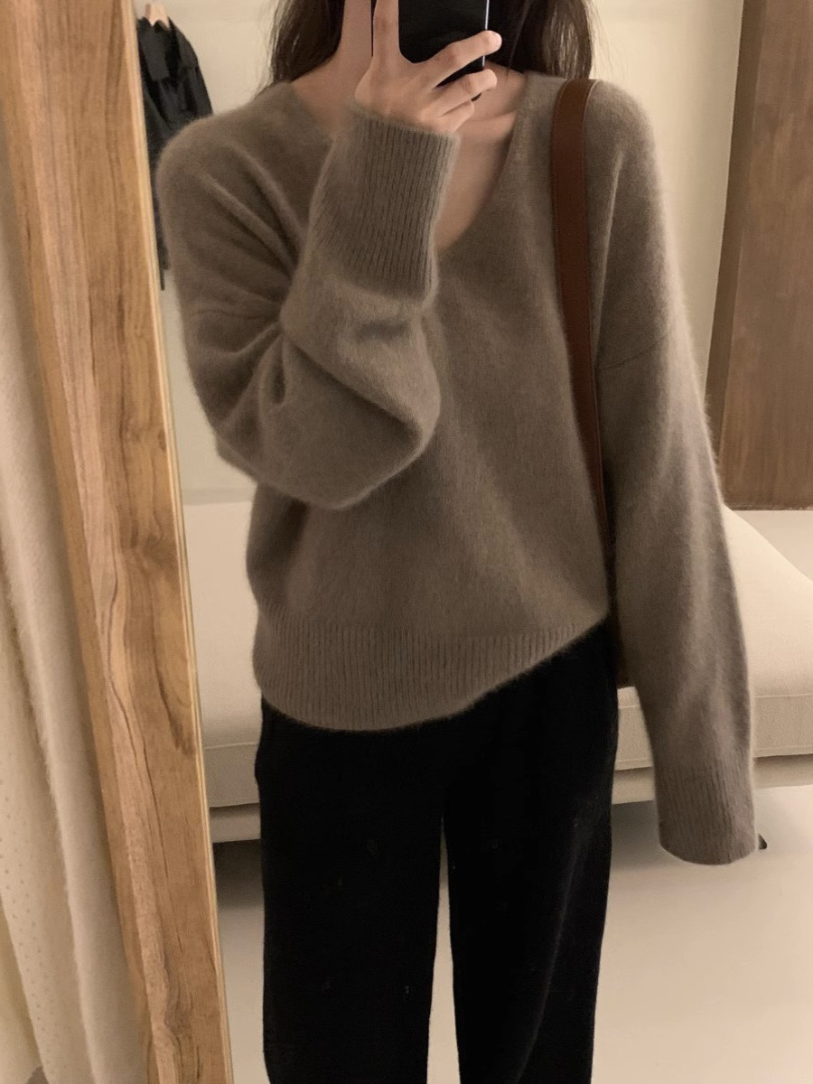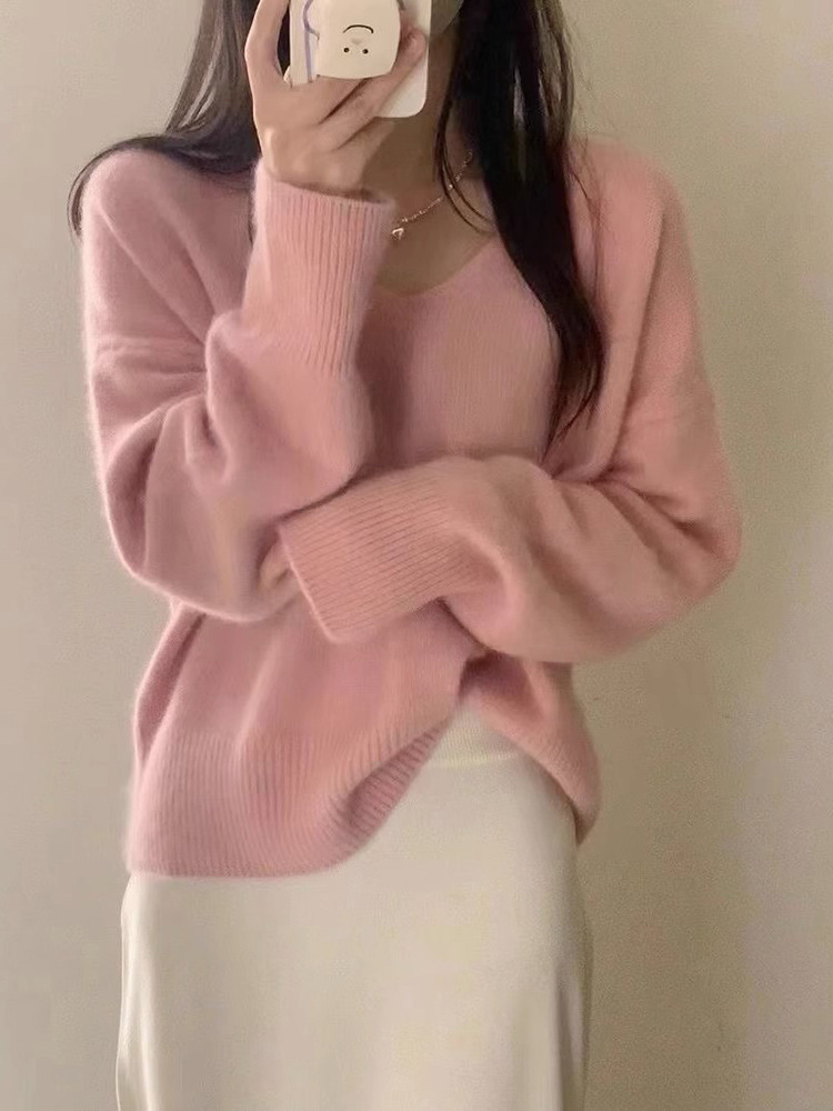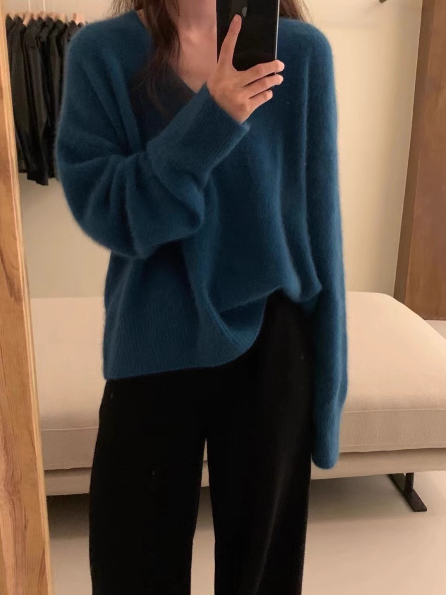 2024 소프트 왁스 면 공작 블루 V-Neck 니트 내복 여성용 두꺼운 가을과 겨울 느슨한 게으른 스웨터 풀오버 탑