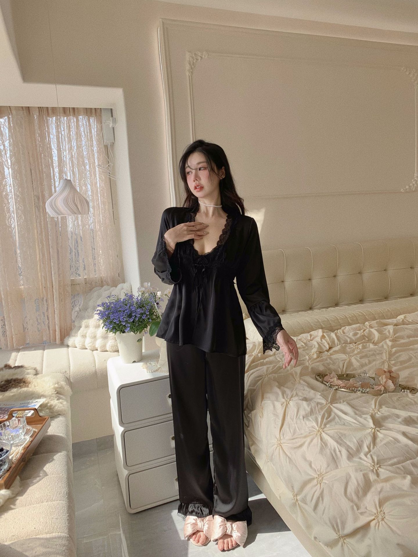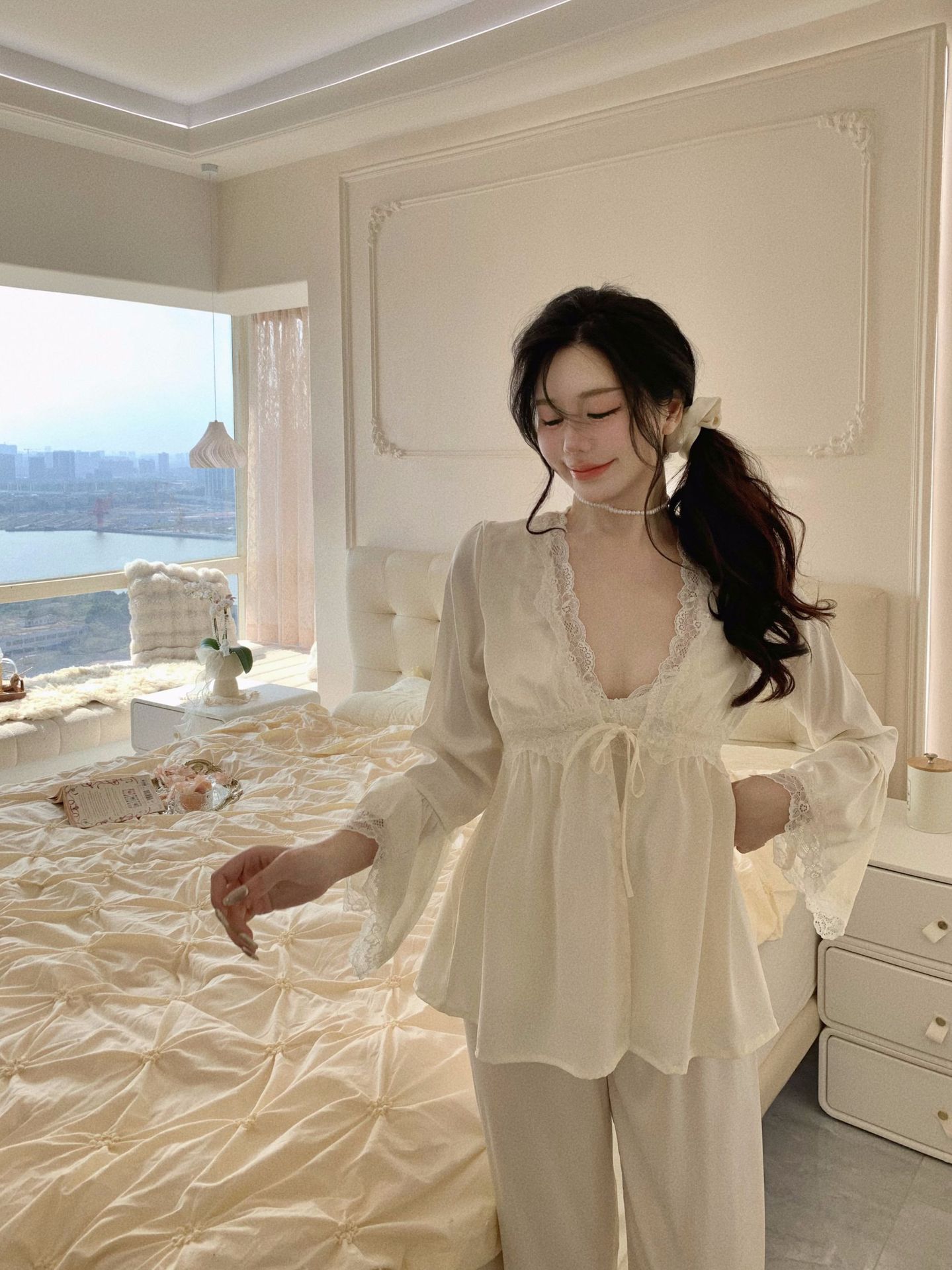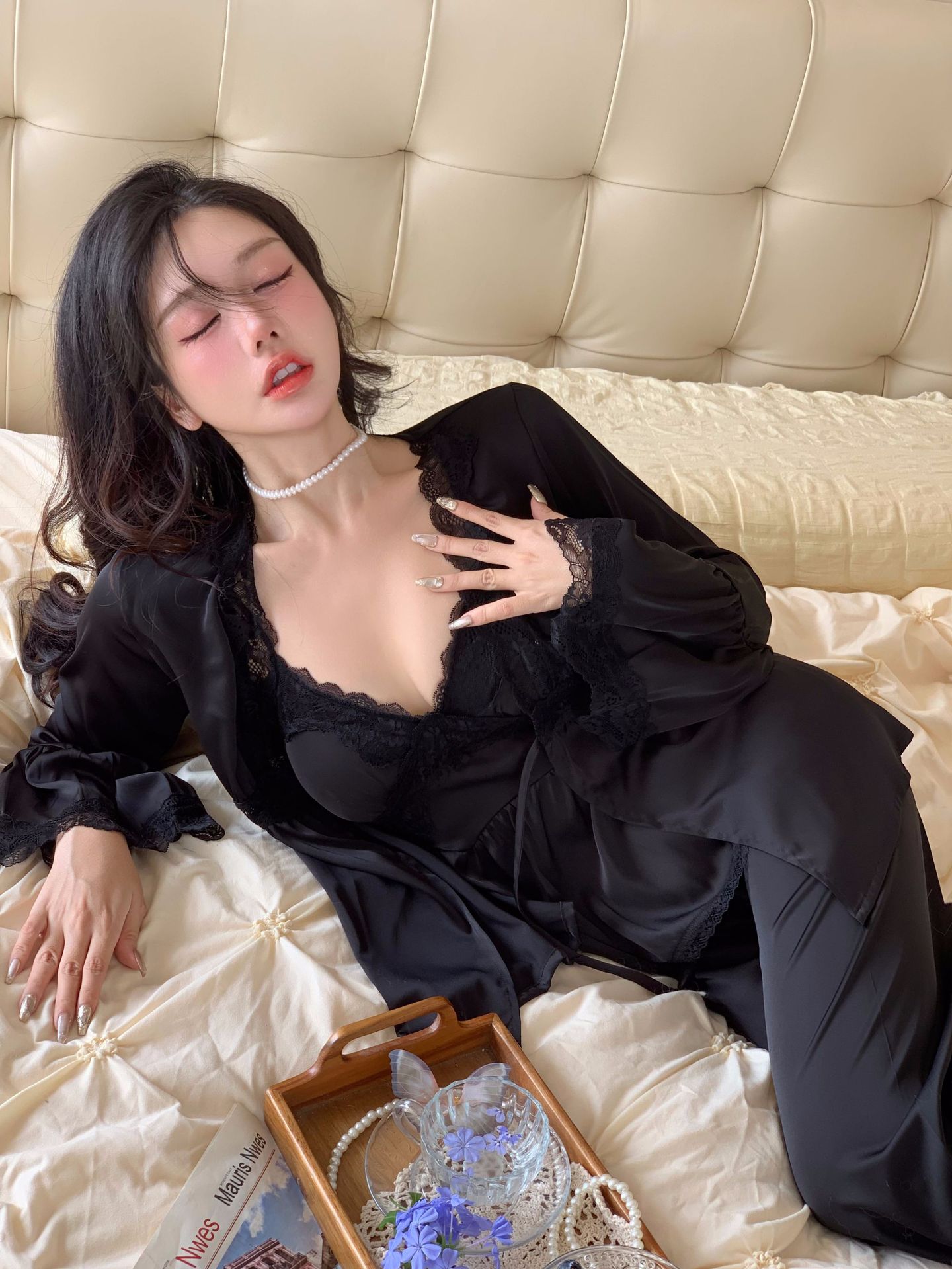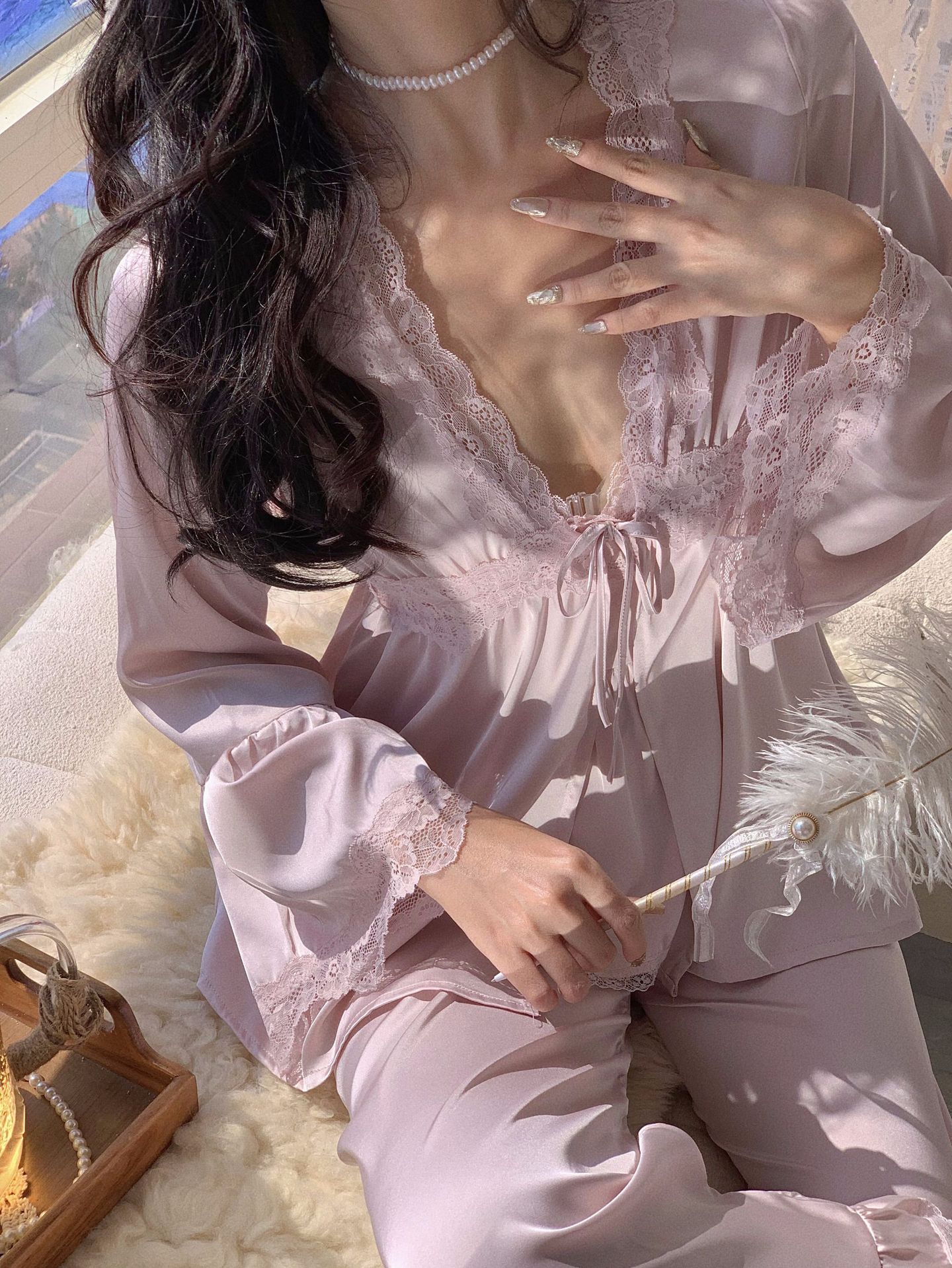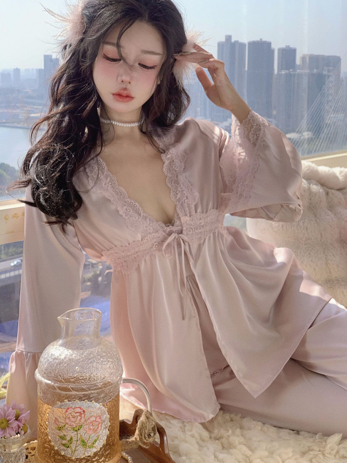 자오 루시의 가을 새 슬링 바지 파자마 프랑스 섹시한 레이스 3 피스 홈 옷 아이스 실크스토어 가기