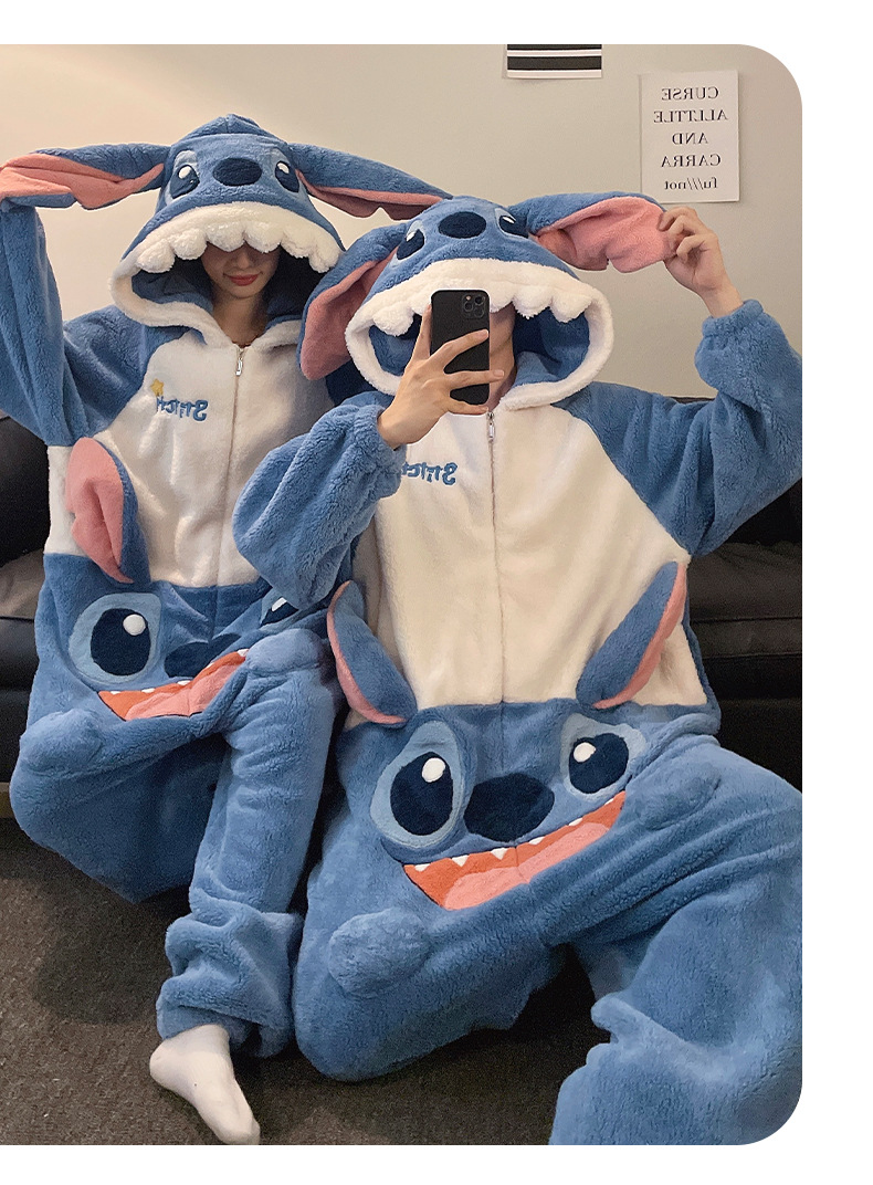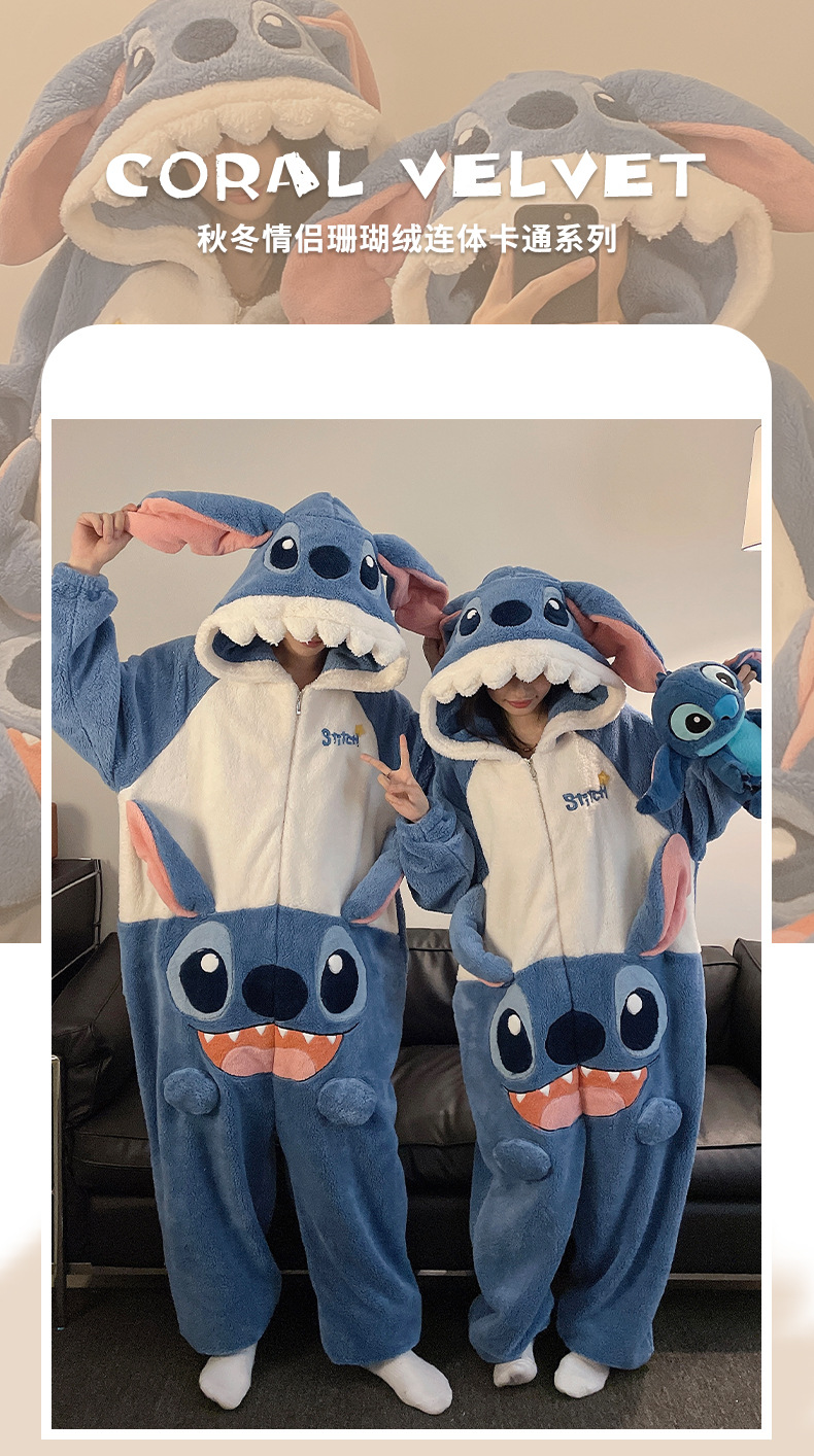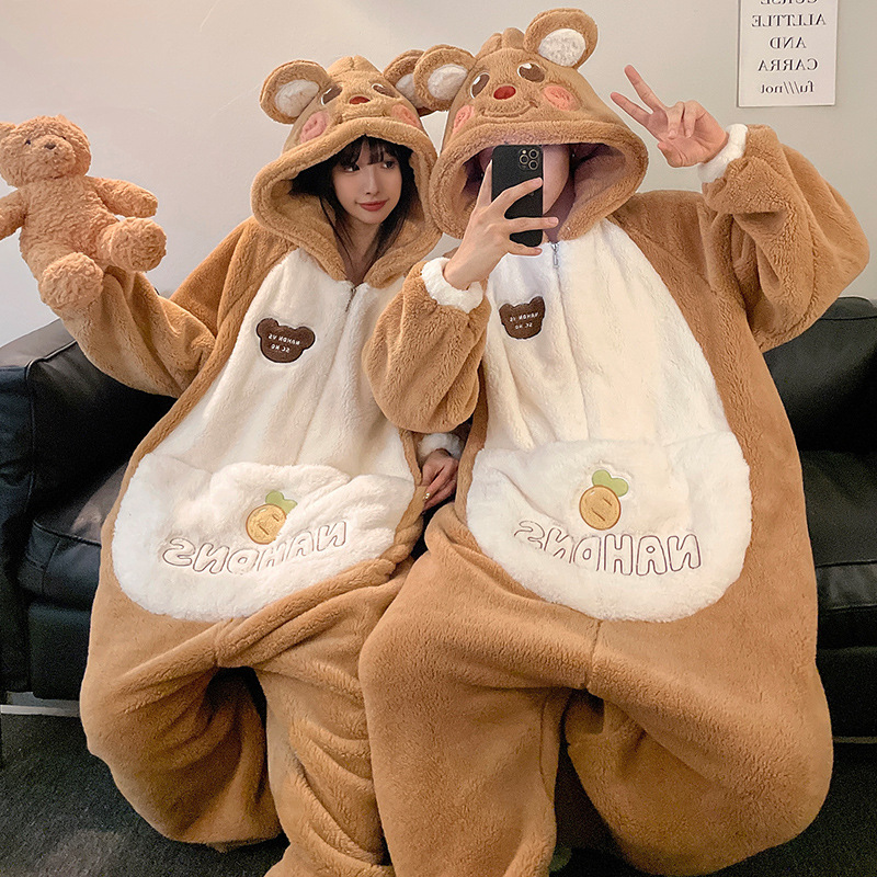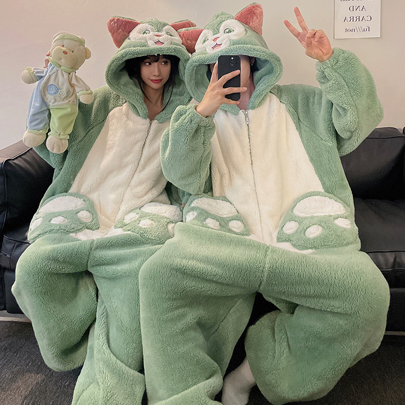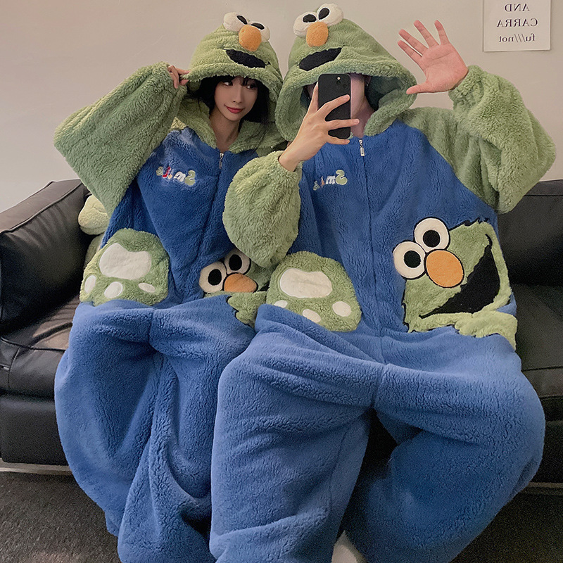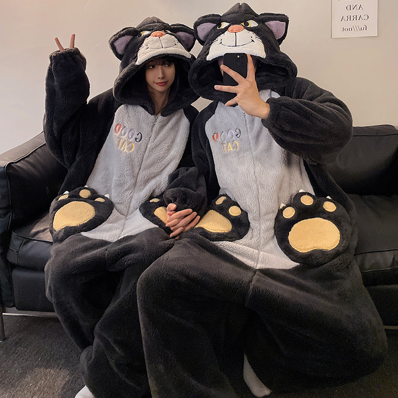 겨울 결합 된 커플 잠옷 여성 만화 사산 기모 두꺼운 따뜻한 남성 플란넬 후드 홈 의류스토어 가기