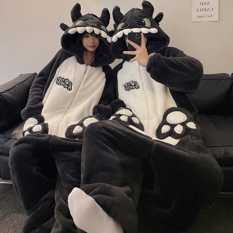 겨울 결합 된 커플 잠옷 여성 만화 사산 기모 두꺼운 따뜻한 남성 플란넬 후드 홈 의류