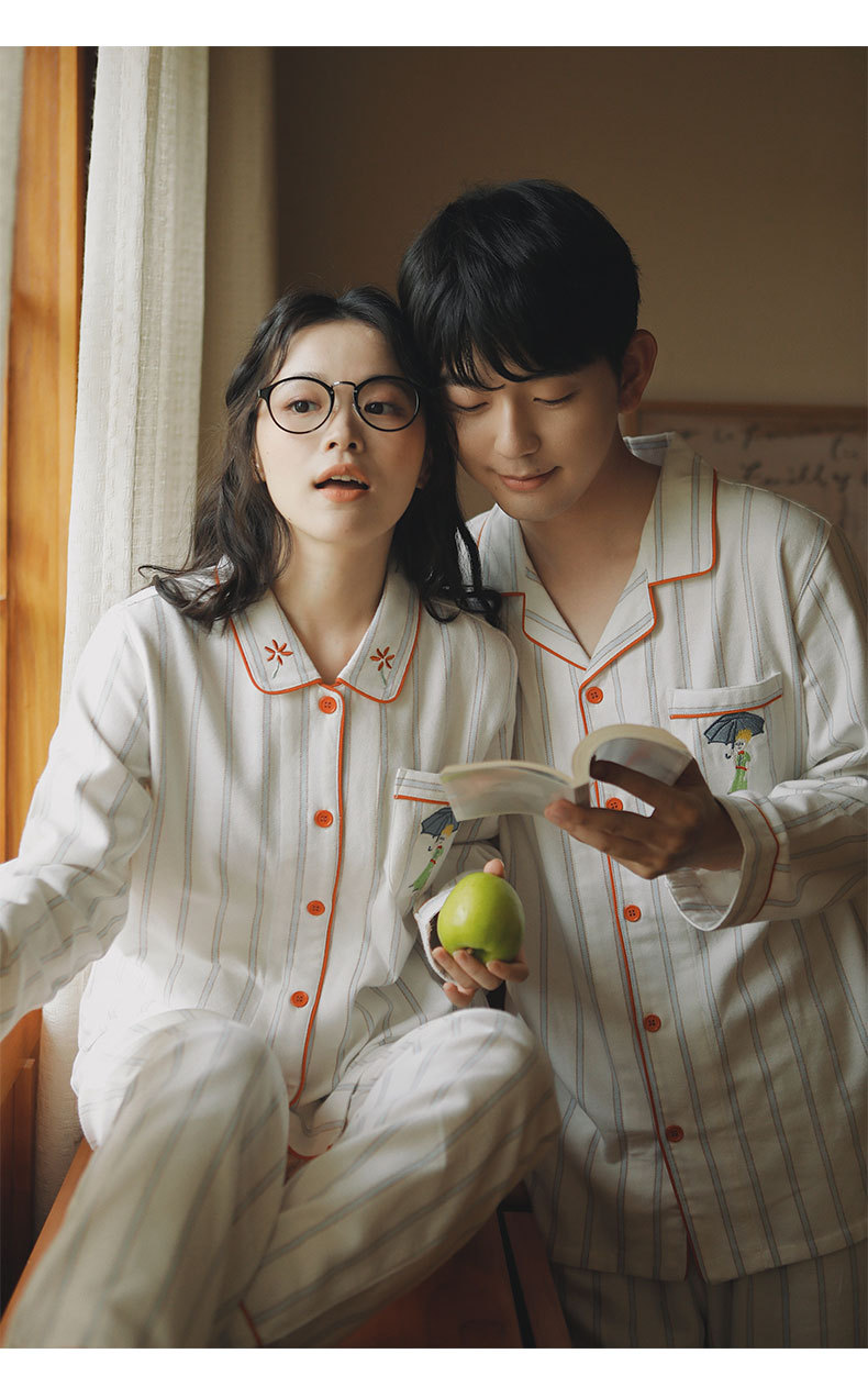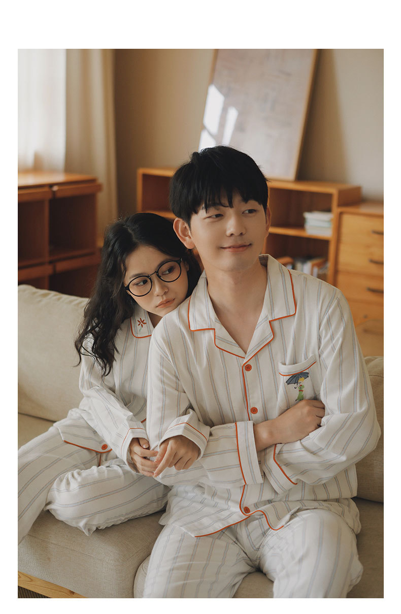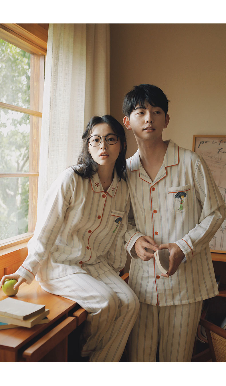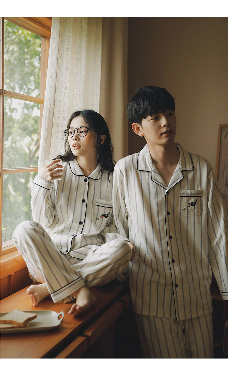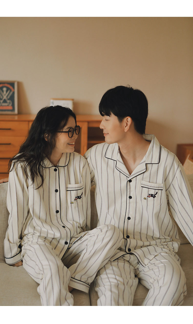 봄과 가을용 여성용 야수 잠옷 순면 커플 세트 줄무늬 자수 순면 홈웨어 남성용 대형 사이즈 외출용 가능스토어 가기