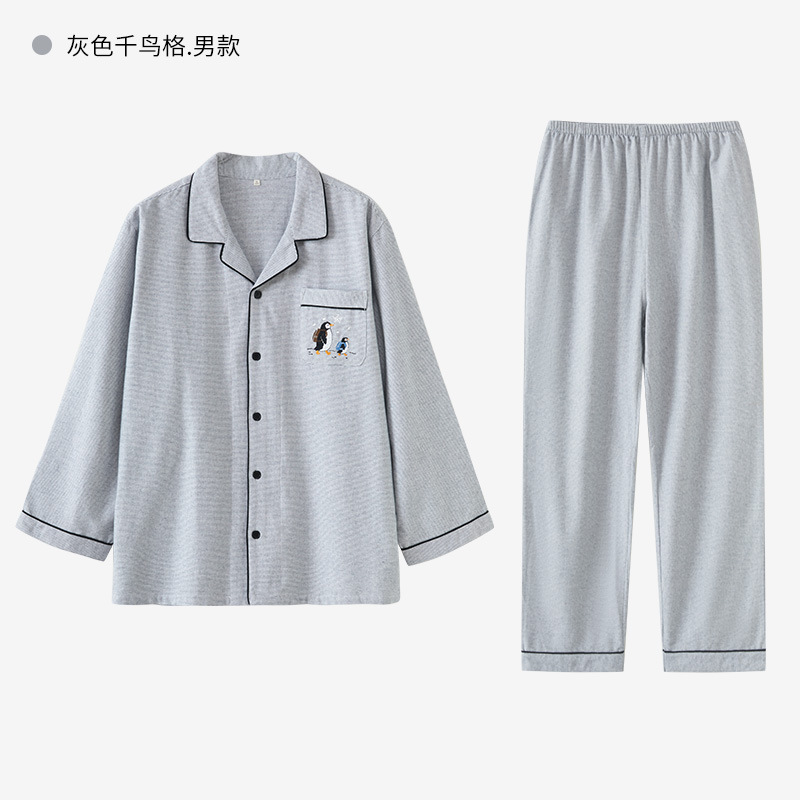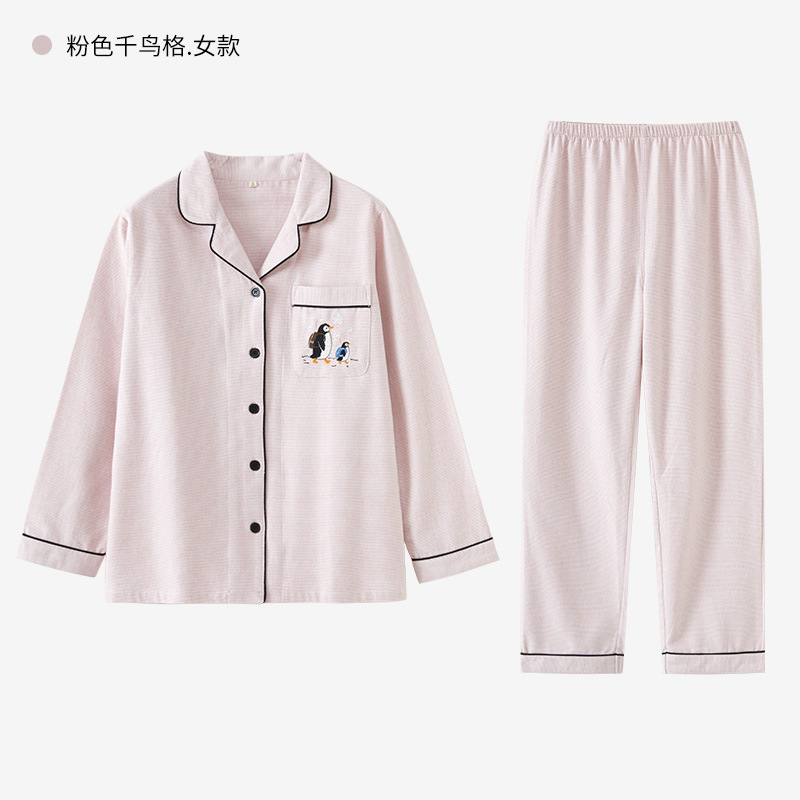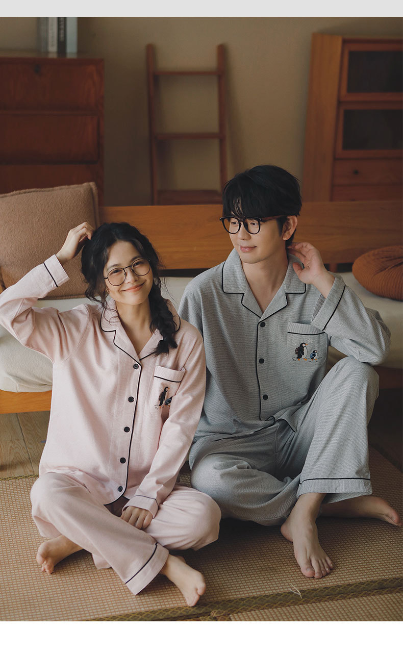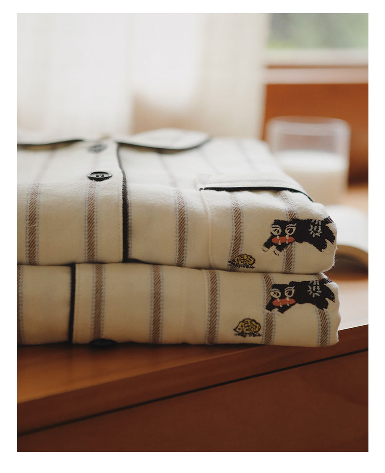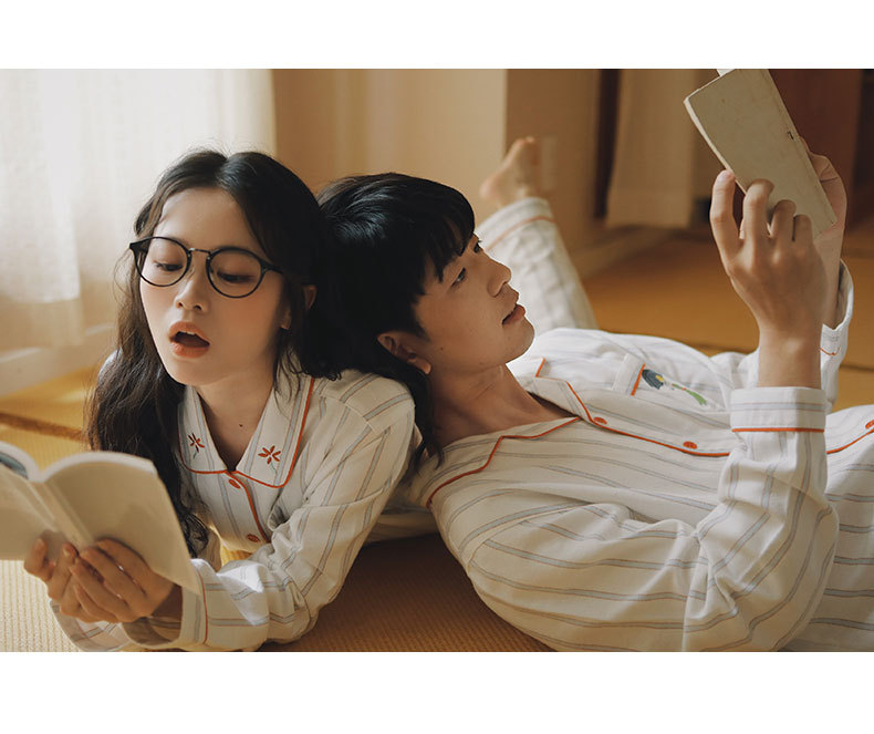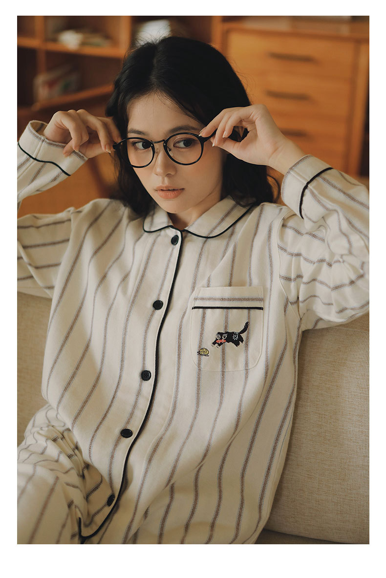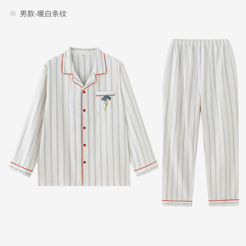 봄과 가을용 여성용 야수 잠옷 순면 커플 세트 줄무늬 자수 순면 홈웨어 남성용 대형 사이즈 외출용 가능스토어 가기
