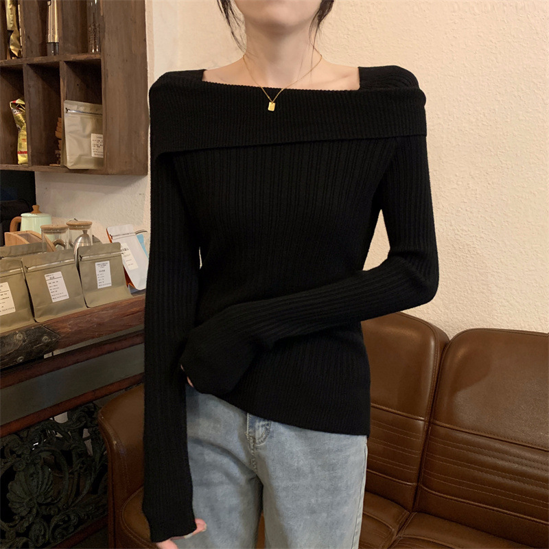 여성의 봄 가을과 겨울 불규칙한 어깨 니트 셔츠 프랑스 높은 허리 및 긴 소매 탑스토어 가기
