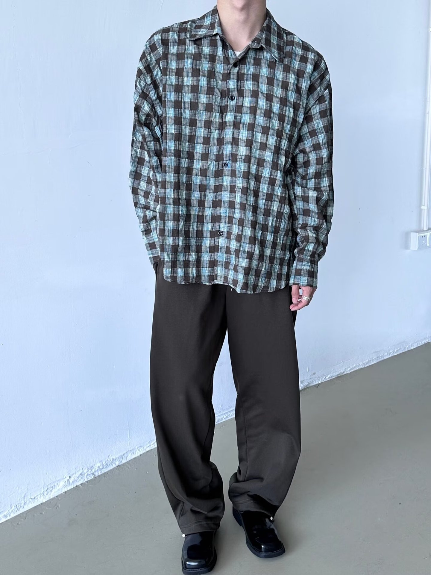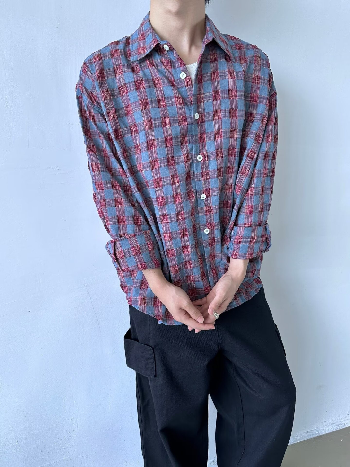 가을 새로운 레트로 주름 짜임새 사우어 빨커 격자 무늬 긴팔 셔츠 남성용 캐주얼 게으른 루즈 트렌디 셔츠