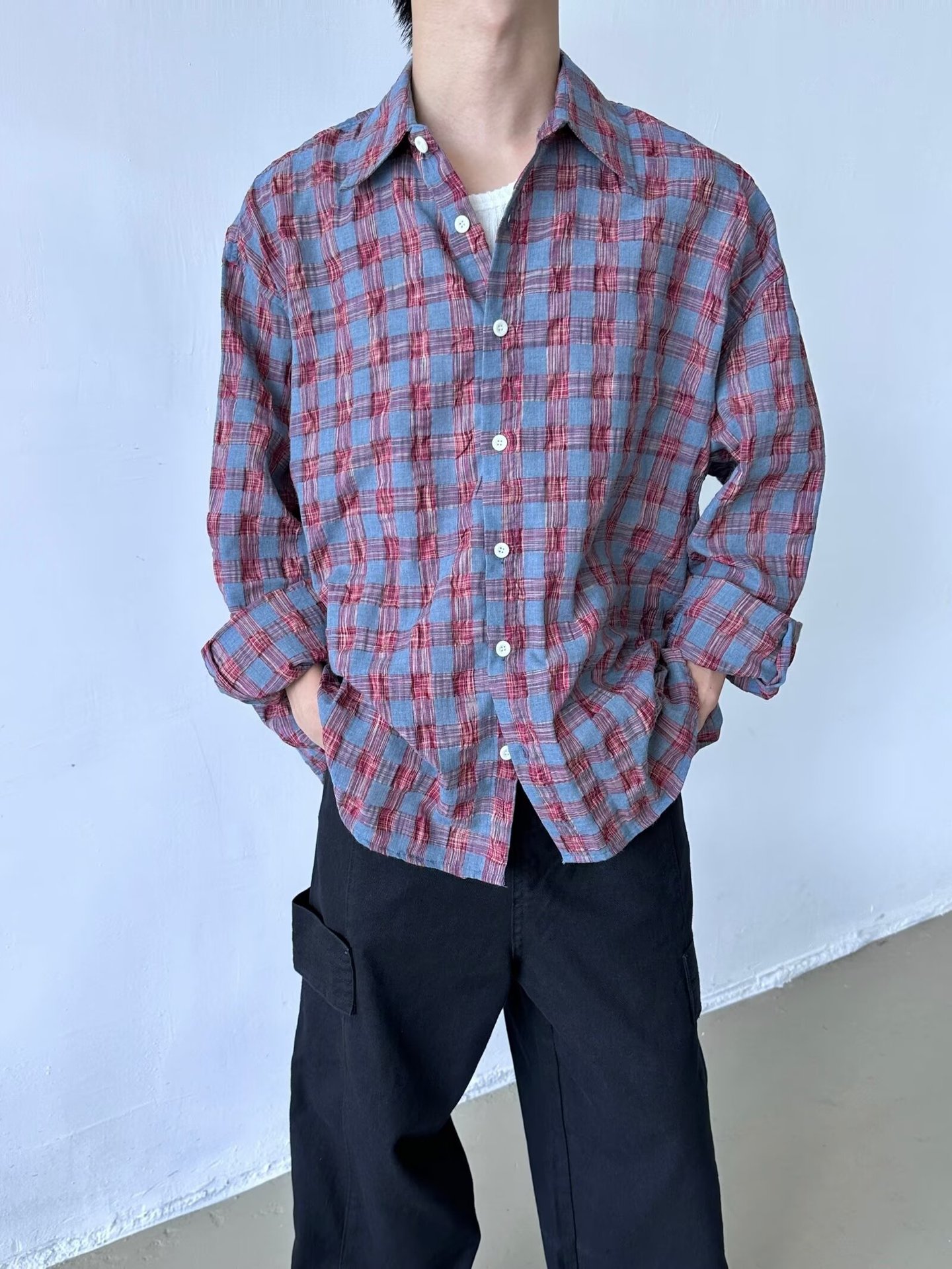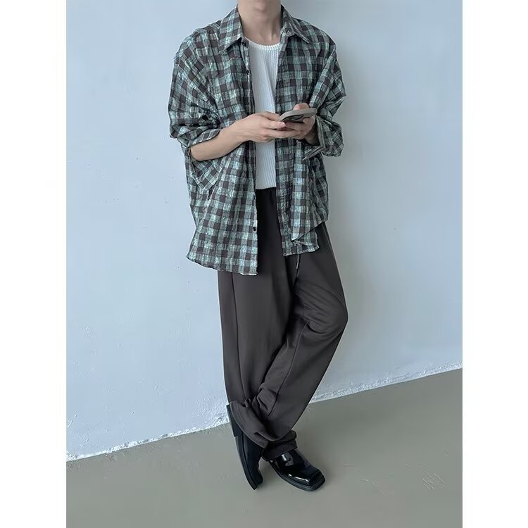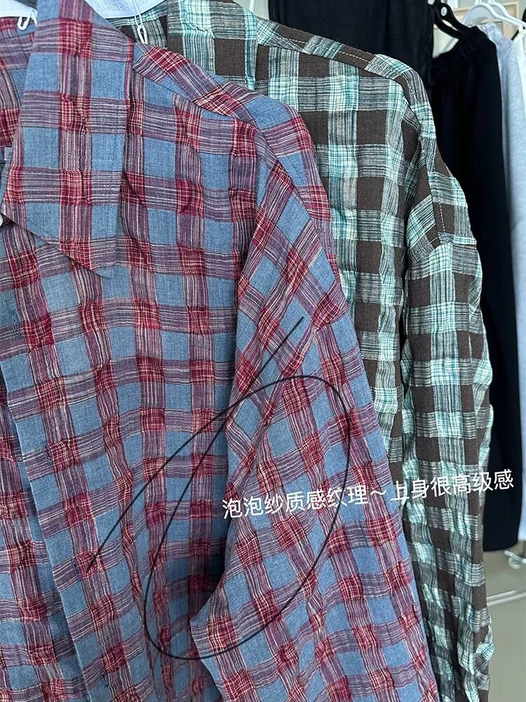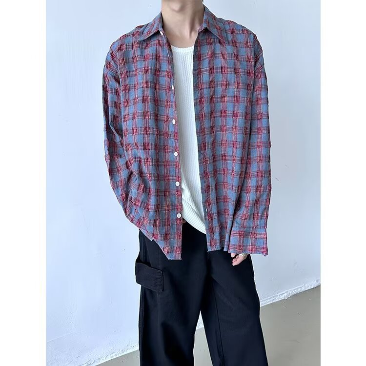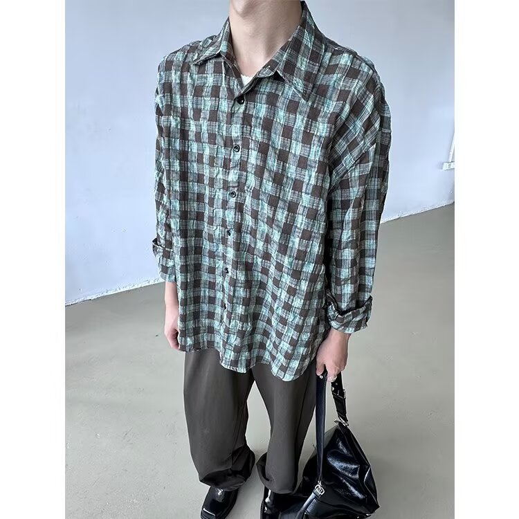 가을 새로운 레트로 주름 짜임새 사우어 빨커 격자 무늬 긴팔 셔츠 남성용 캐주얼 게으른 루즈 트렌디 셔츠스토어 가기