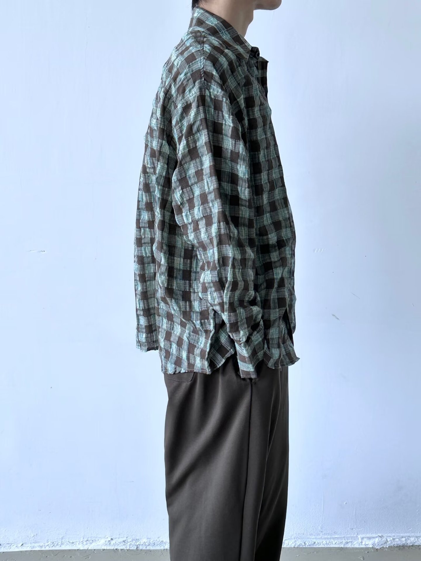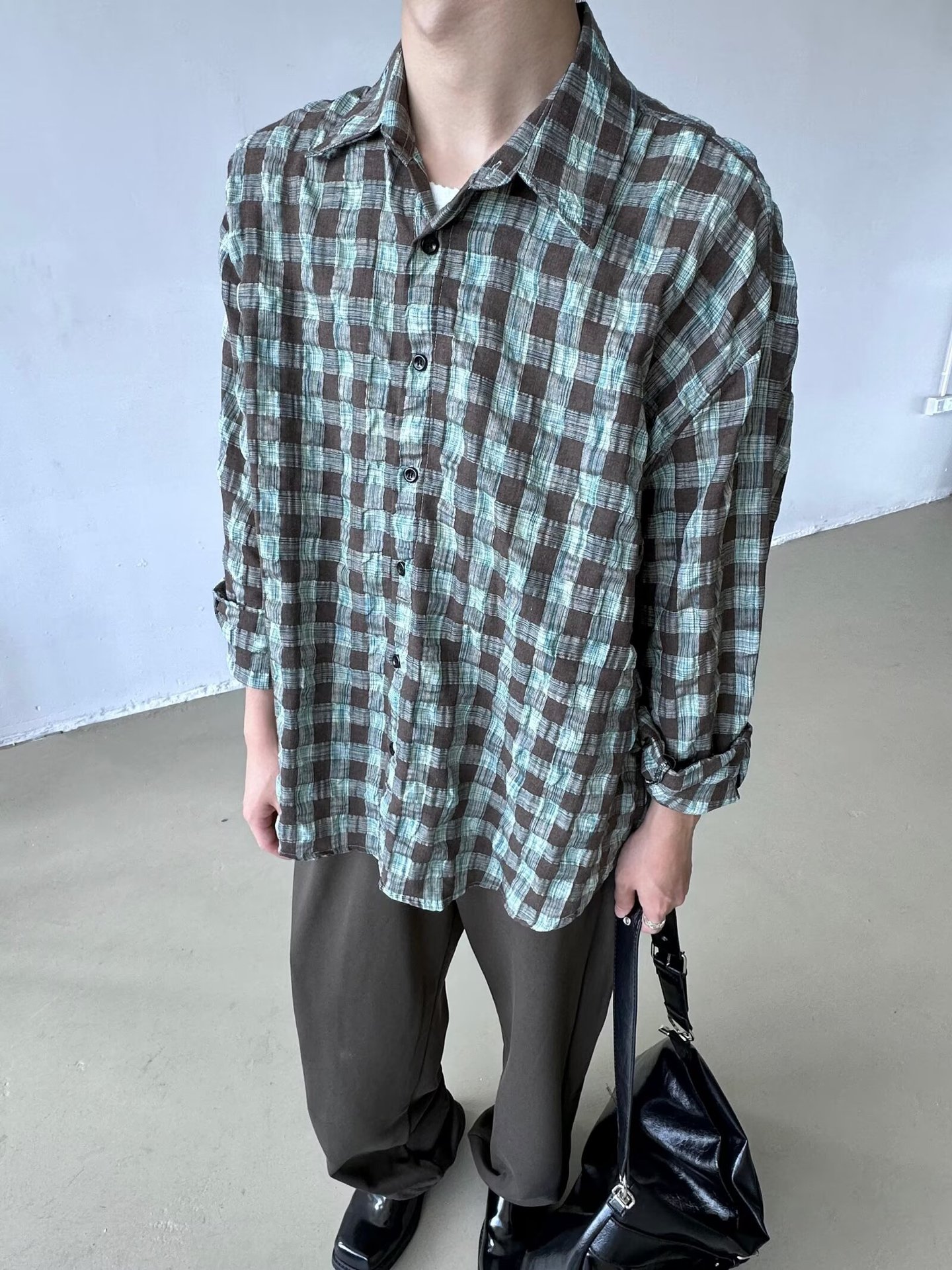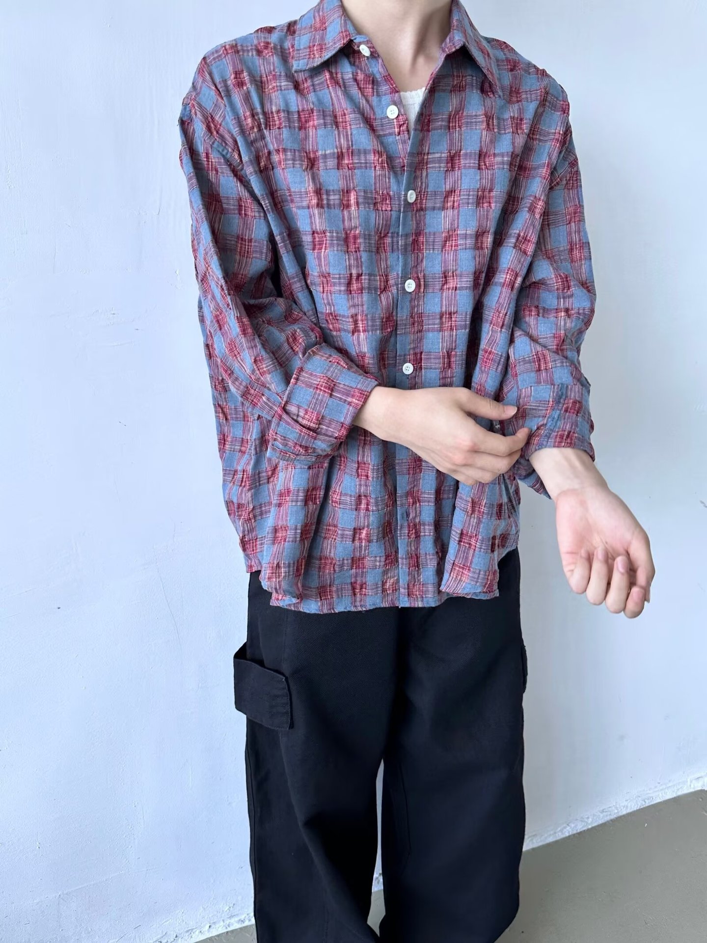 가을 새로운 레트로 주름 짜임새 사우어 빨커 격자 무늬 긴팔 셔츠 남성용 캐주얼 게으른 루즈 트렌디 셔츠스토어 가기