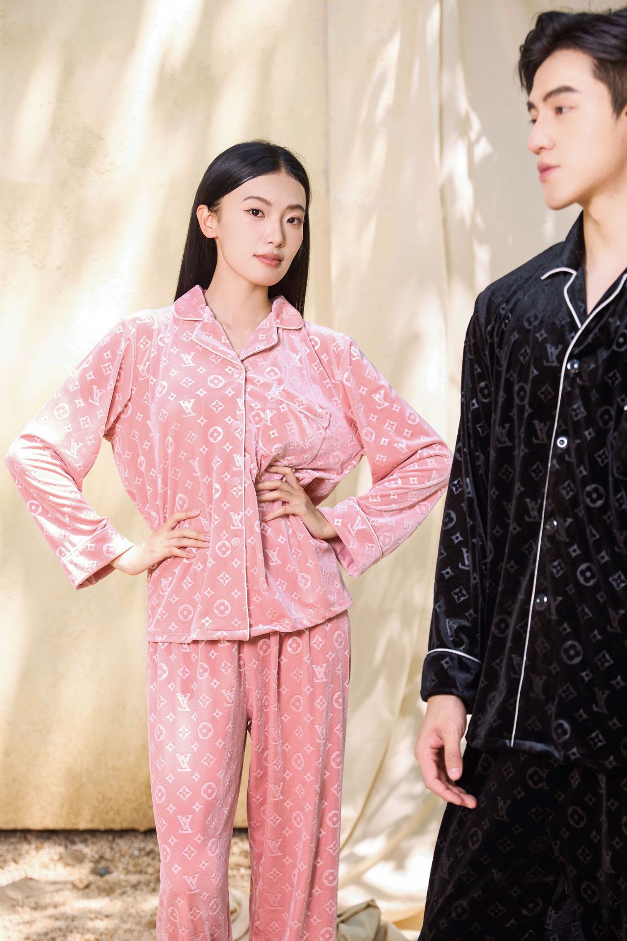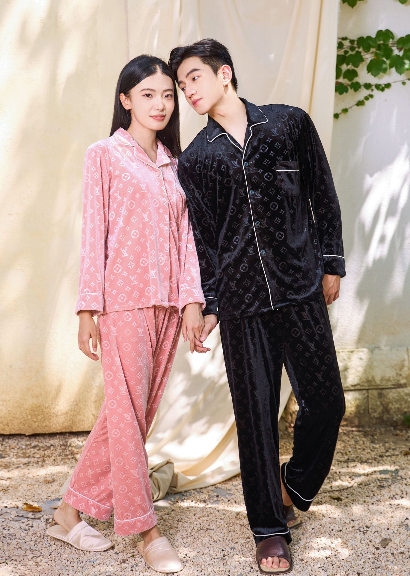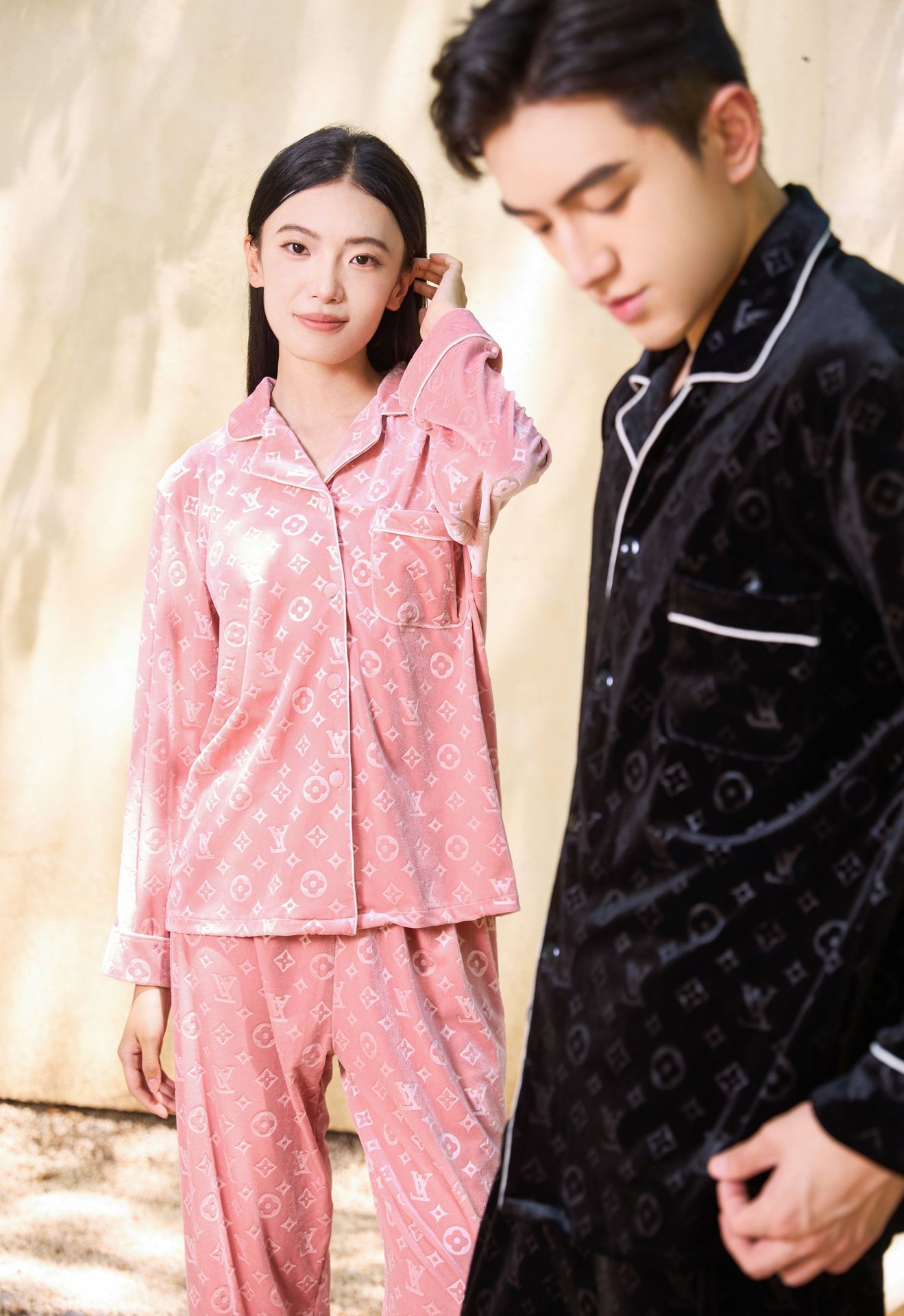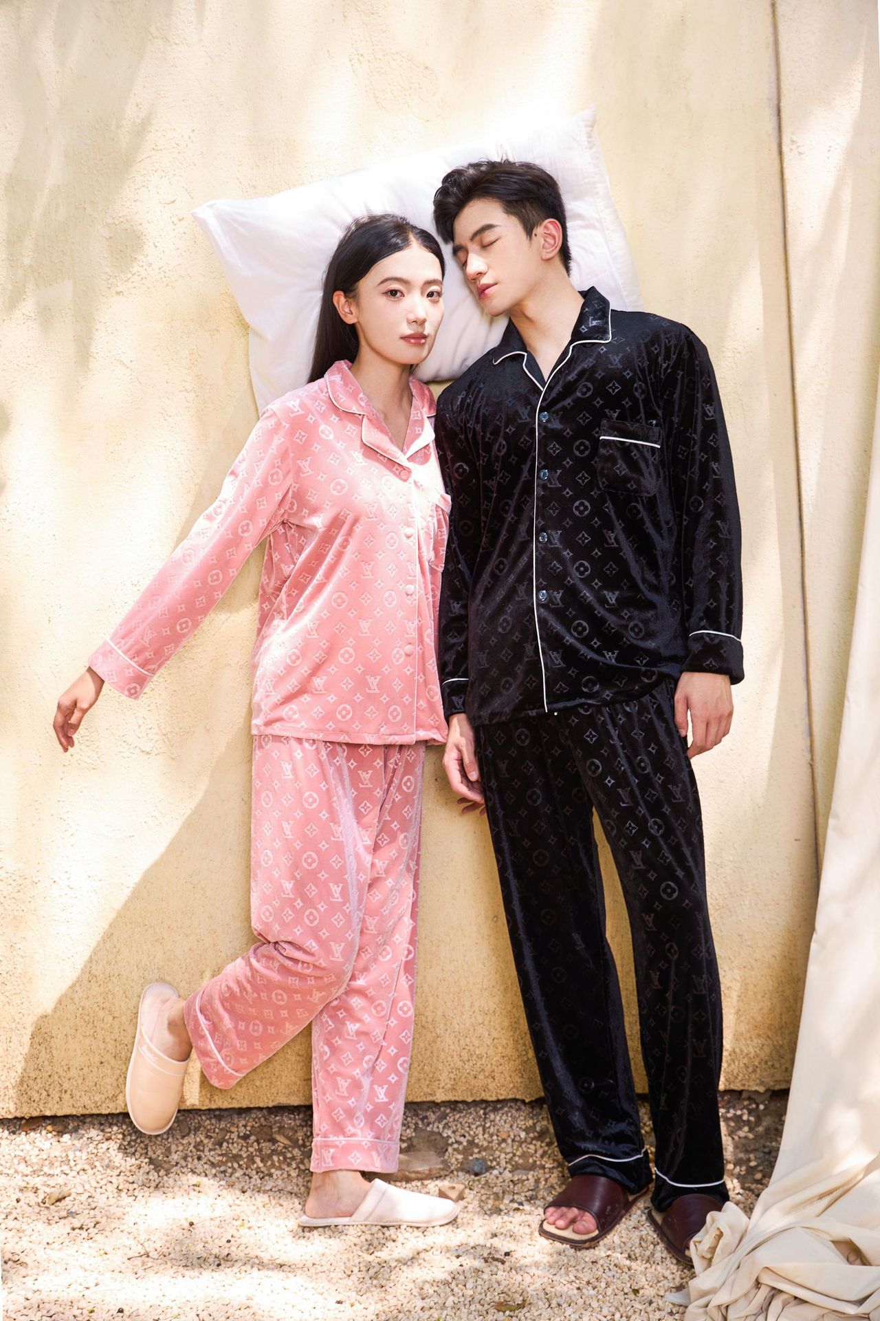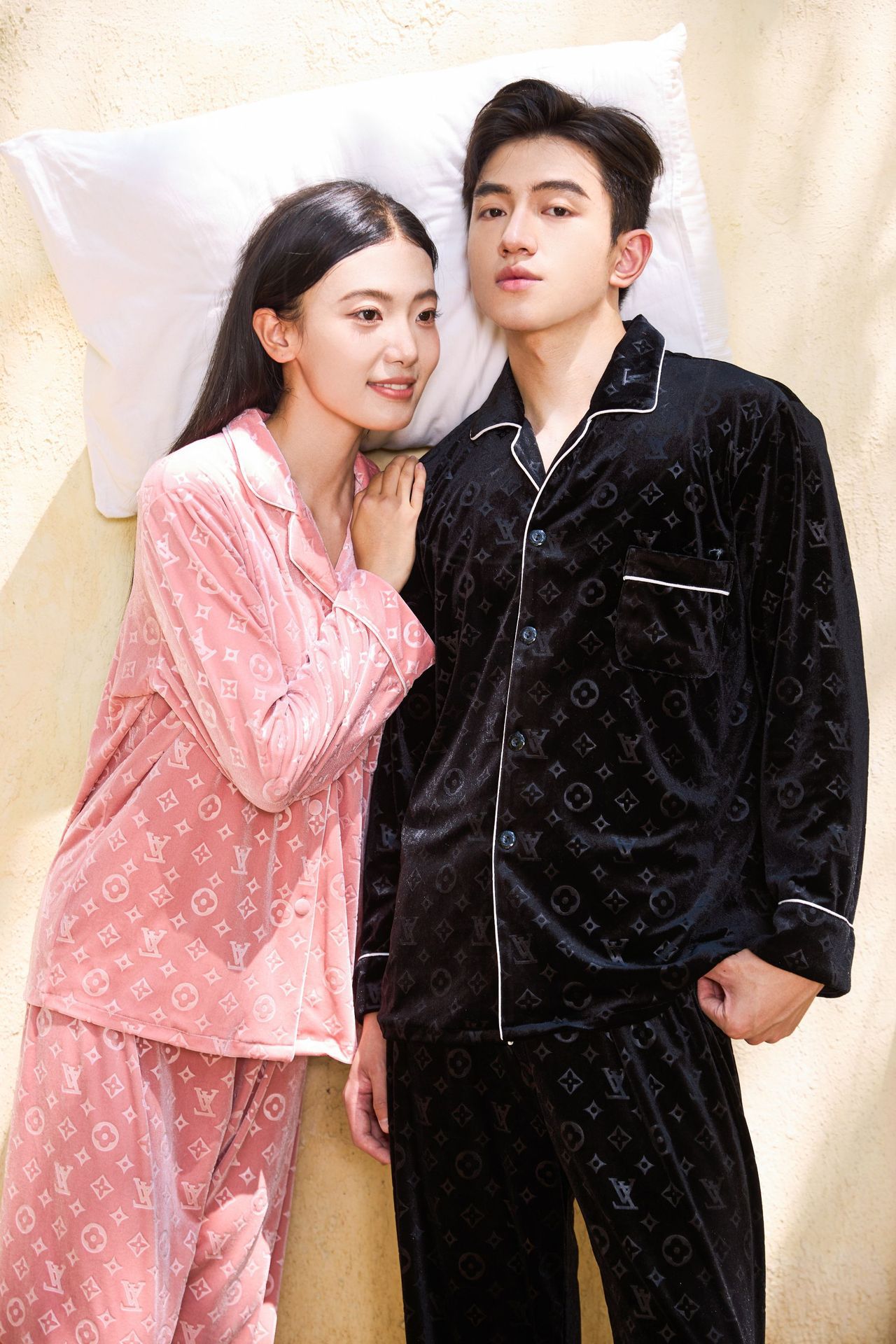 높은 모조 벨벳 파자마 여성 남성 카디건 엠보싱 벨벳 고급 긴 소매 가을과 겨울 커플 홈 의류 세트