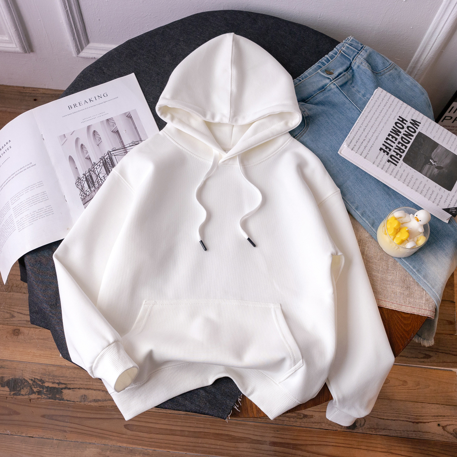 • 흰색 긴팔 후드 포켓 스웨트셔츠