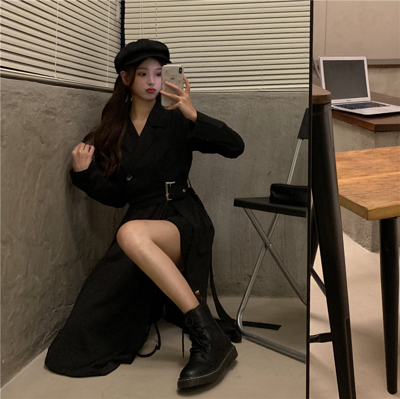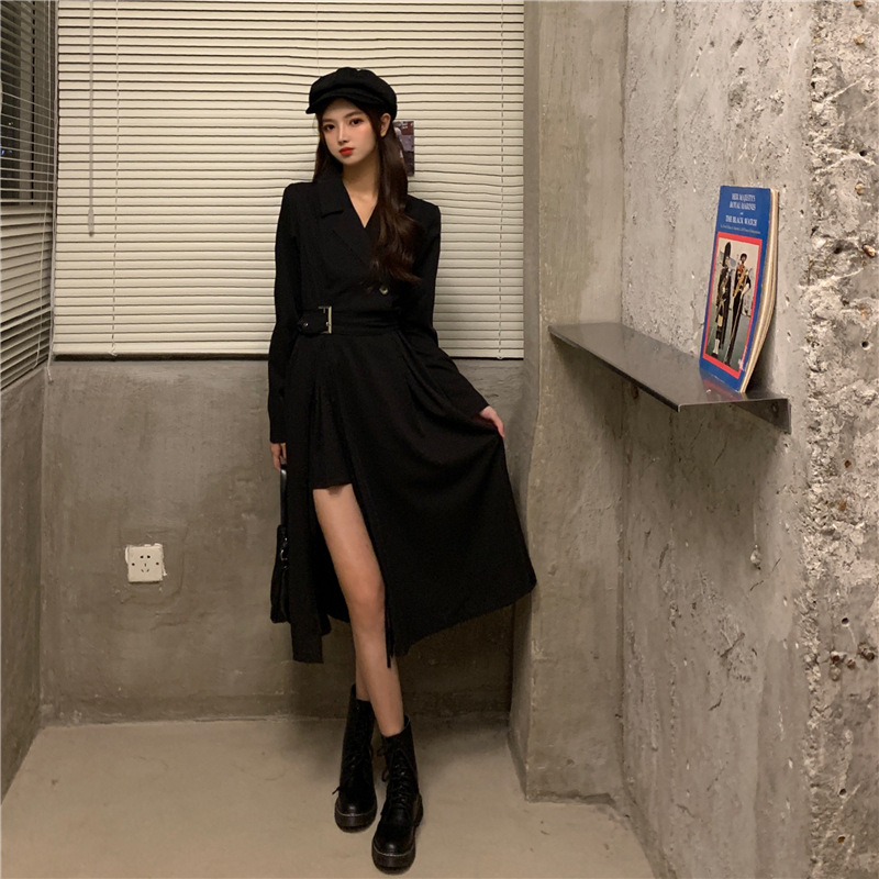 [벨트로] 프랑스 원피스 2024 봄과 가을 한국 도시 새로운 허리 분할 검은 긴 소매 원피스스토어 가기