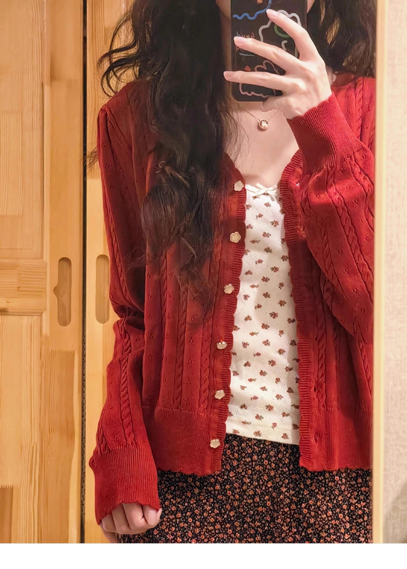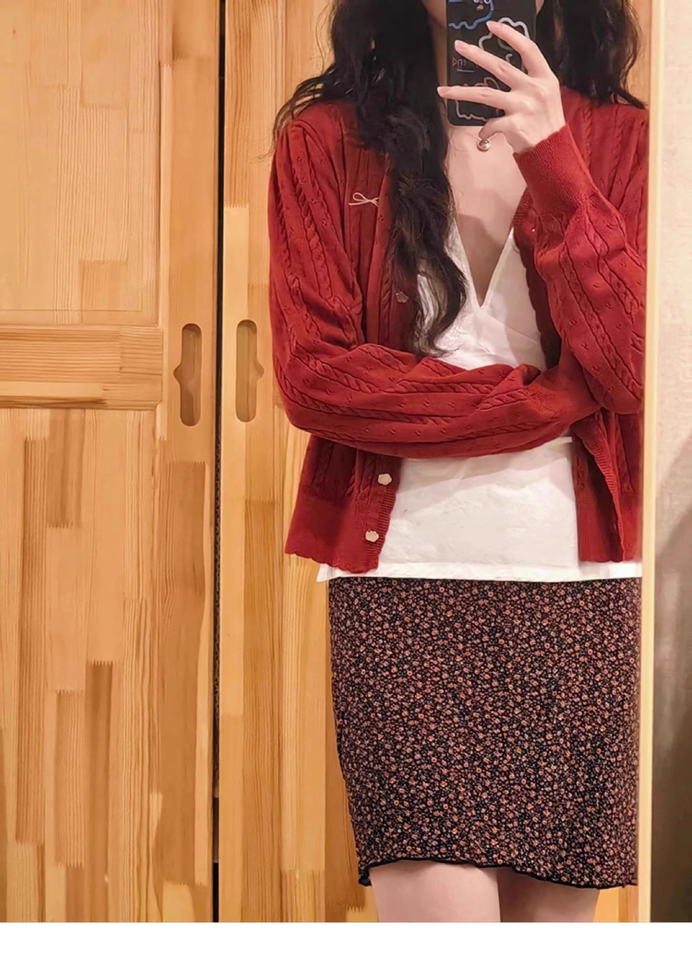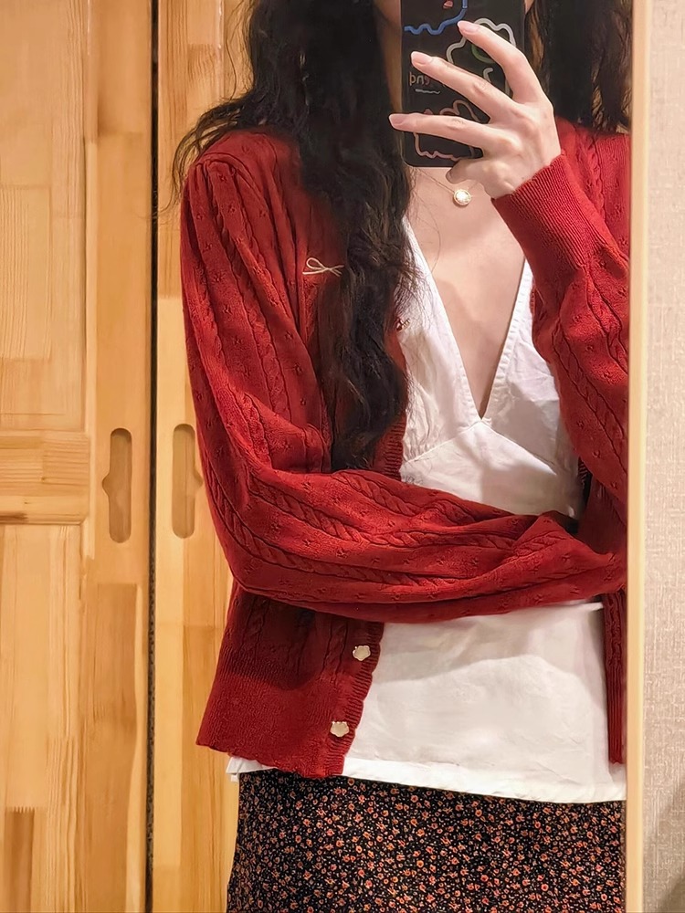 안코라 레드 자수 활 니트 카디건 여성 초가을 한국 트위스트 스웨터 쇼트 코트 샤넬 스타일 탑스토어 가기