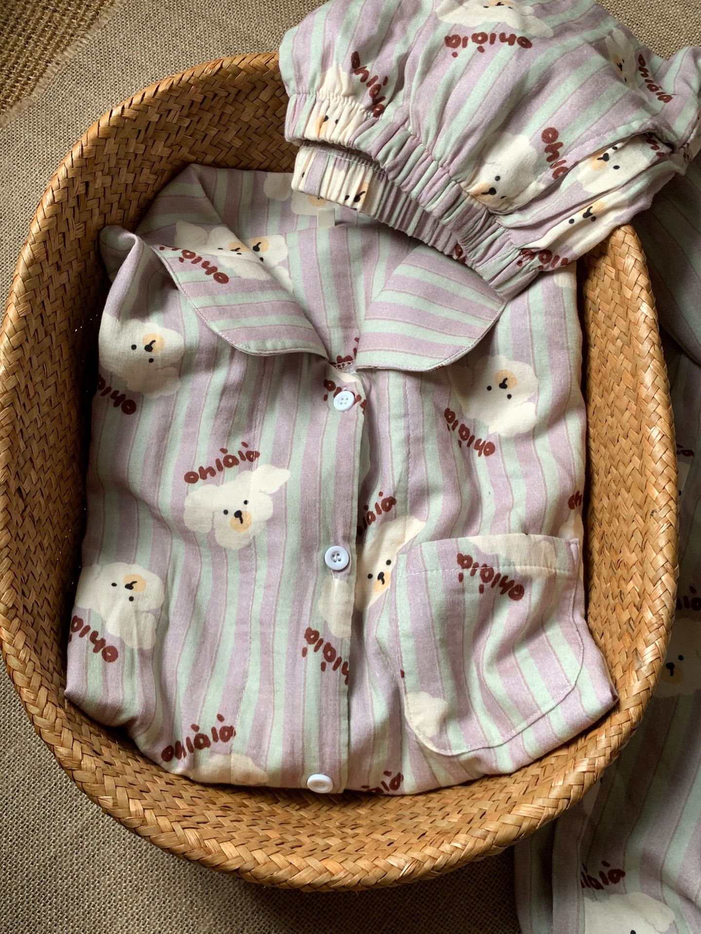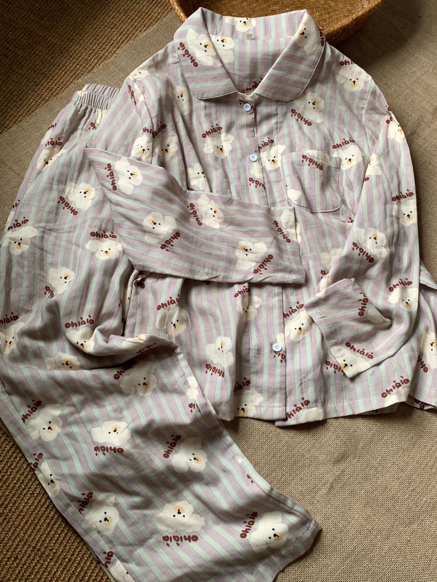 그린 스트라이프 알파벳 강아지~가을 신상품! 새로운 순면 기모 양복 부드럽고 왁시한 여성스러운 하트 파자마 루즈 홈