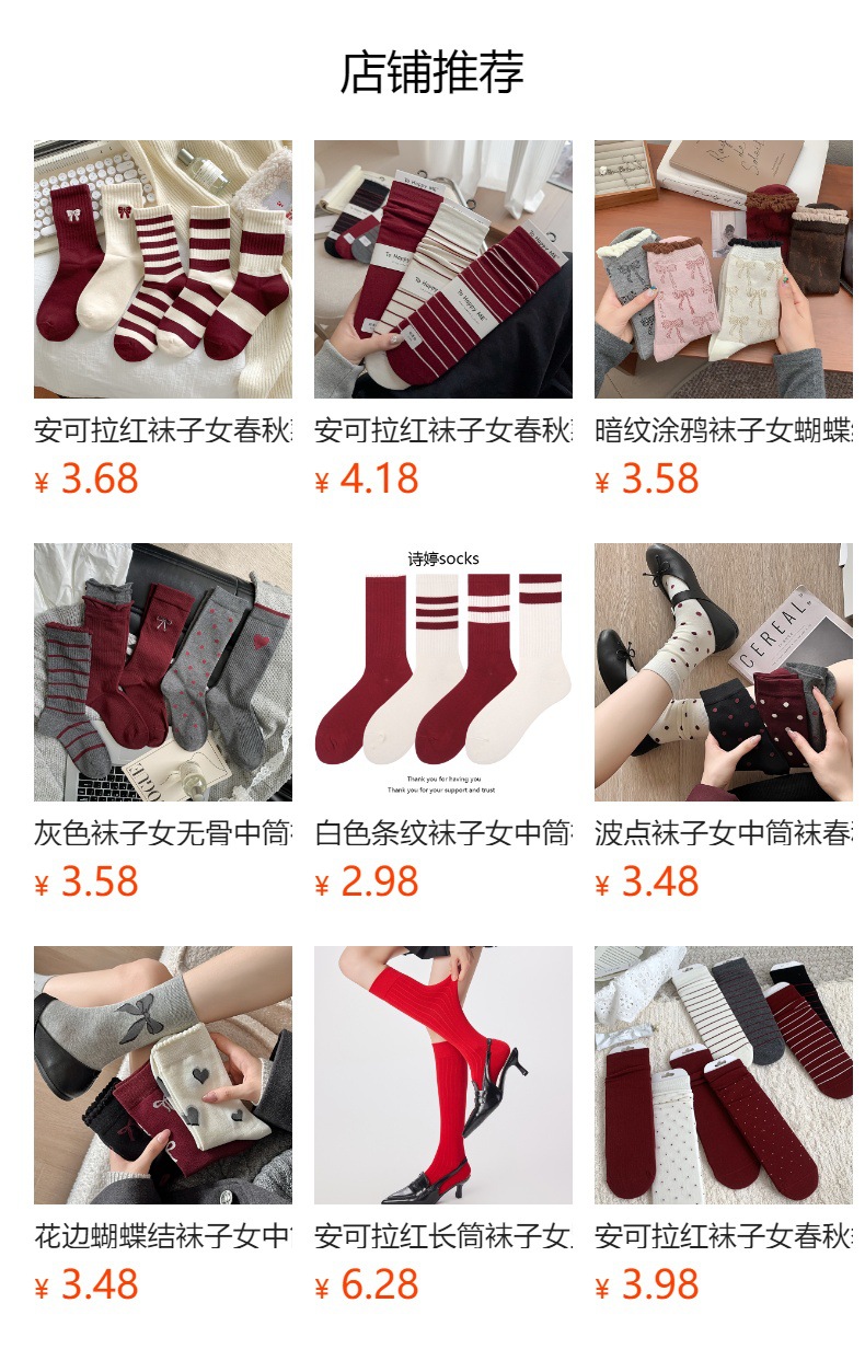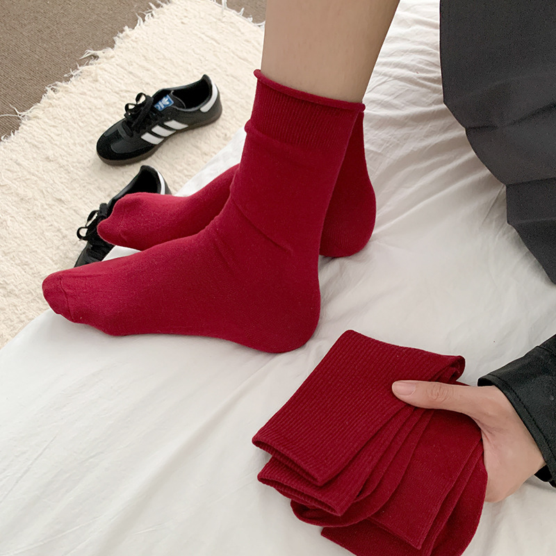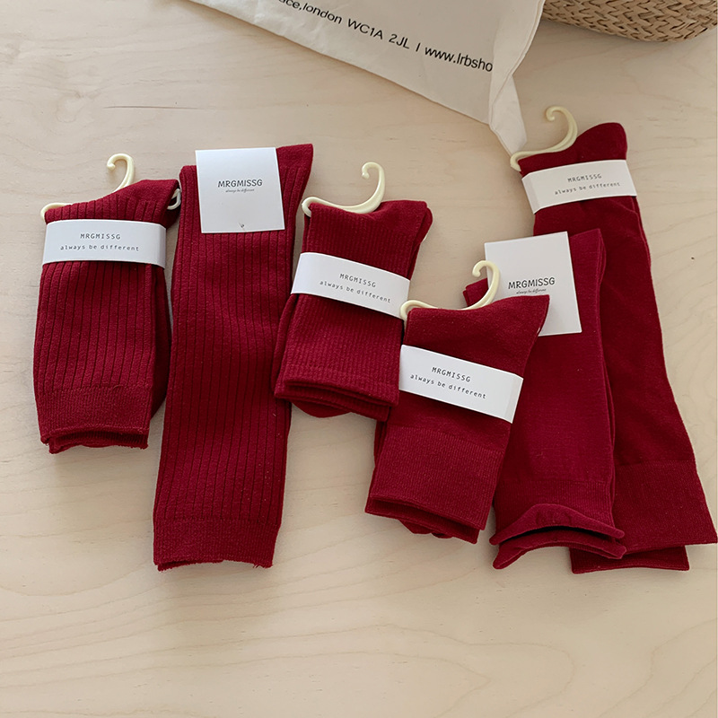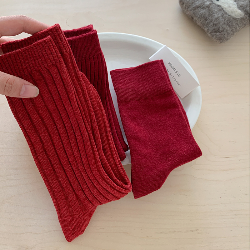 안코라 레드 송아지 양말 여성용 수직 줄무늬 중간 길이 양말 솔리드 컬러 봄과 가을 버건디 양말 슬리밍 스타킹스토어 가기