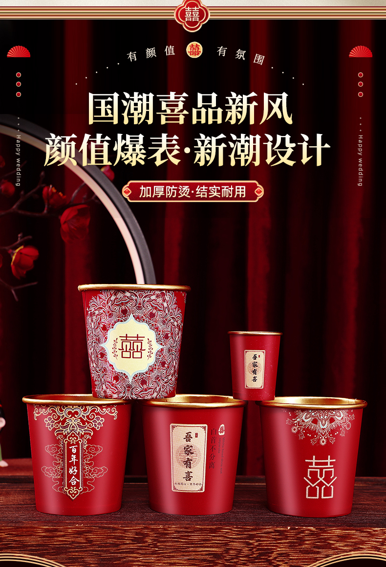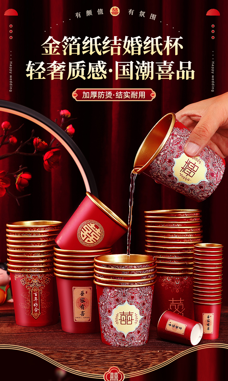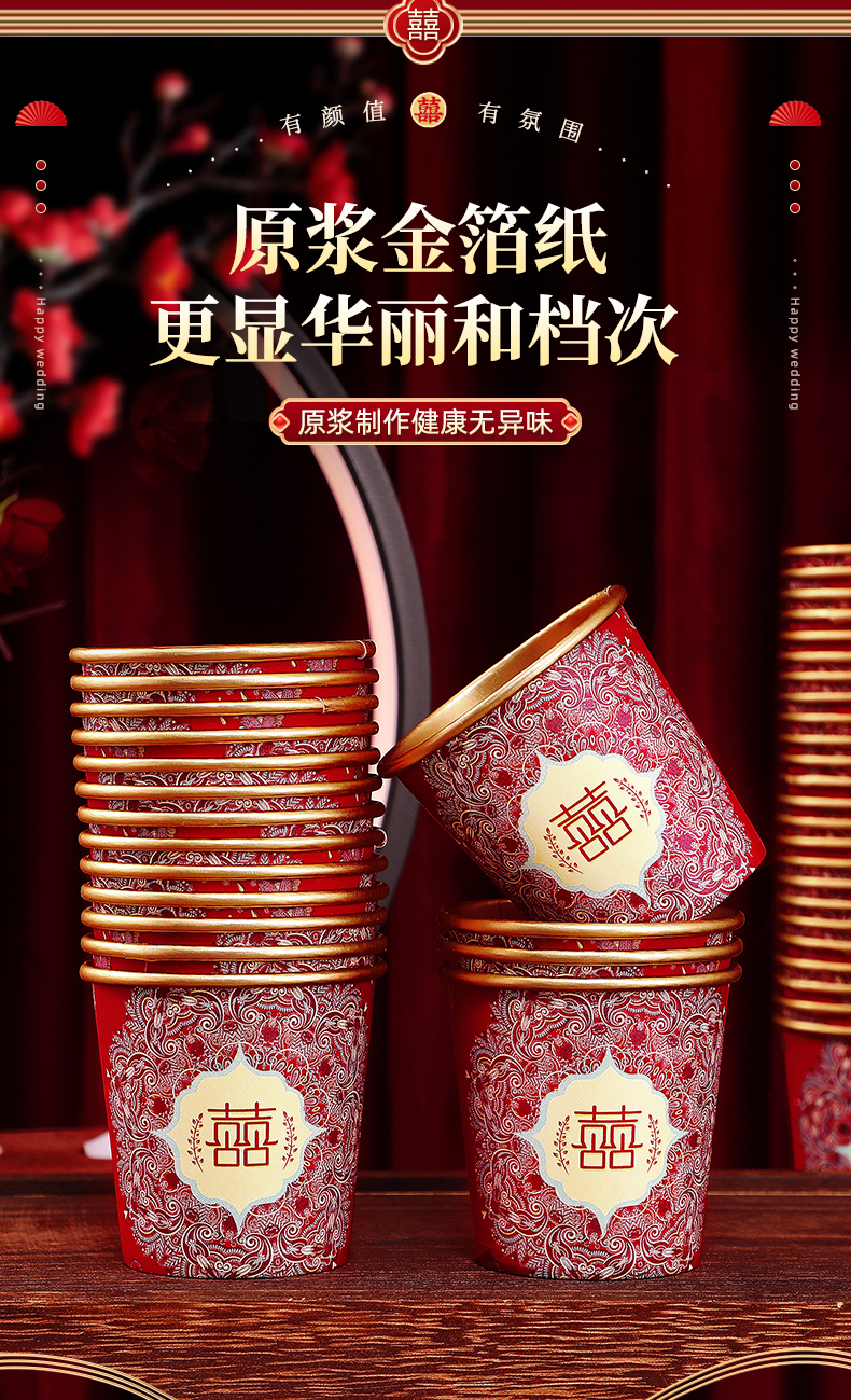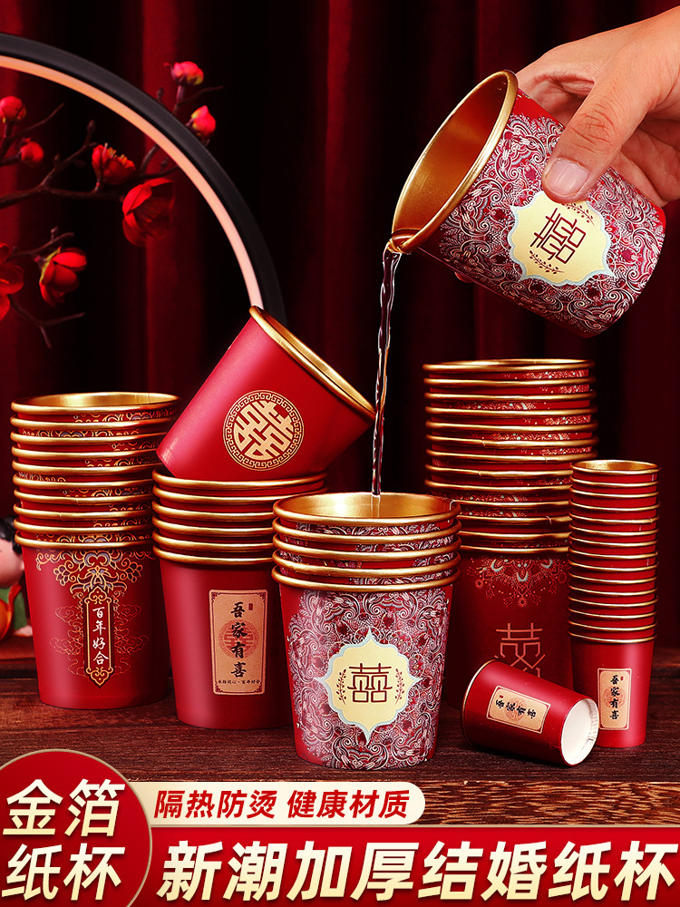 웨딩 페이퍼 컵 일회용 컵 결혼식 두꺼운 웨딩 연회 골드 호일 레드 웨딩 워터 컵 징 헝밍