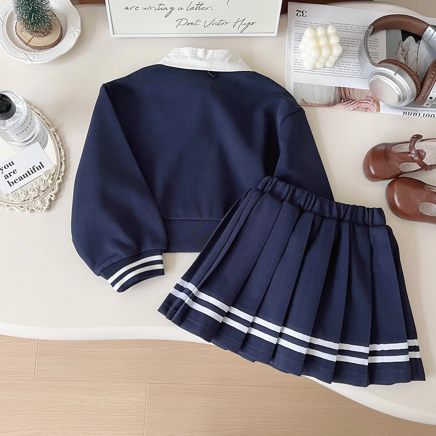 소녀 세트 2024 새로운 가을 어린이 서양식 유행 대학 스타일 JK 주름 치마 최고 유행 짧은 치마