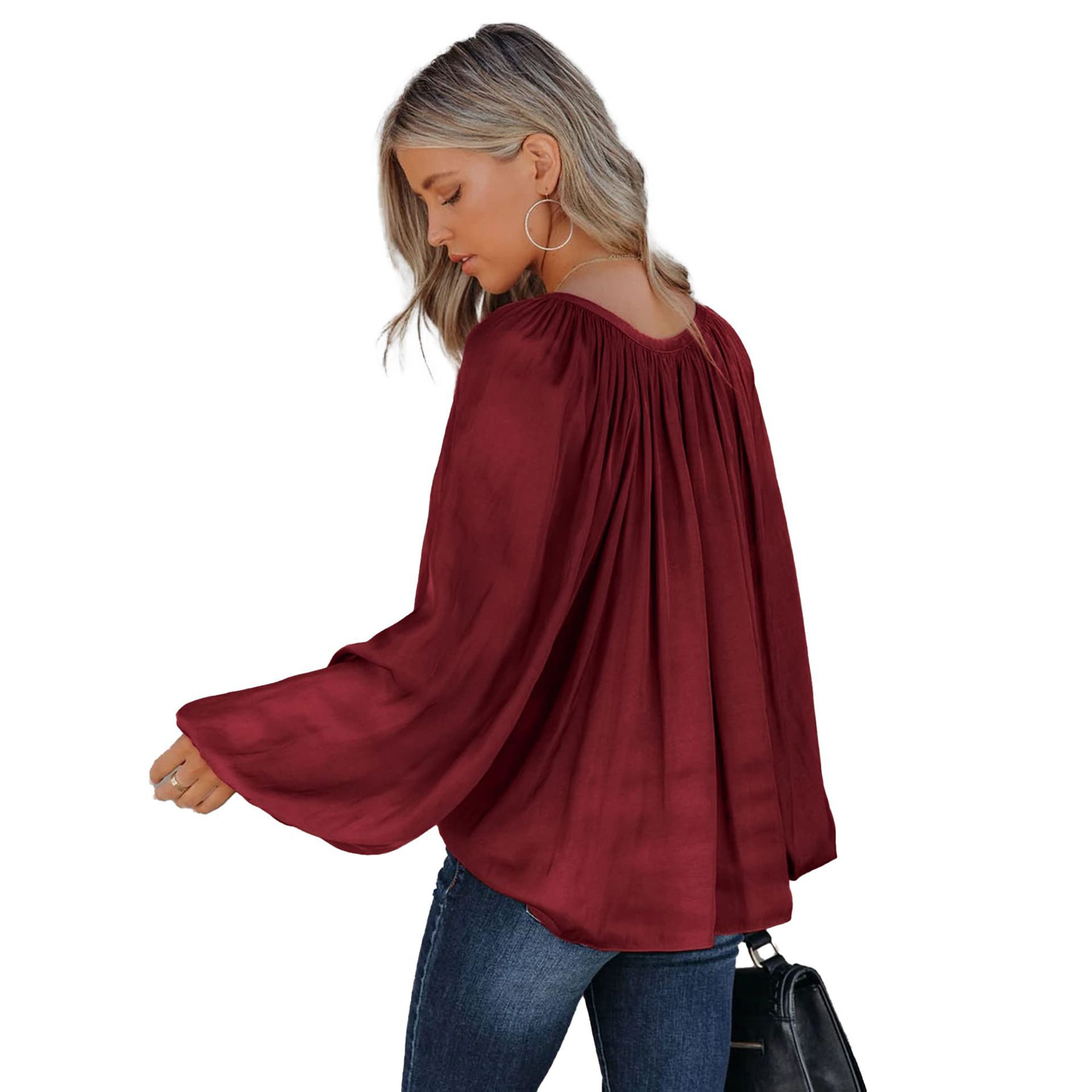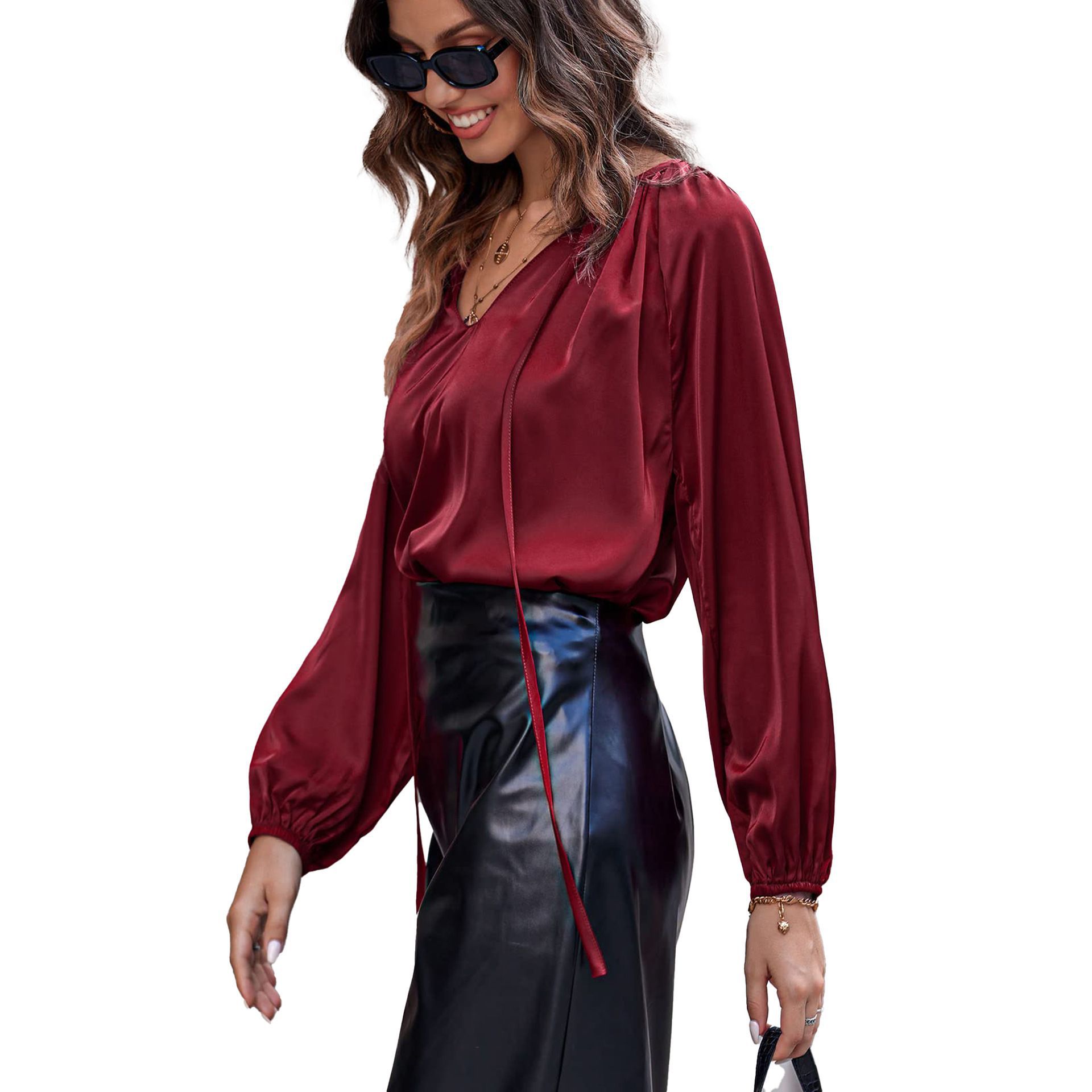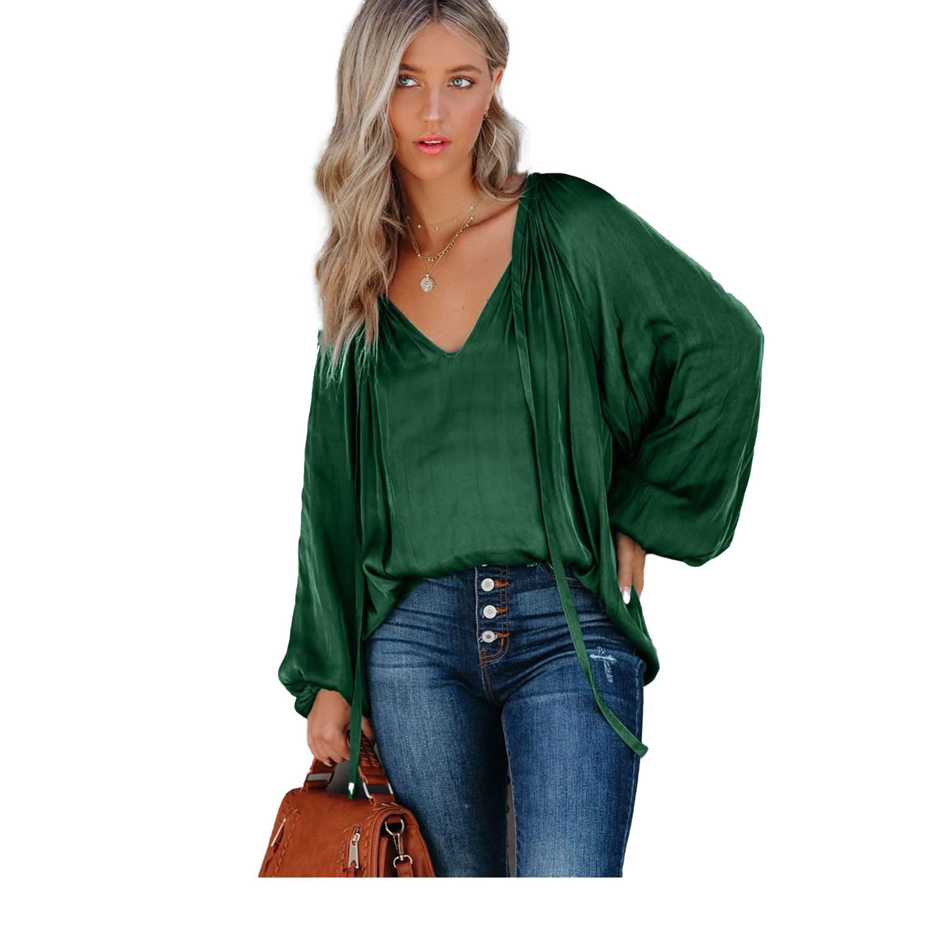 2024 아마존 국경 유럽 및 미국 새틴 실크 셔츠 여성용 랜턴 긴 소매 느슨한 V-넥 레이스 업 탑스토어 가기