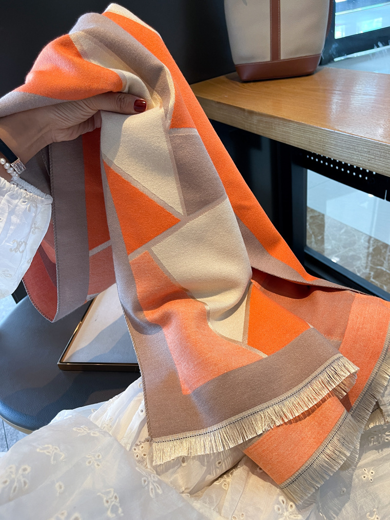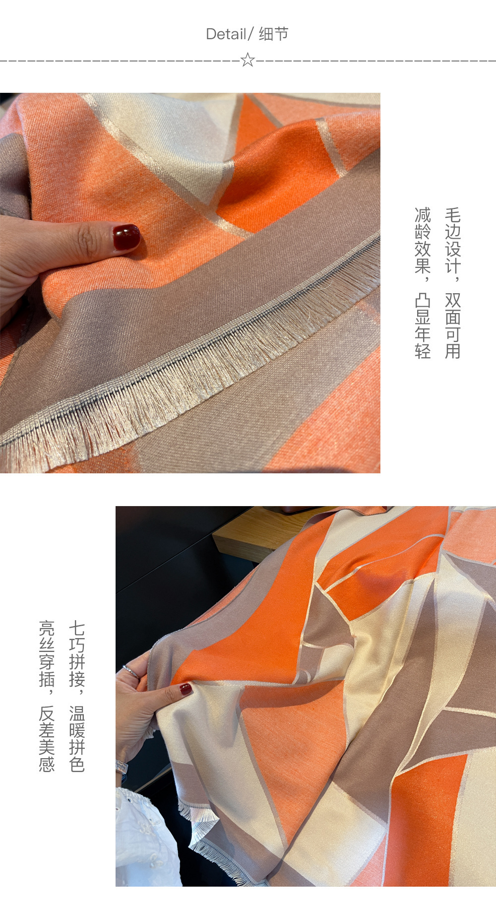 韩版百搭橘米几何拼色块毛边仿羊绒两用围巾女冬季保暖围脖长披肩
