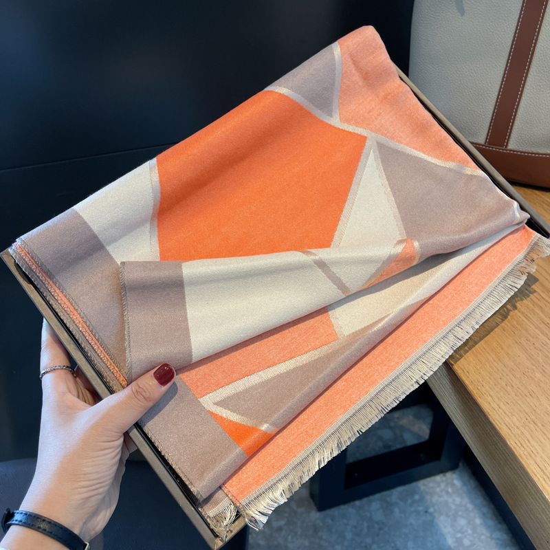 한국식 올매치 오렌지 라이스 기하학적 컬러 블록 모피 테두리 캐시미어 이중 목적 스카프 여자 겨울 따뜻한 목 긴 목도리