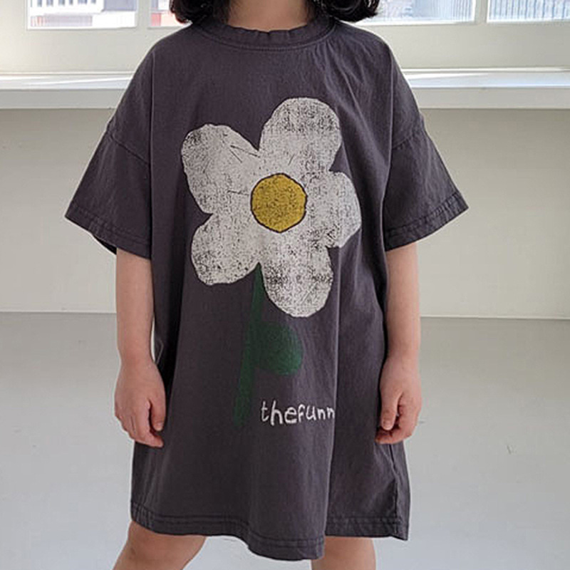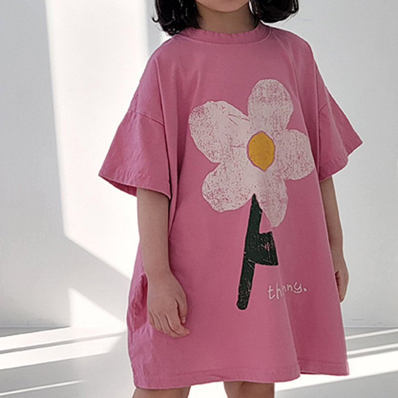 2024 아동복 어린이 인스타그램 스타일 여름 스커트 한국 스타일 소녀의 신선한 스타일 꽃 인쇄 반소매 긴 셔츠 티셔츠스토어 가기