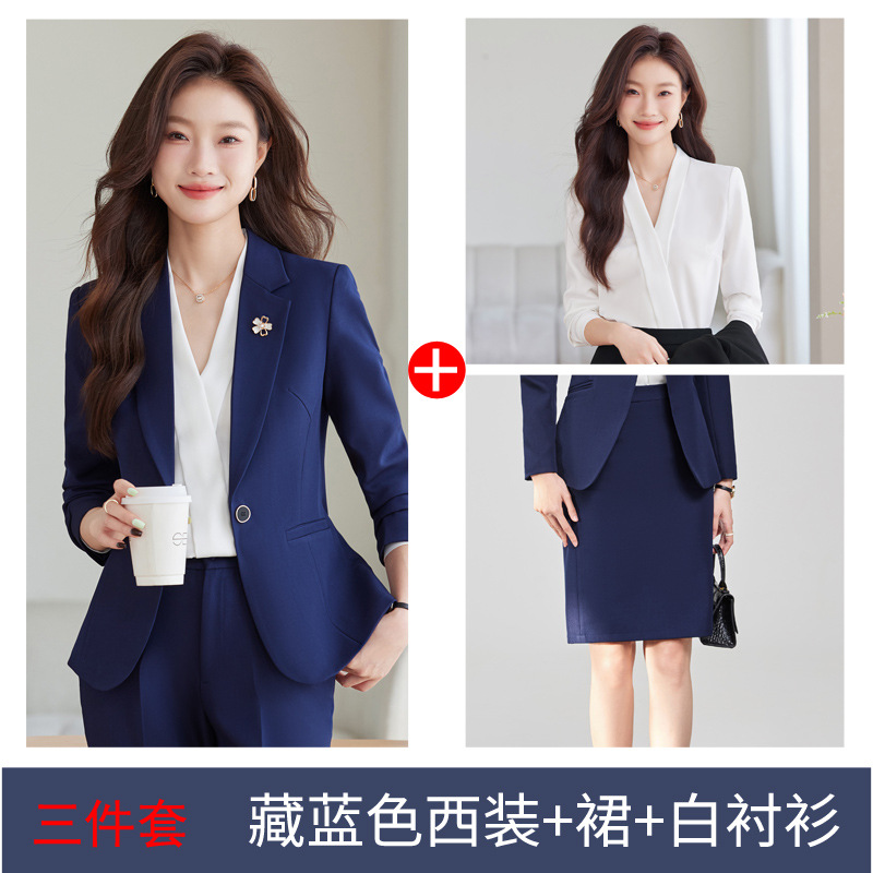 • 네이비 블루 재킷 + 3085 신축성 있는 중간 길이 스커트 + 689 흰색 셔츠
