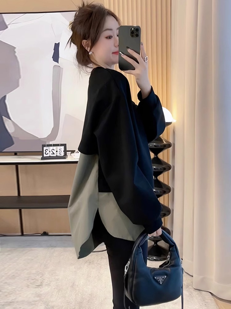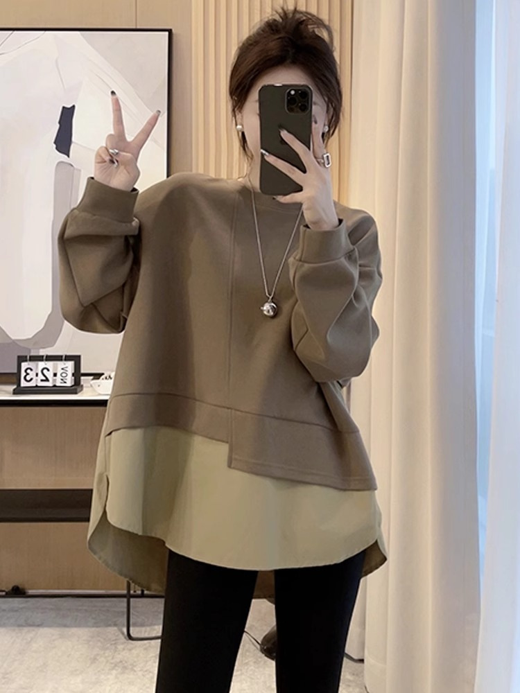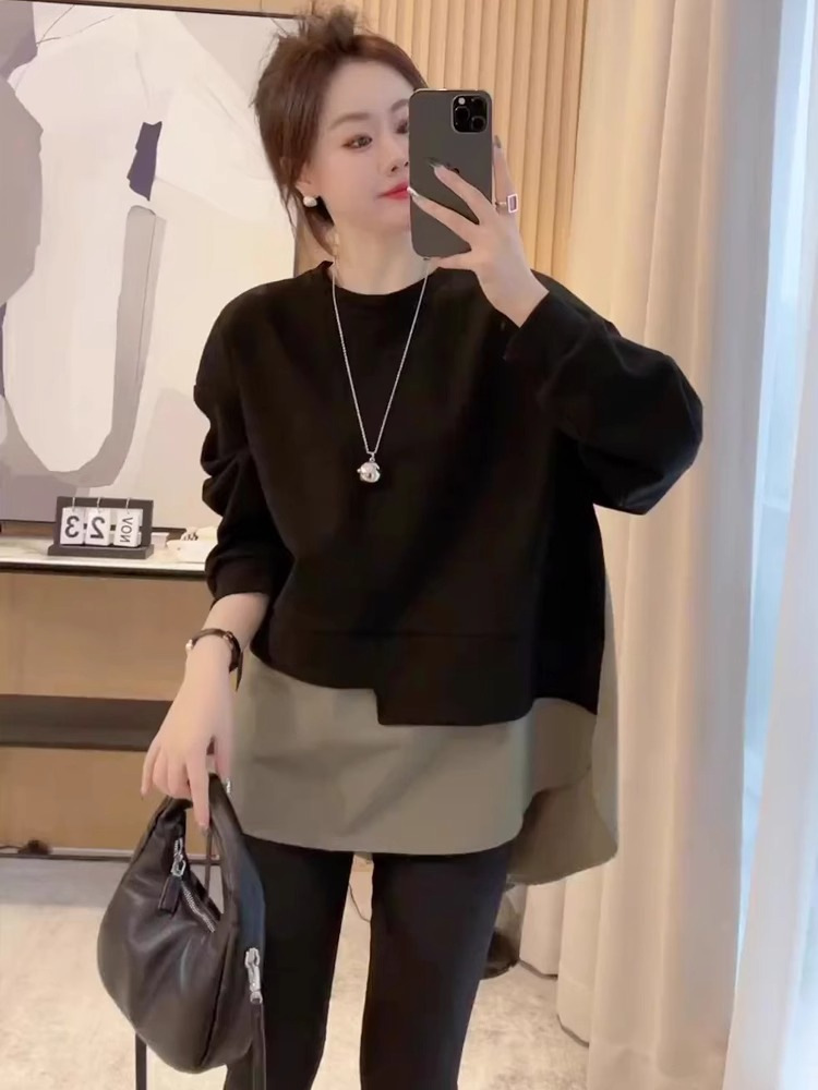 플러스 사이즈 여자 가을 중장 가짜 투피스 벨리 커버 슬리밍 스웨트 셔츠 여성용 루즈 탑 통통녀 1.00 kg-150.00 kg스토어 가기