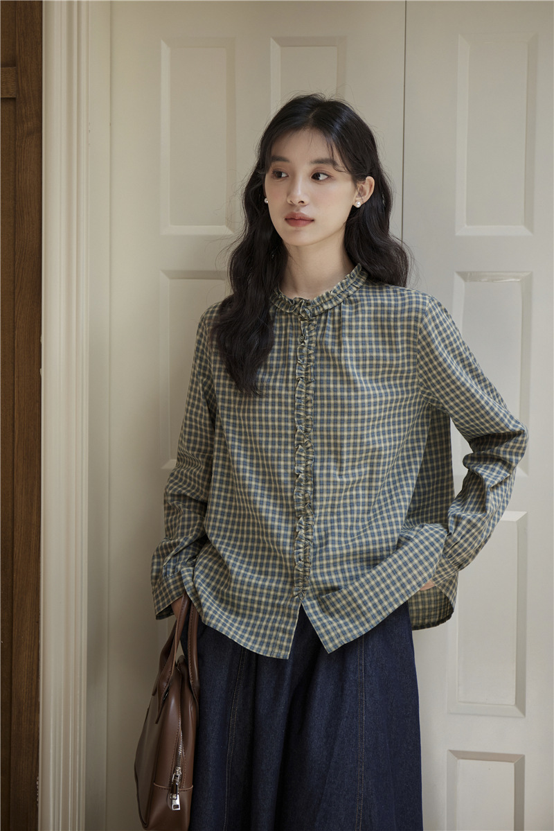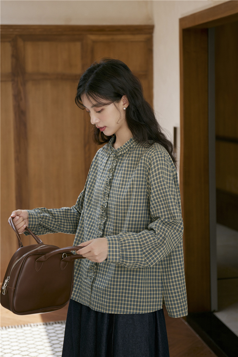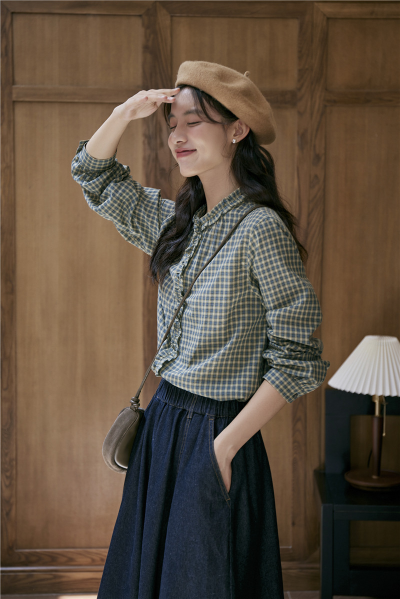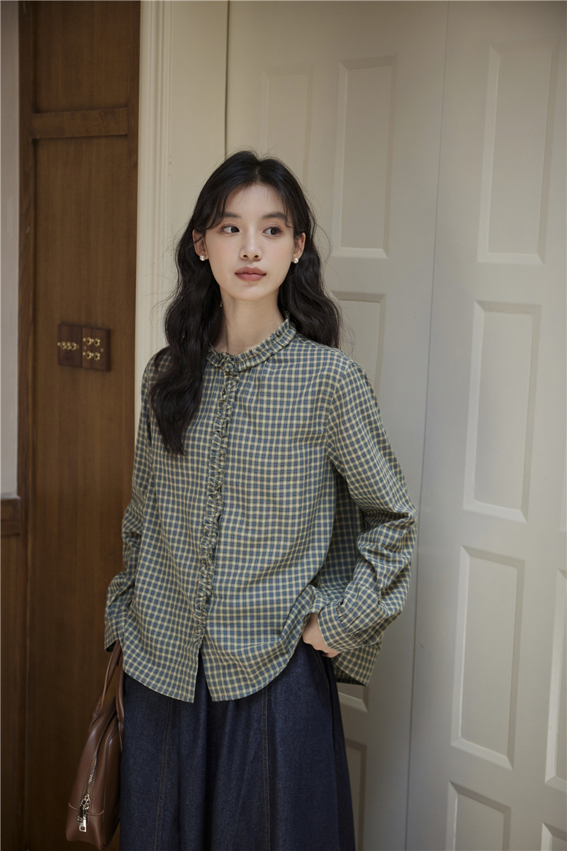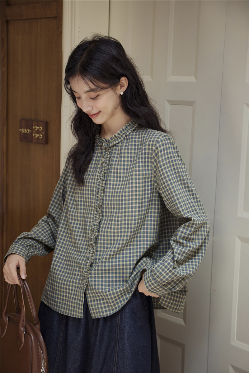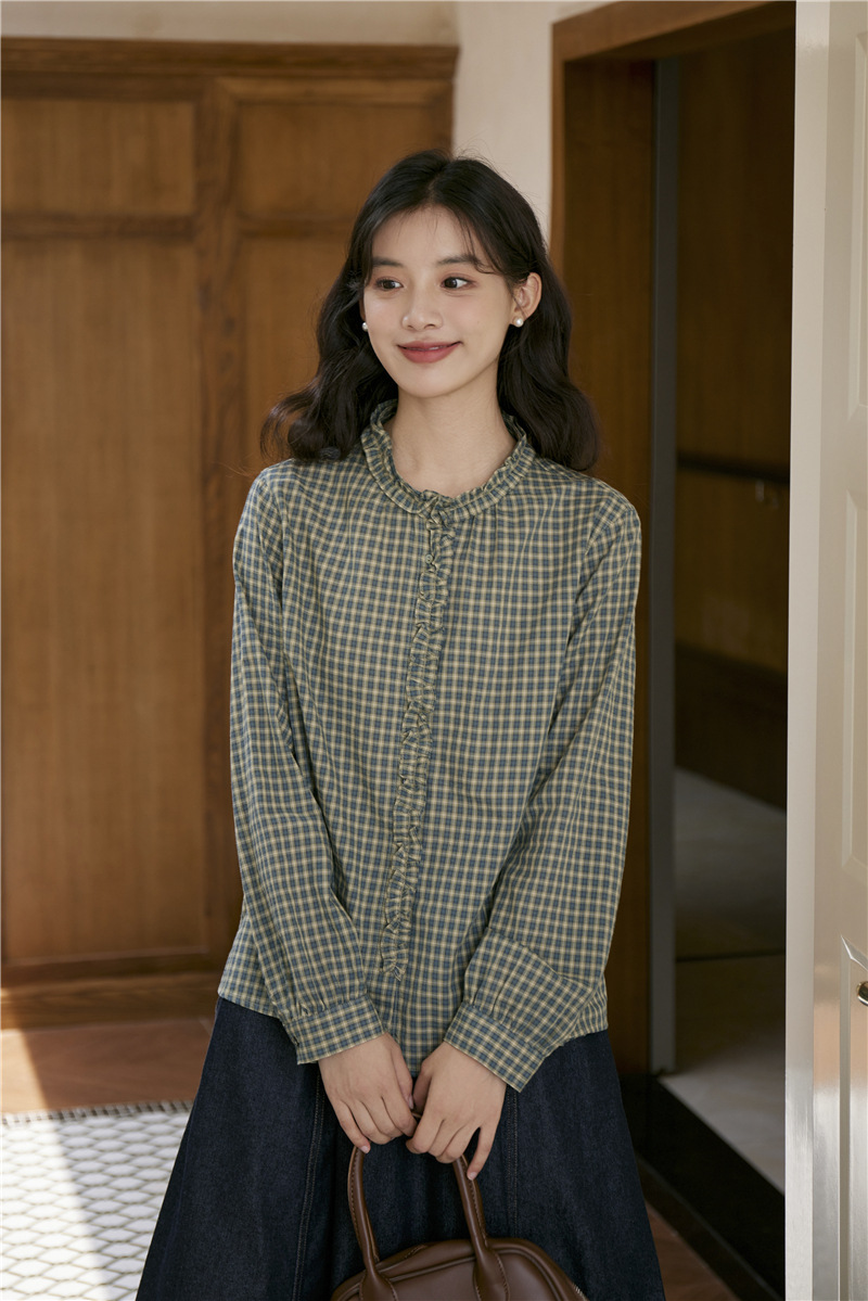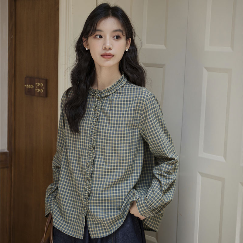 2025 가을 신상 일본풍 문예 스티치 라운드넥 녹색 체크무늬 레트로 긴팔 셔츠 여성용스토어 가기