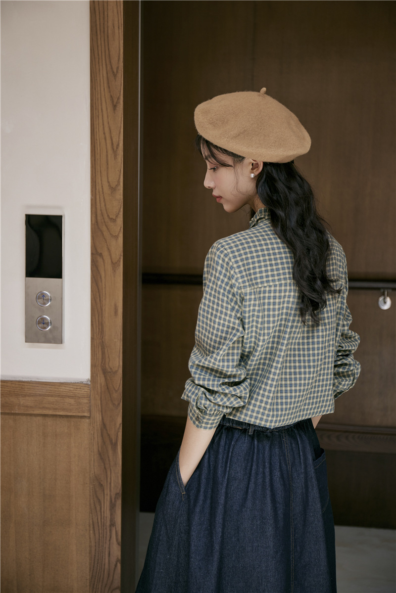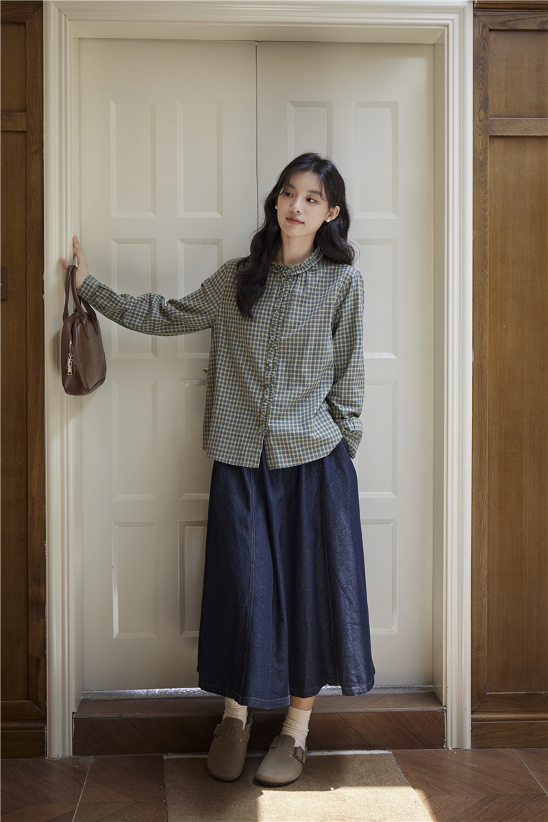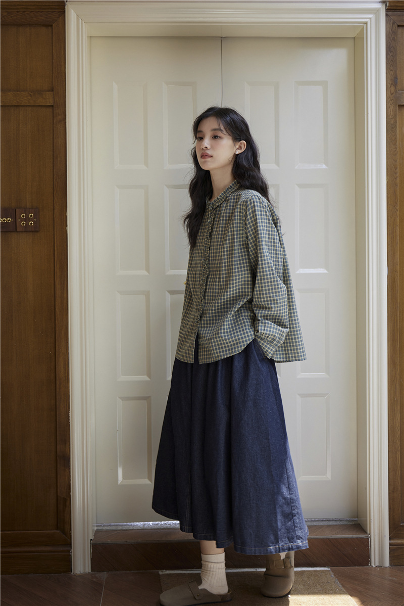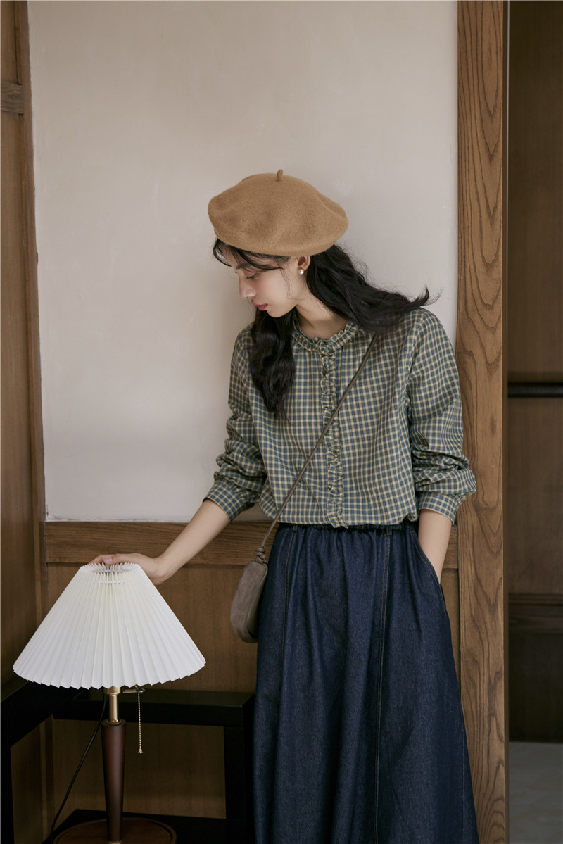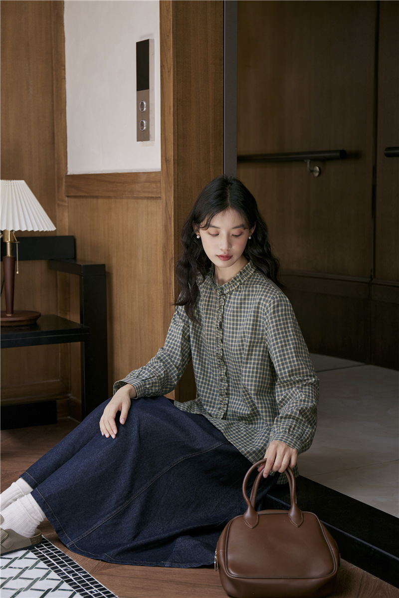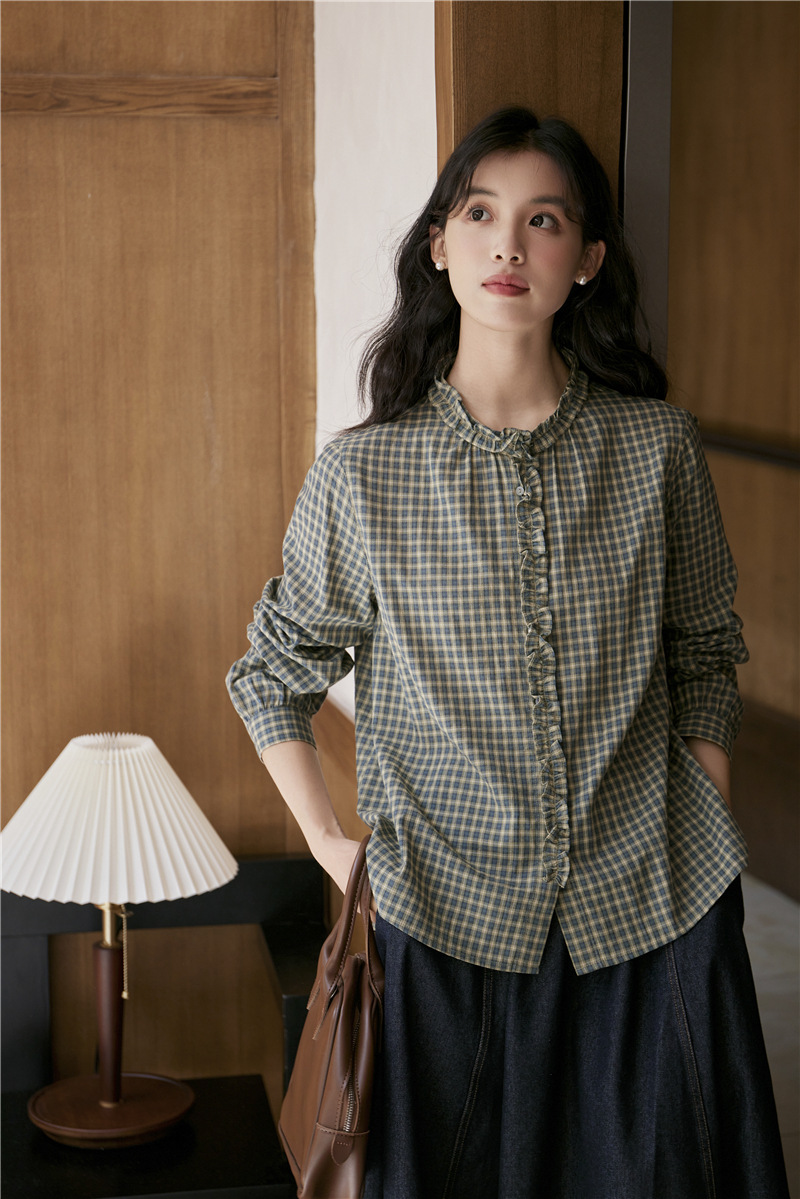 2025 가을 신상 일본풍 문예 스티치 라운드넥 녹색 체크무늬 레트로 긴팔 셔츠 여성용스토어 가기