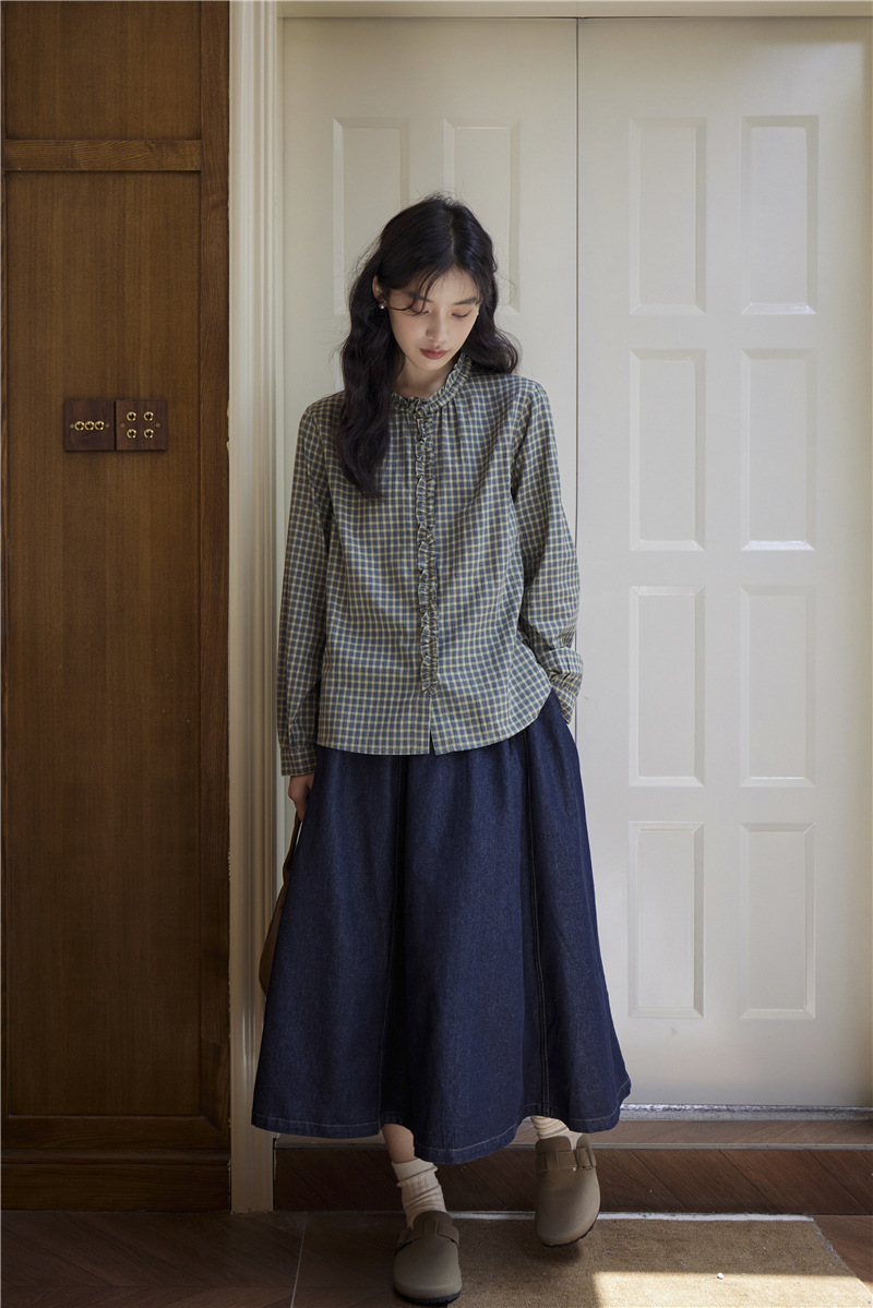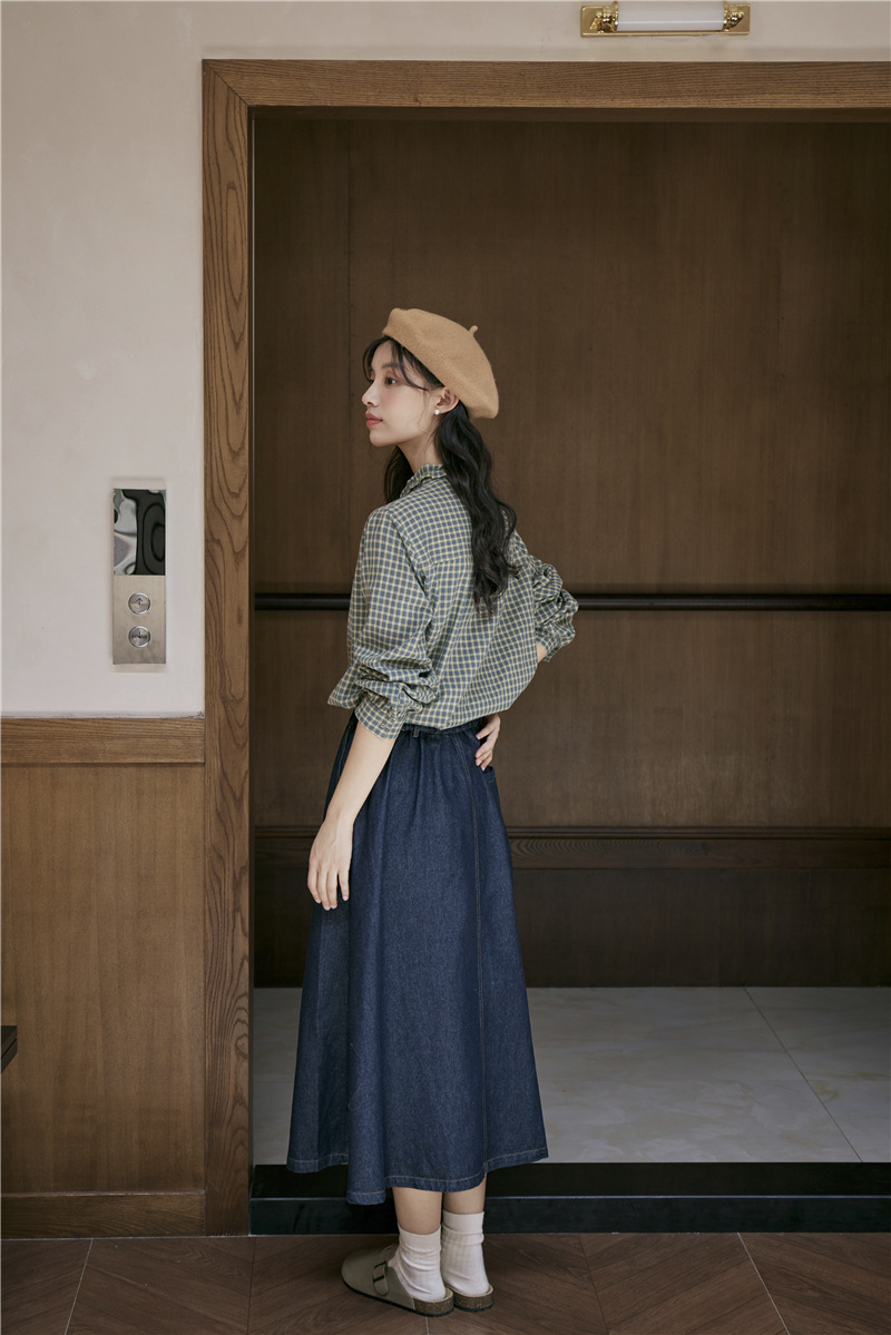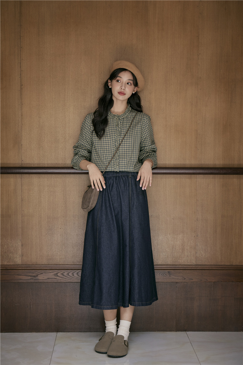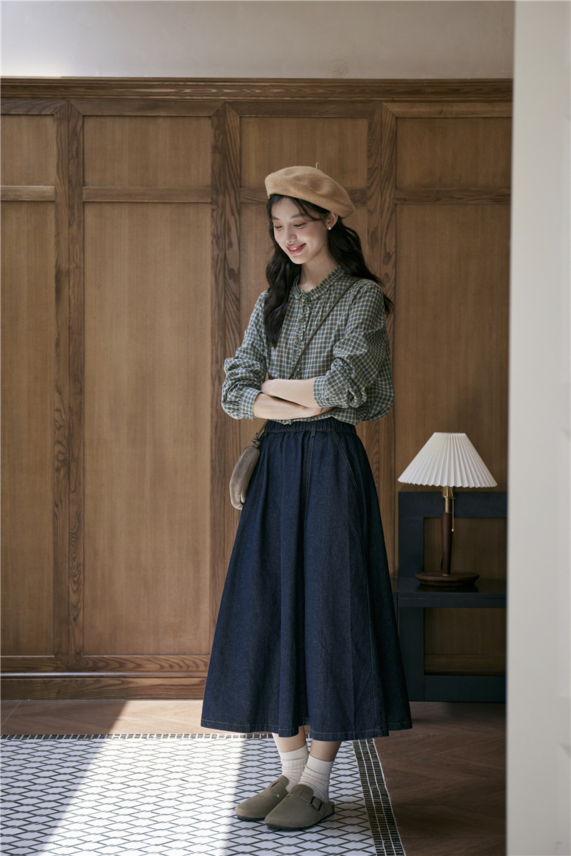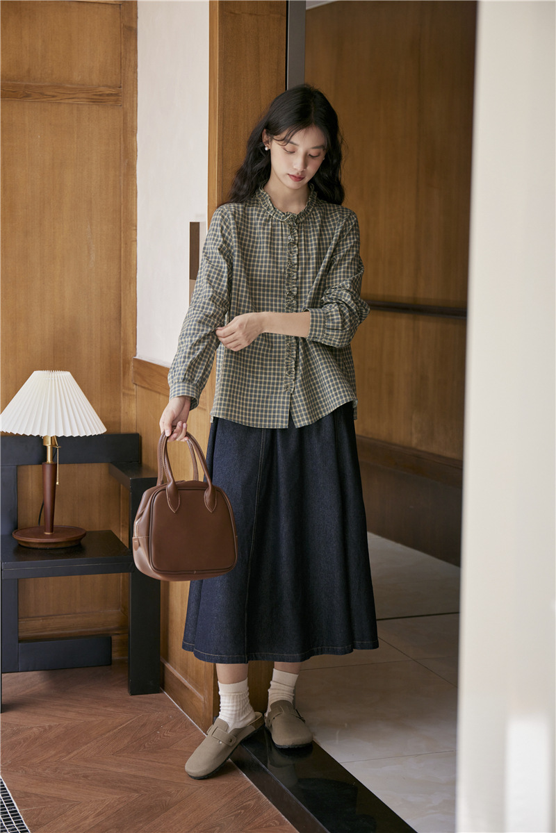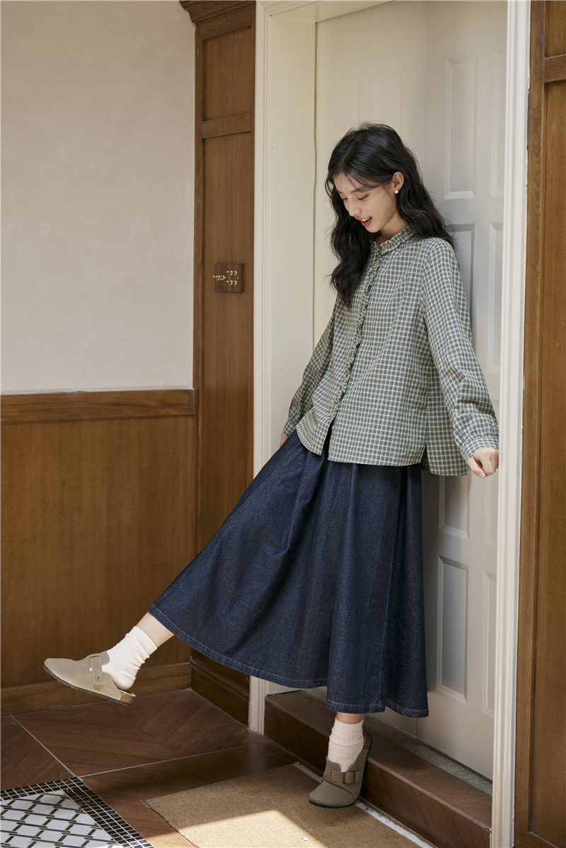 2025 가을 신상 일본풍 문예 스티치 라운드넥 녹색 체크무늬 레트로 긴팔 셔츠 여성용스토어 가기