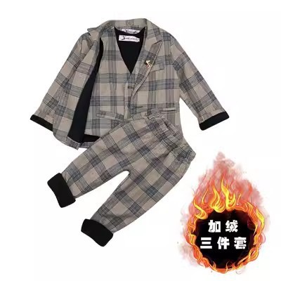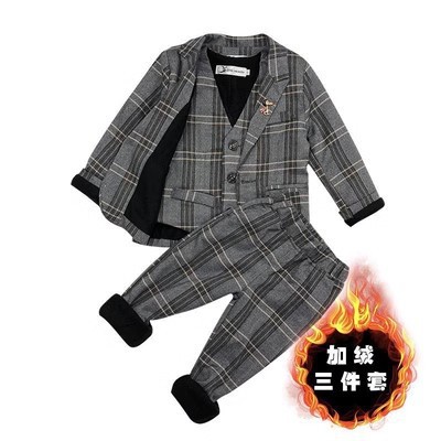 어린이 세트 세트 겨울 소년의 기모 4 피스 세트 플라워 보이 호스트 공연 옷 두꺼운 격자 무늬 트렌디