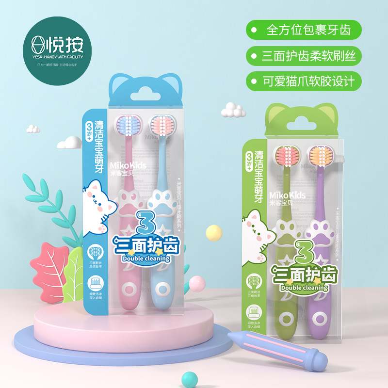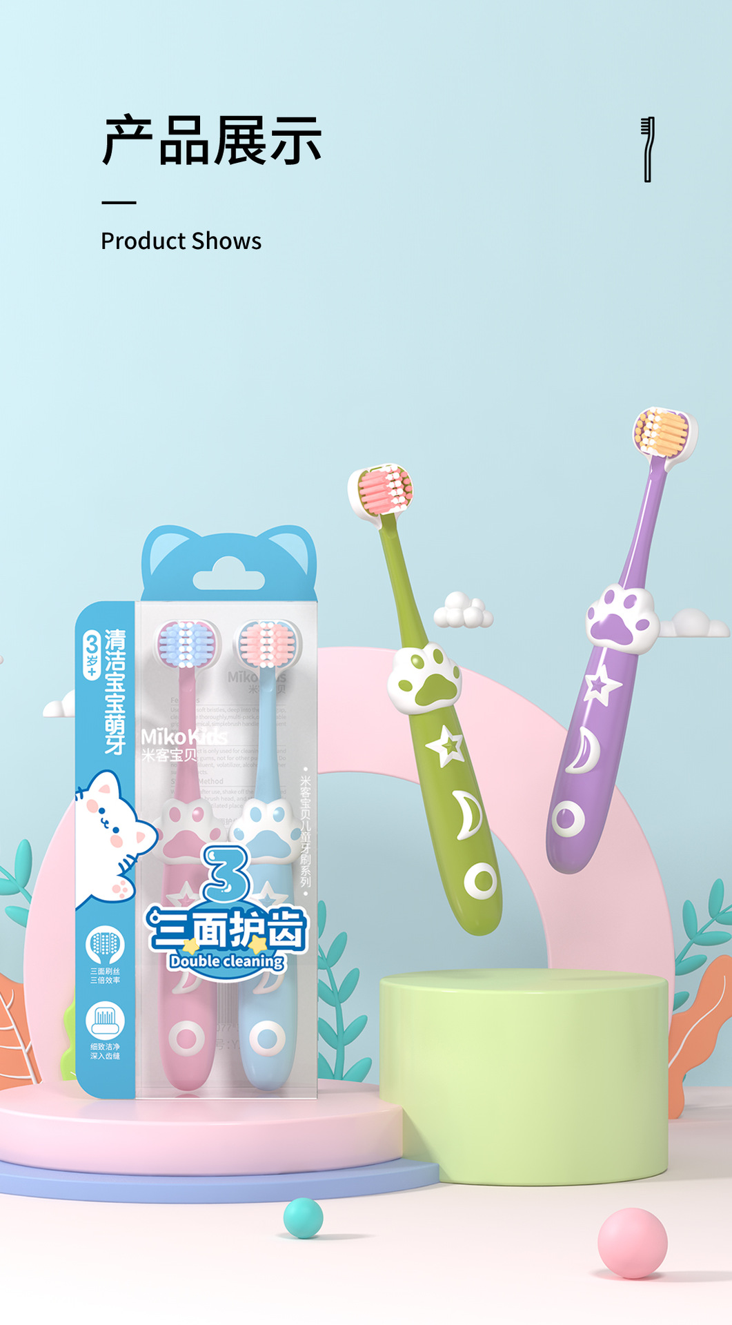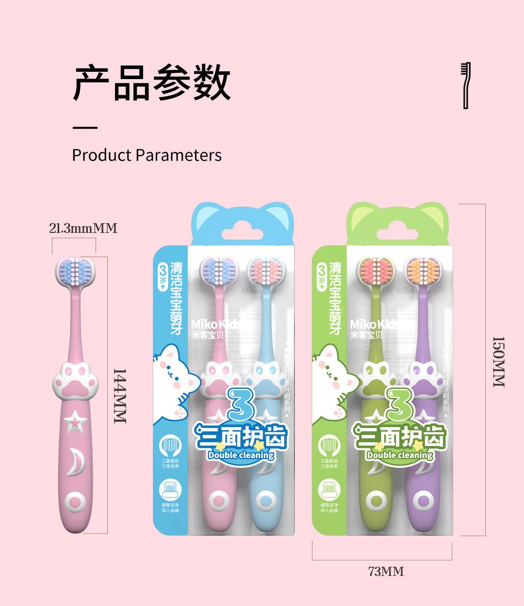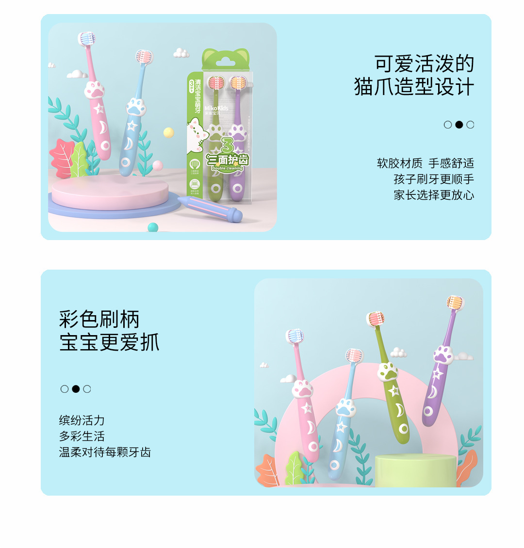 어린이 부드러운 강모 칫솔 3 면 치아 보호 칫솔 귀여운 고양이 발톱 모양 치아 청소 치은 보호 제조 업체 도매 더블