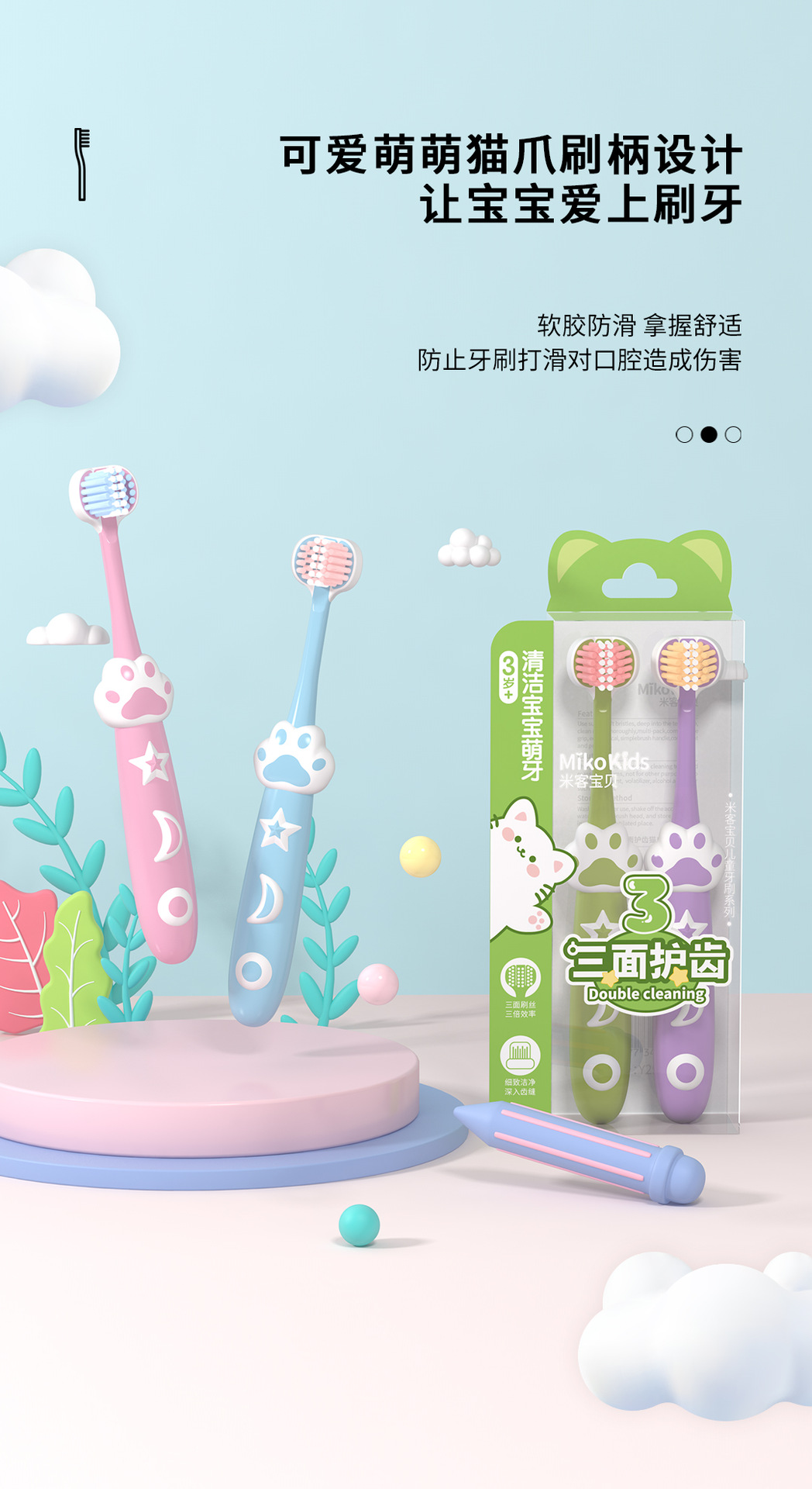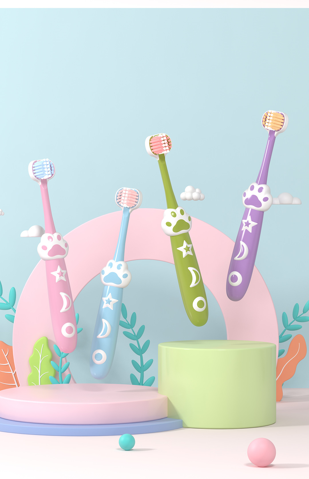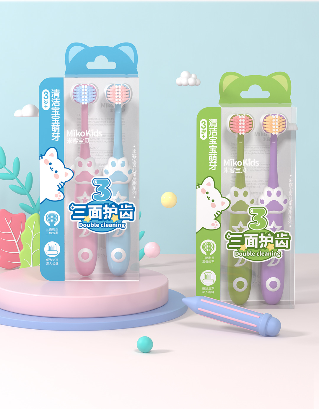 어린이 부드러운 강모 칫솔 3 면 치아 보호 칫솔 귀여운 고양이 발톱 모양 치아 청소 치은 보호 제조 업체 도매 더블