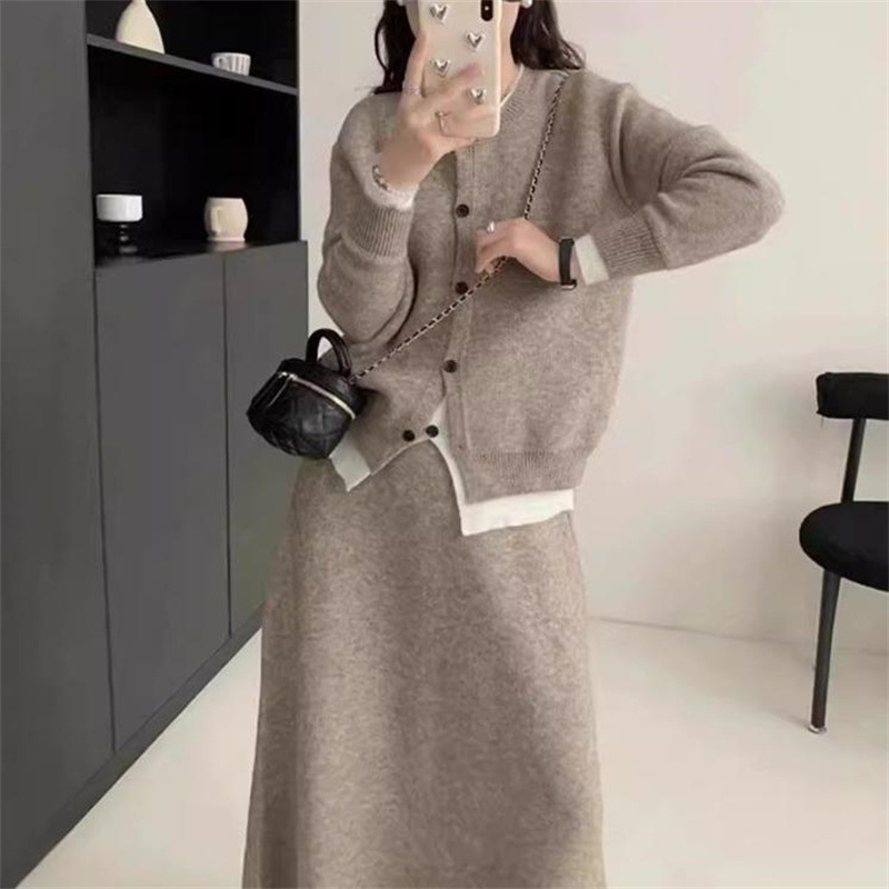 가짜 투피스 니트 스커트 세트 여성의 가을과 겨울 새로운 패션 콘트라스트 카디건 탑 스커트 캐주얼 투피스 세트