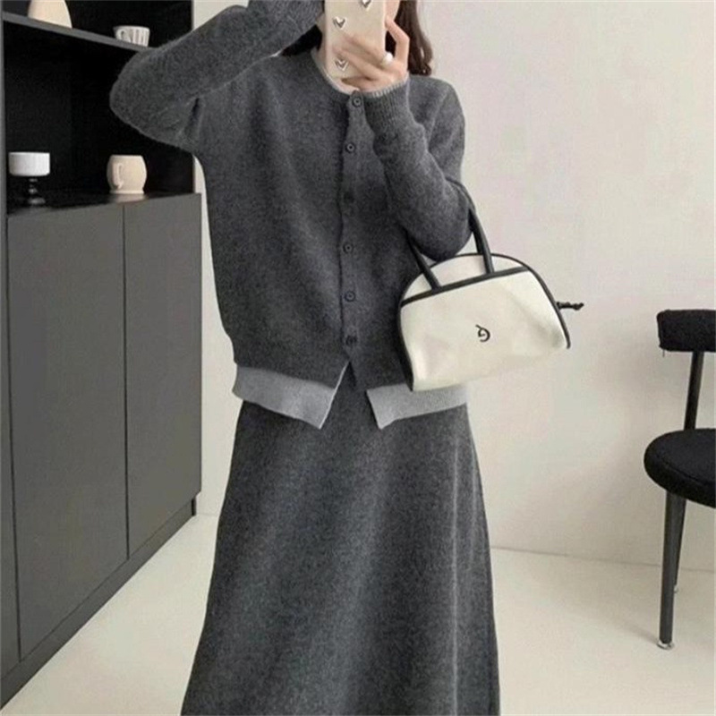 가짜 투피스 니트 스커트 세트 여성의 가을과 겨울 새로운 패션 콘트라스트 카디건 탑 스커트 캐주얼 투피스 세트스토어 가기