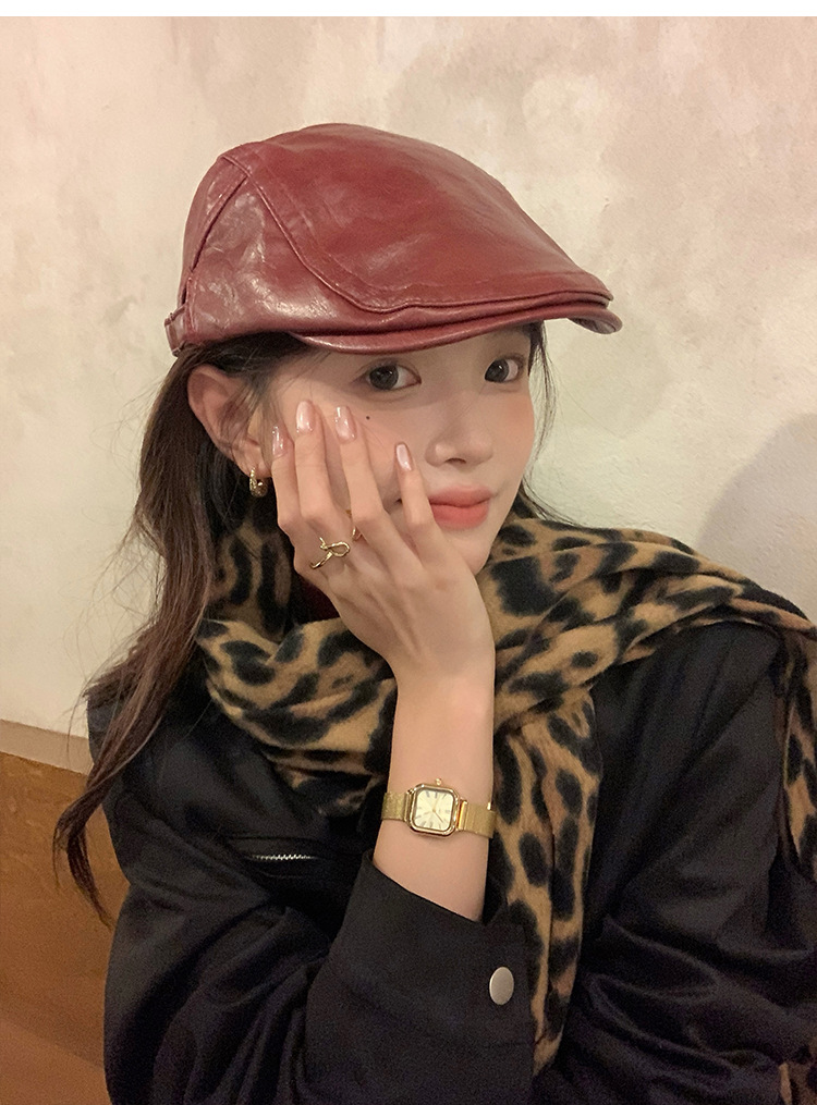 아메리칸 스타일 레트로 PU 가죽 포워드 모자 Ancora Red Women's 2024 가을 및 겨울 얼굴 작은 올 매치 안티 착용 화가 모자스토어 가기