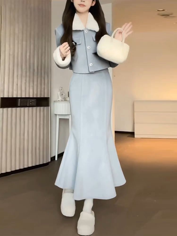 2024 가을과 겨울 작은 향기로운 스타일의 고급 세트 여성들은 두꺼운 피쉬 테일 긴 치마 세트를 착용합니다.