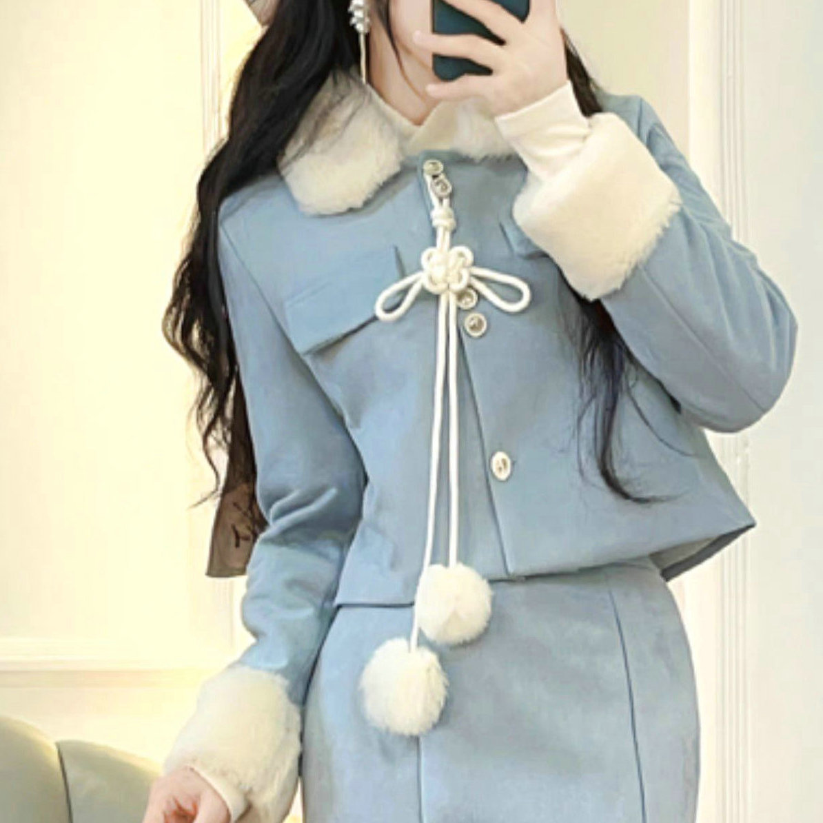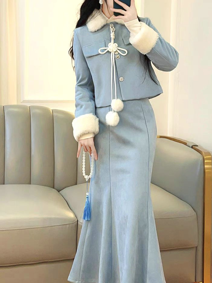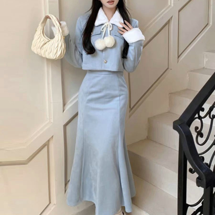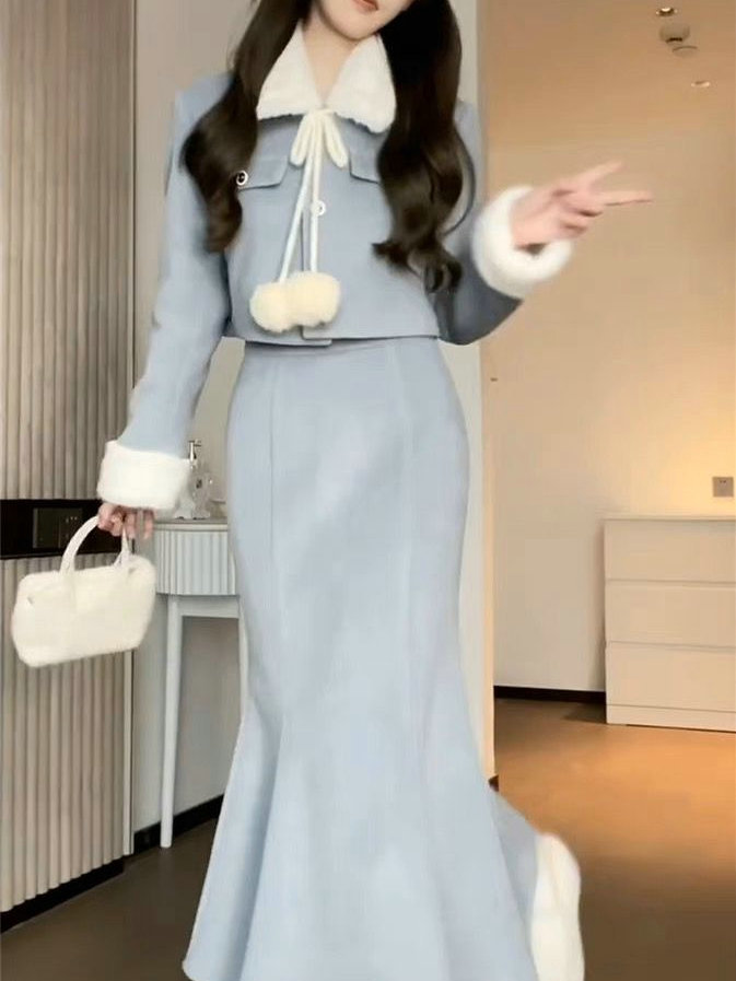 2024 가을과 겨울 작은 향기로운 스타일의 고급 세트 여성들은 두꺼운 피쉬 테일 긴 치마 세트를 착용합니다.스토어 가기
