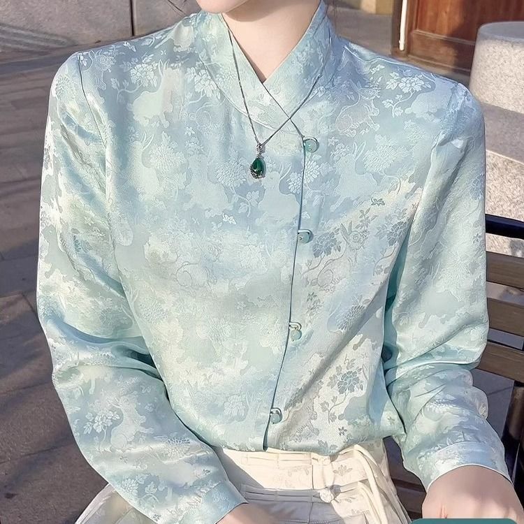 새로운 중국 스타일 착용 최고 여성의 2024 초기 가을 모방 뽕나무 실크 긴 소매 셔츠 국가 스타일 샤넬 스타일 셔츠스토어 가기