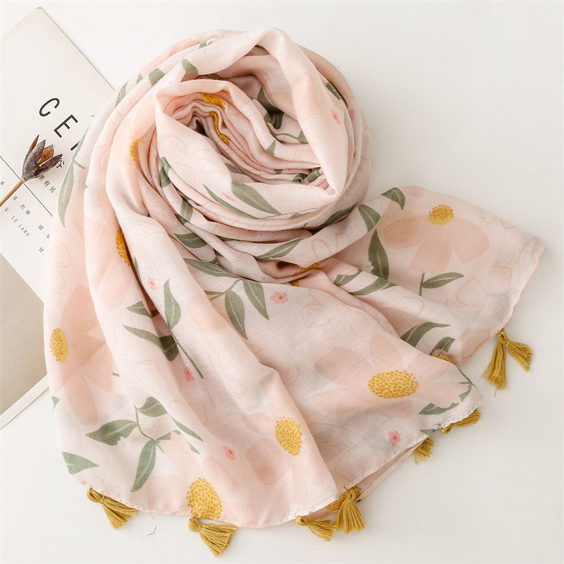 유럽과 미국 수출 프랑스 봄과 여름 새로운면 및 린넨 손 스카프 스노우 버드 식물 꽃 술 스카프 따뜻한 목도리