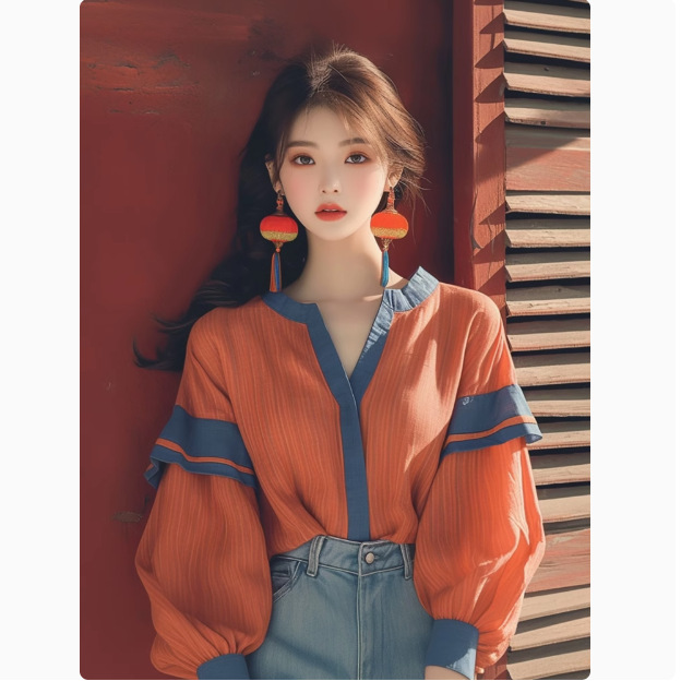 이른 가을 새로운 폭발성 탑 틈새 한국 스타일 서양식 느슨한 슬리밍 슈퍼 좋은 오렌지 스티칭 랜턴 슬리브 셔츠