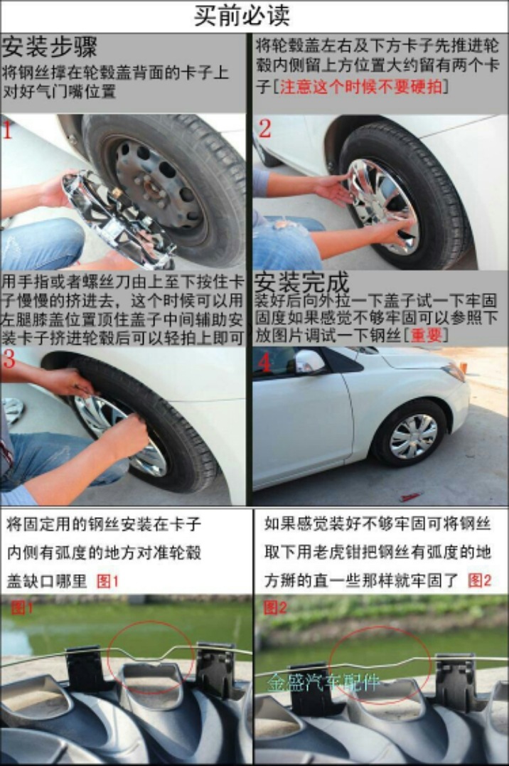 安装时请对好轮胎气门嘴位,卡扣需要一点点的卡进轮毂里面,如发现卡位太松,可适当调节钢丝卡子的大小。切不可暴力安装。如不会安装,请咨询卖家。