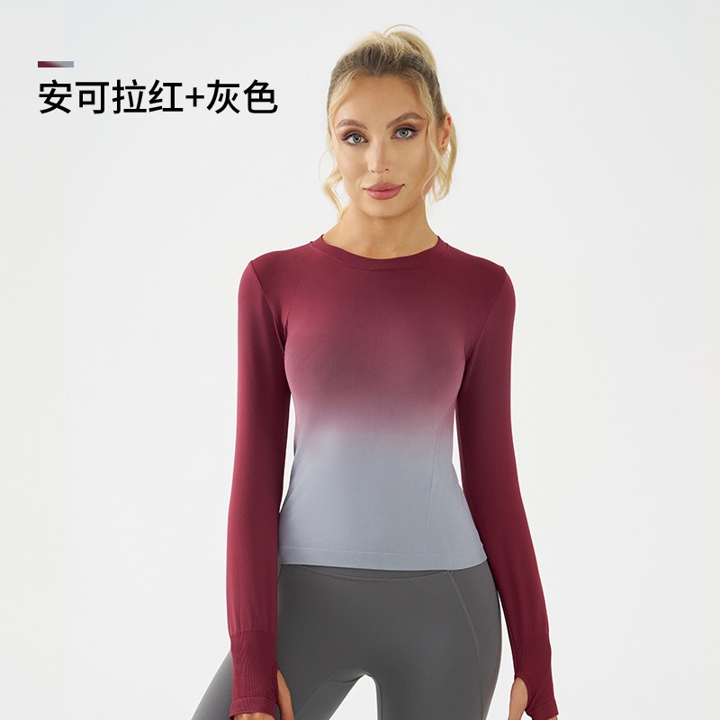 새로운 요가 옷 긴팔 그라디언트 빠른 건조 스포츠 피트니스 티셔츠 여성용 슬림핏 탑 타이트베이스 셔츠
