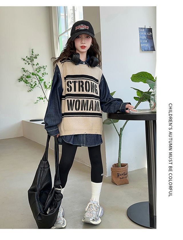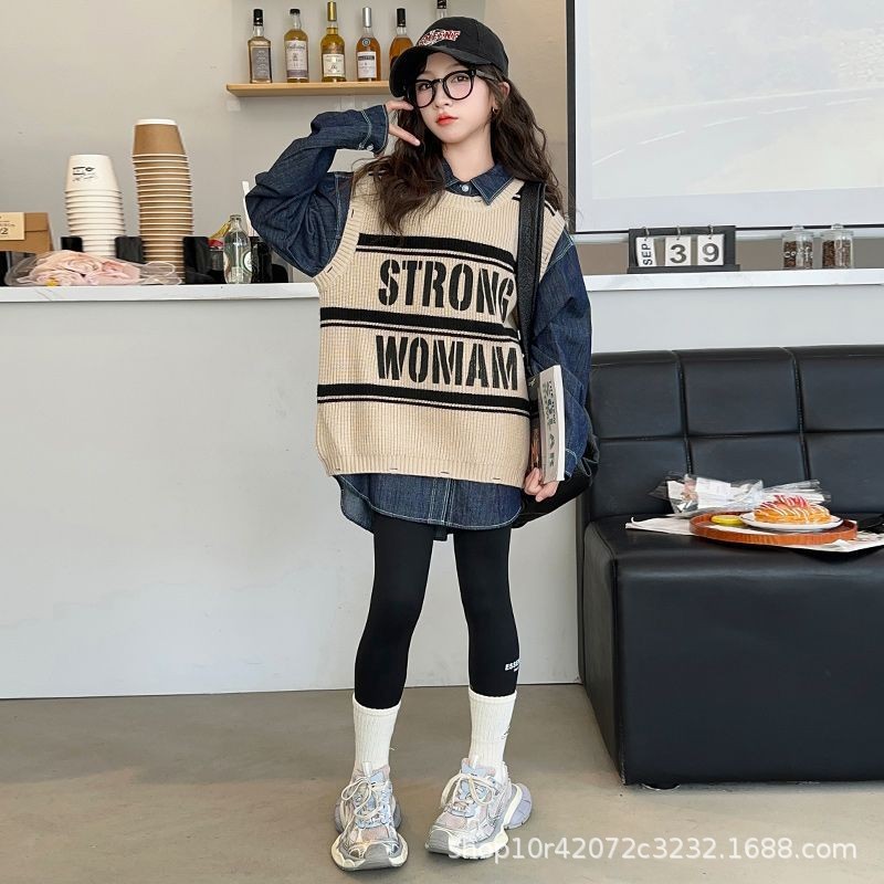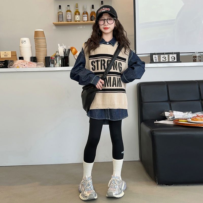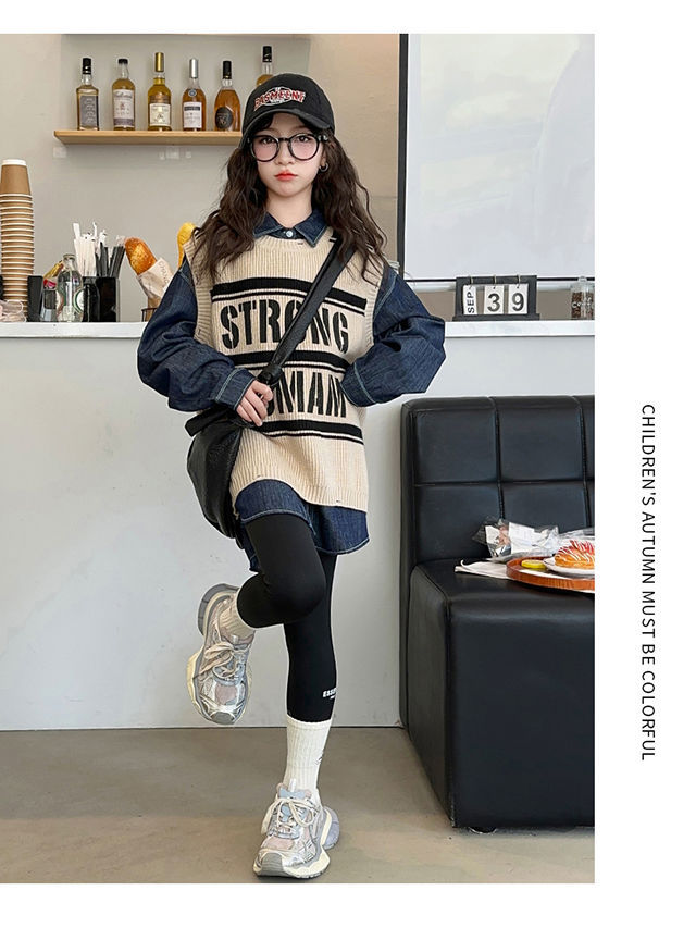 여아 가을 정장 2025 새로운 인터넷 연예인 여아 조끼 바닥 셔츠 3 피스 세트 큰 어린이 유행 가을 옷